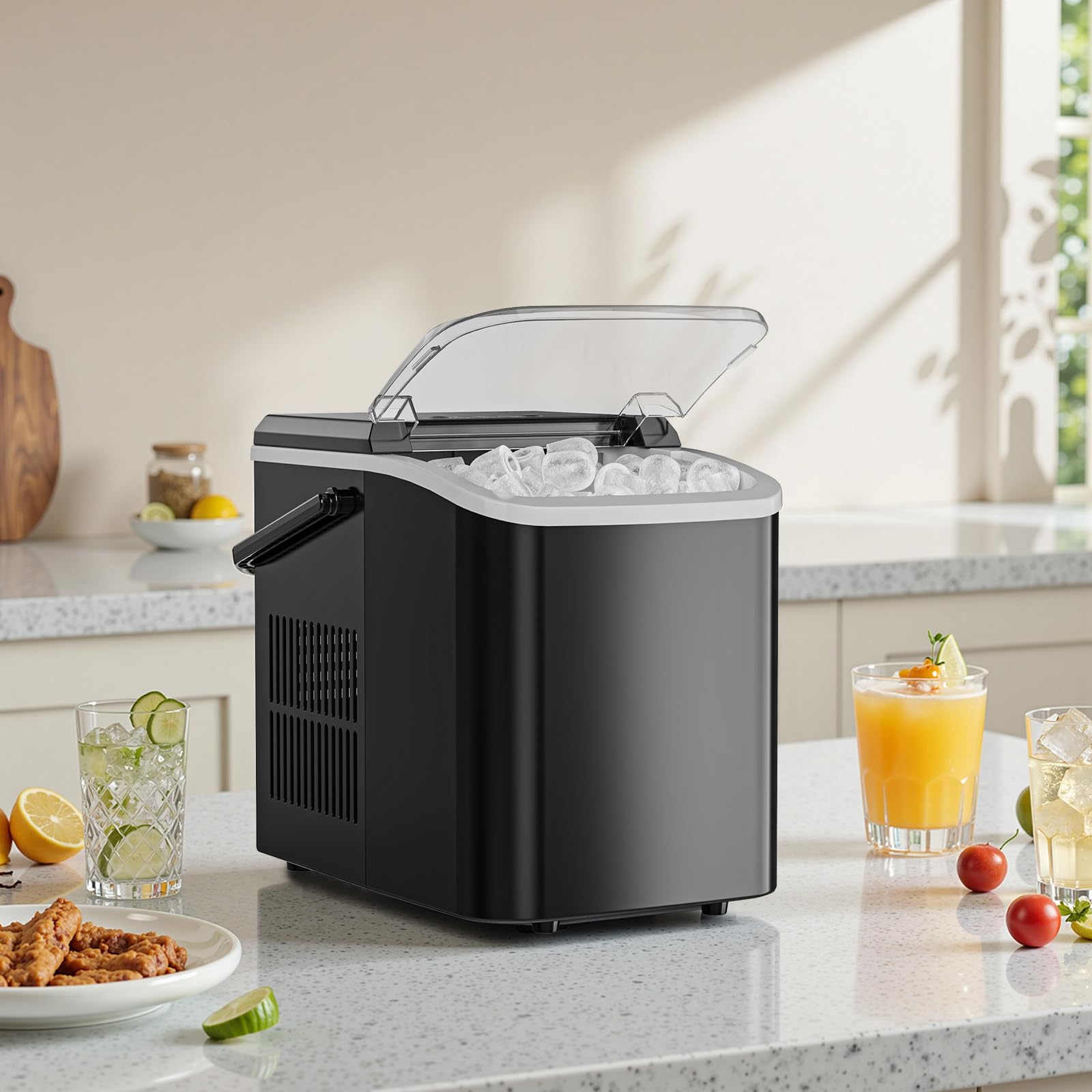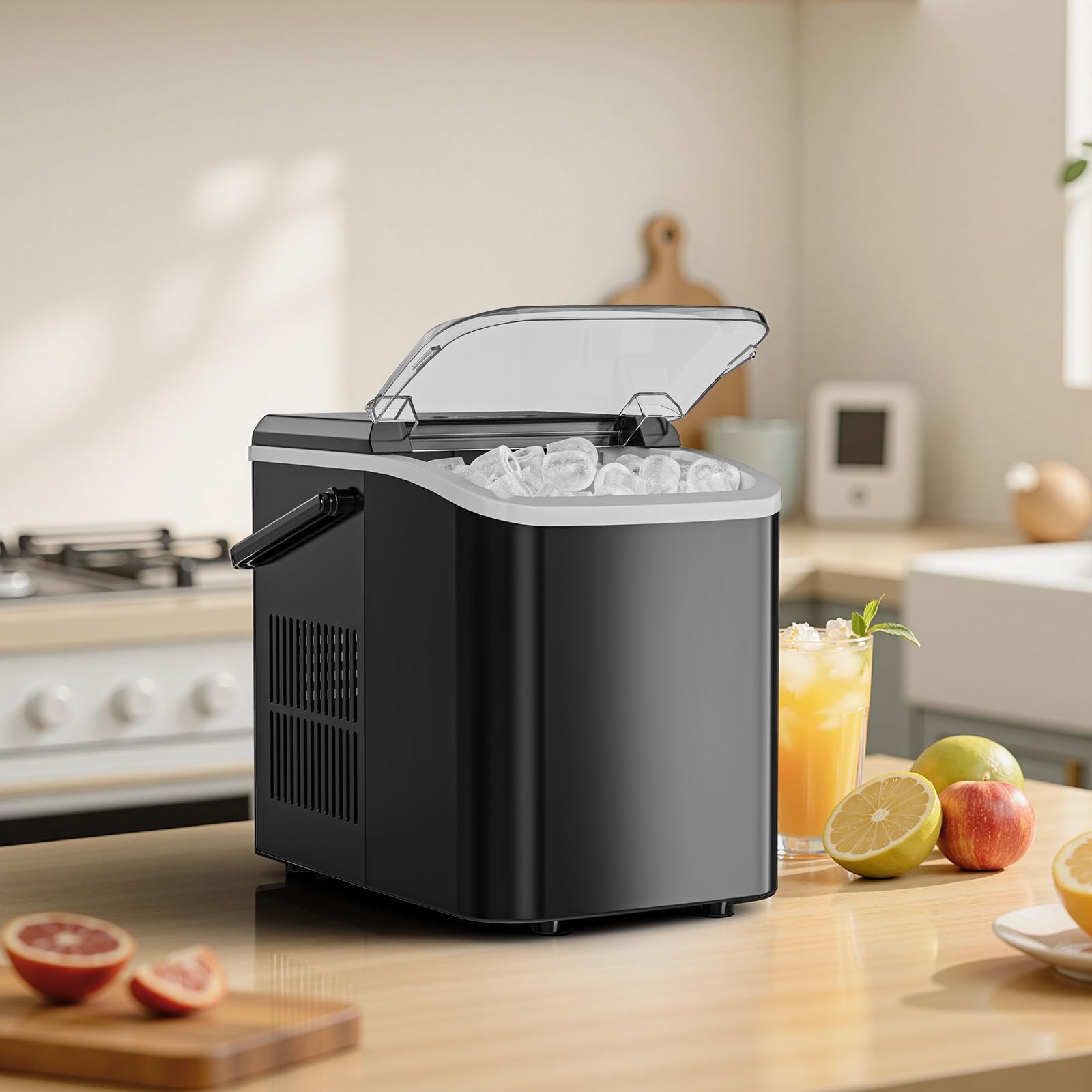 【FAST ICE MAKING】The ice maker can make 9 bullet-shaped ice cubes in just 6 minutes. Fill 1.5L of water into the water tank, maximum ice capacity can reach 26.5 pounds in 24 hours. Say goodbye to long waiting times and enjoy a constant supply of ice whenever you need it. It has a transparent window, so you can watch the ice being made.