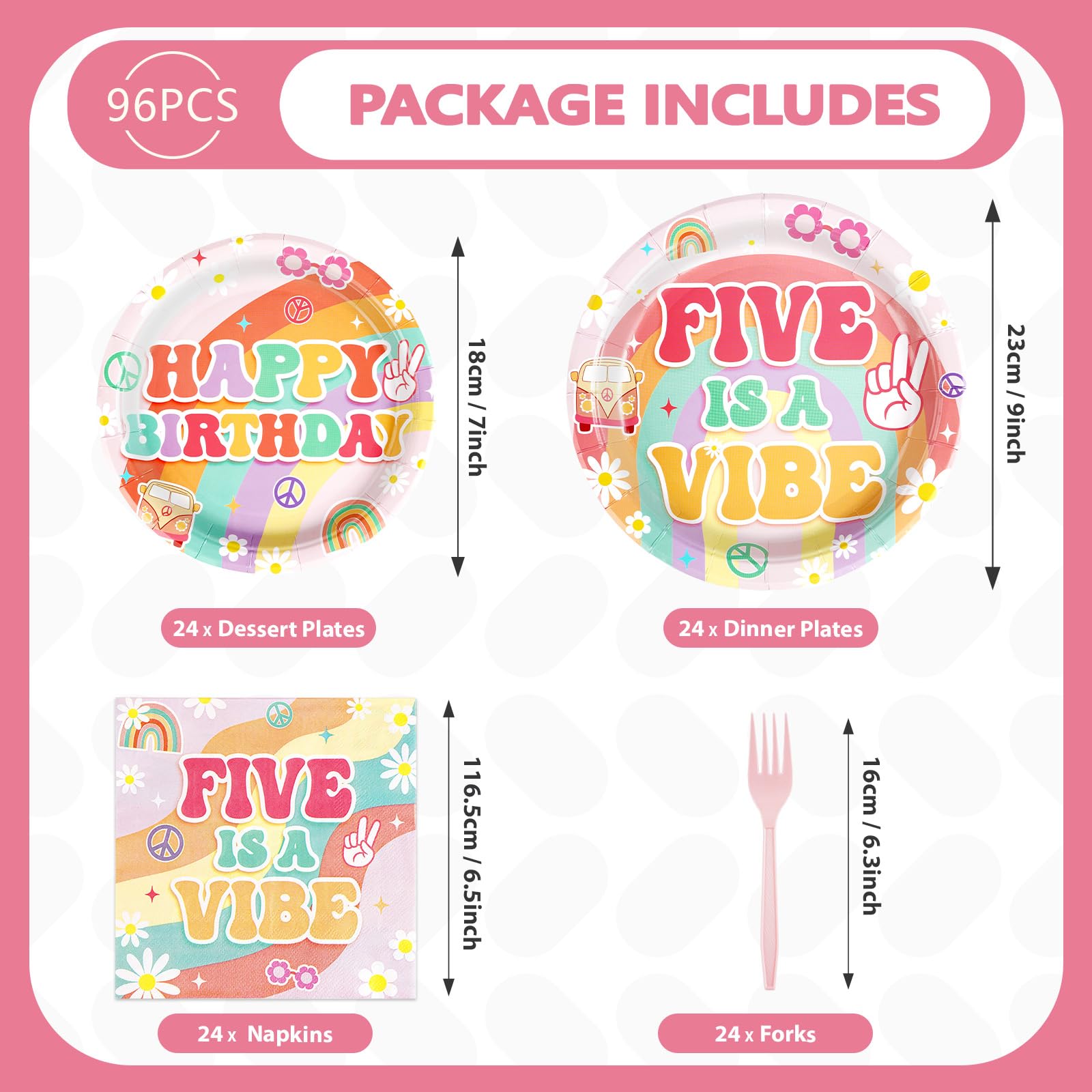 【Groovy 5th Party Decorations】Boho hippie party decorations flatware set includes 24pcs 9''groovy dinner plates, 24pcs 7'' groovy dessert plates, 24pcs groovy napkins, 24pcs disposable forks.There are a total of 96 pieces in this groovy boho plates and napkins set,everything you need to serve up to 24 guests in style.The 5 is a vibe birthday party decorations enough to hold a different and unique party!