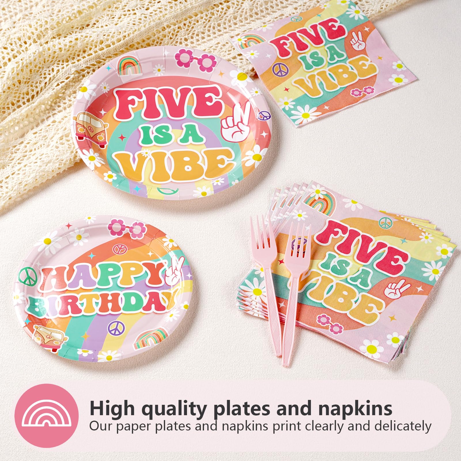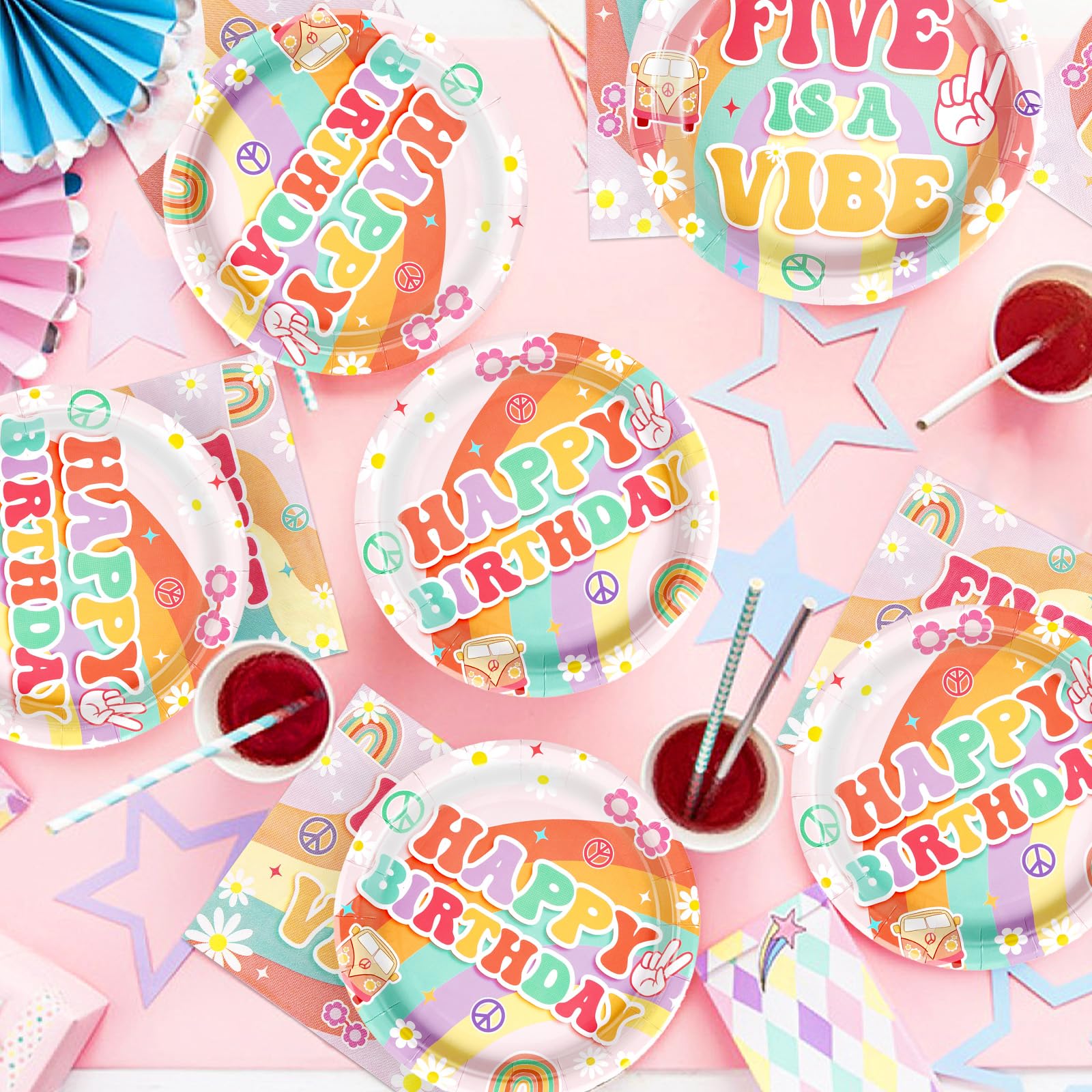 【Five is A Vibe Birthday Party Supplies】Our retro bohemian 5th birthday party decoration tableware features rainbow colors, retro bohemian hippie patterns, flowers, and star elements with the words "Five is A Vibe", making it a great decorative gift for a trendy 5th party that can fill your party with a festive atmosphere. This bohemian style decoration is perfect for your little sweetheart's birthday party, allowing you to have a great time and immerse yourself in funky