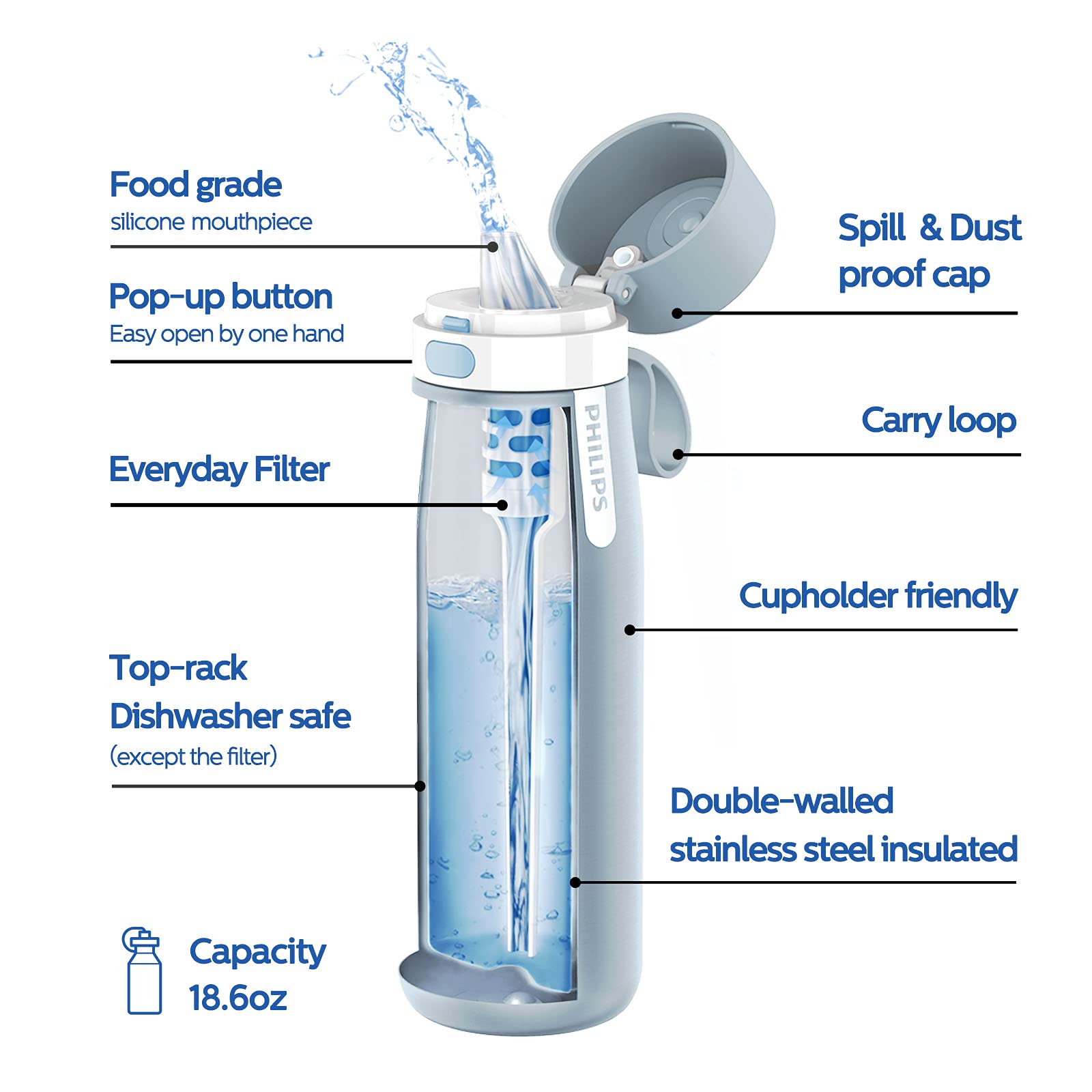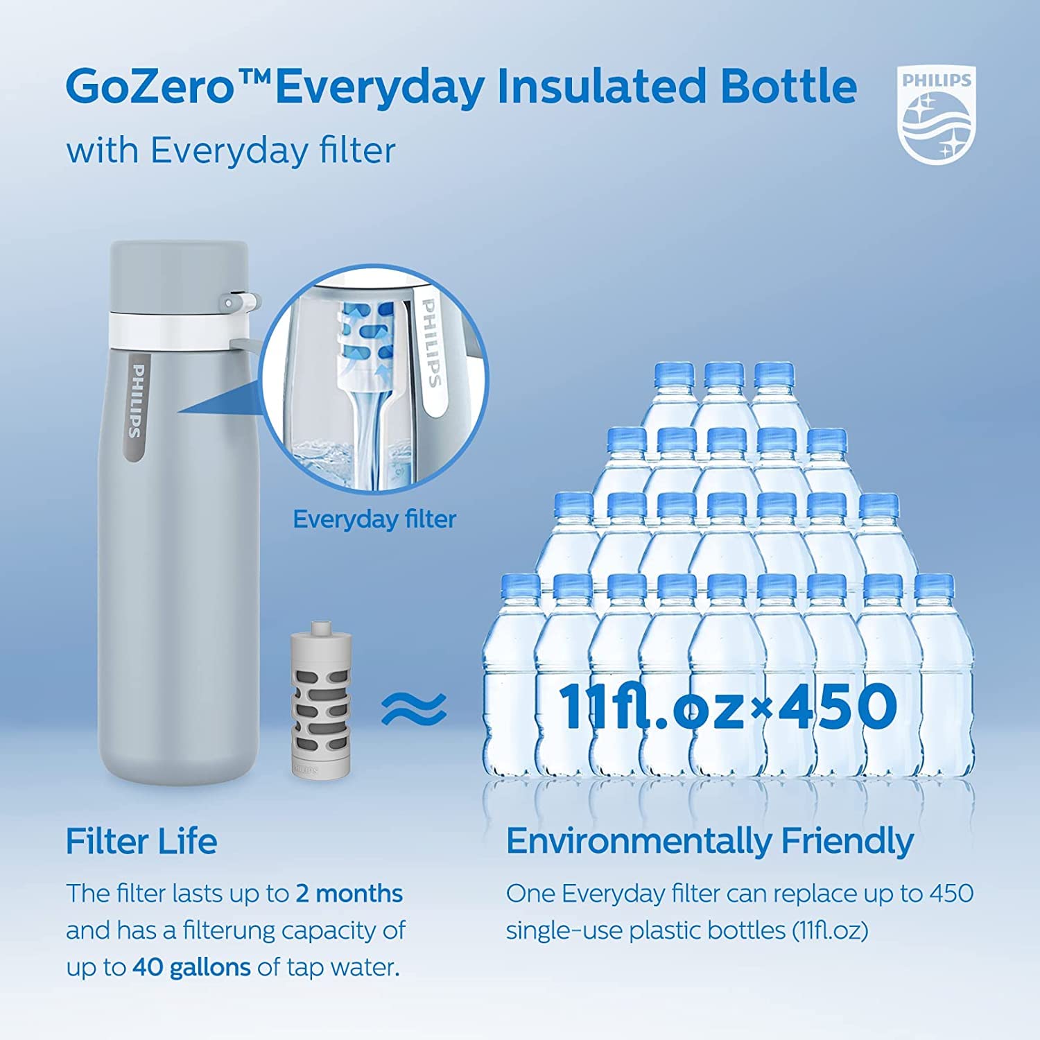 ★ 𝟑 𝐅𝐢𝐥𝐭𝐞𝐫𝐬 𝐏𝐚𝐜𝐤: This package includes an 18.6 oz stainless steel Philips Everyday Bottle and three GoZero Everyday Filters, ensuring cleaner, tastier tap water for longer use.