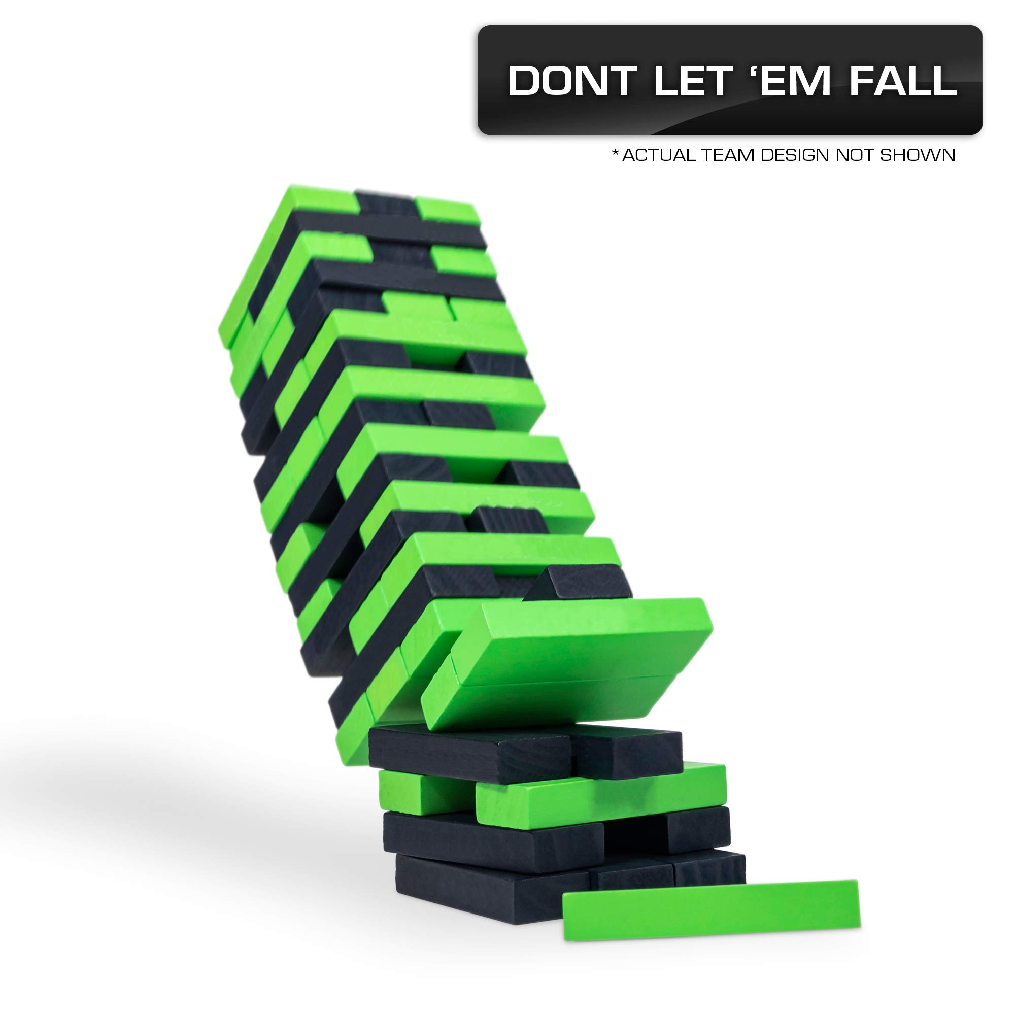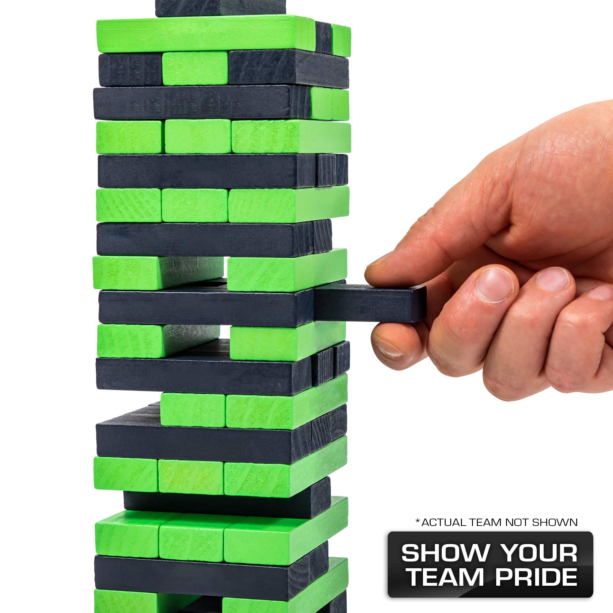 A CLASSIC JENGA GAME, IN YOUR FAVORITE NCAA TEAMS - A wooden block game that challenges players to push and pull stacking blocks from the tower and strategically place them back on top. Last player standing without knocking the tower down, WINS.