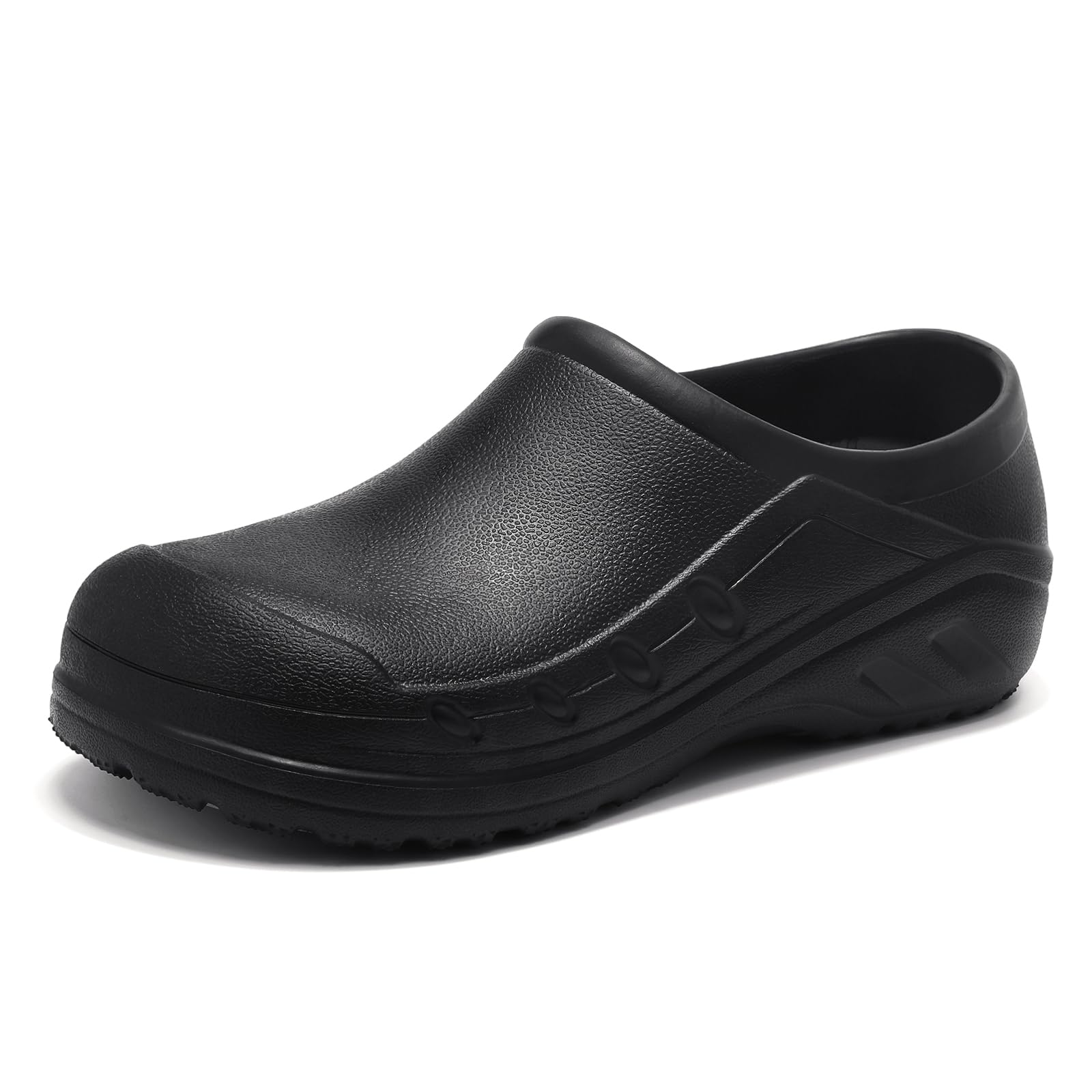 THE PERFECT BLACK WORK CLOGS - With unisex styling, these work clogs in uniform friendly black are ideal for men or women who are on their feet all day and night, need strong slip resistance, and prefer an easy slip-on style.