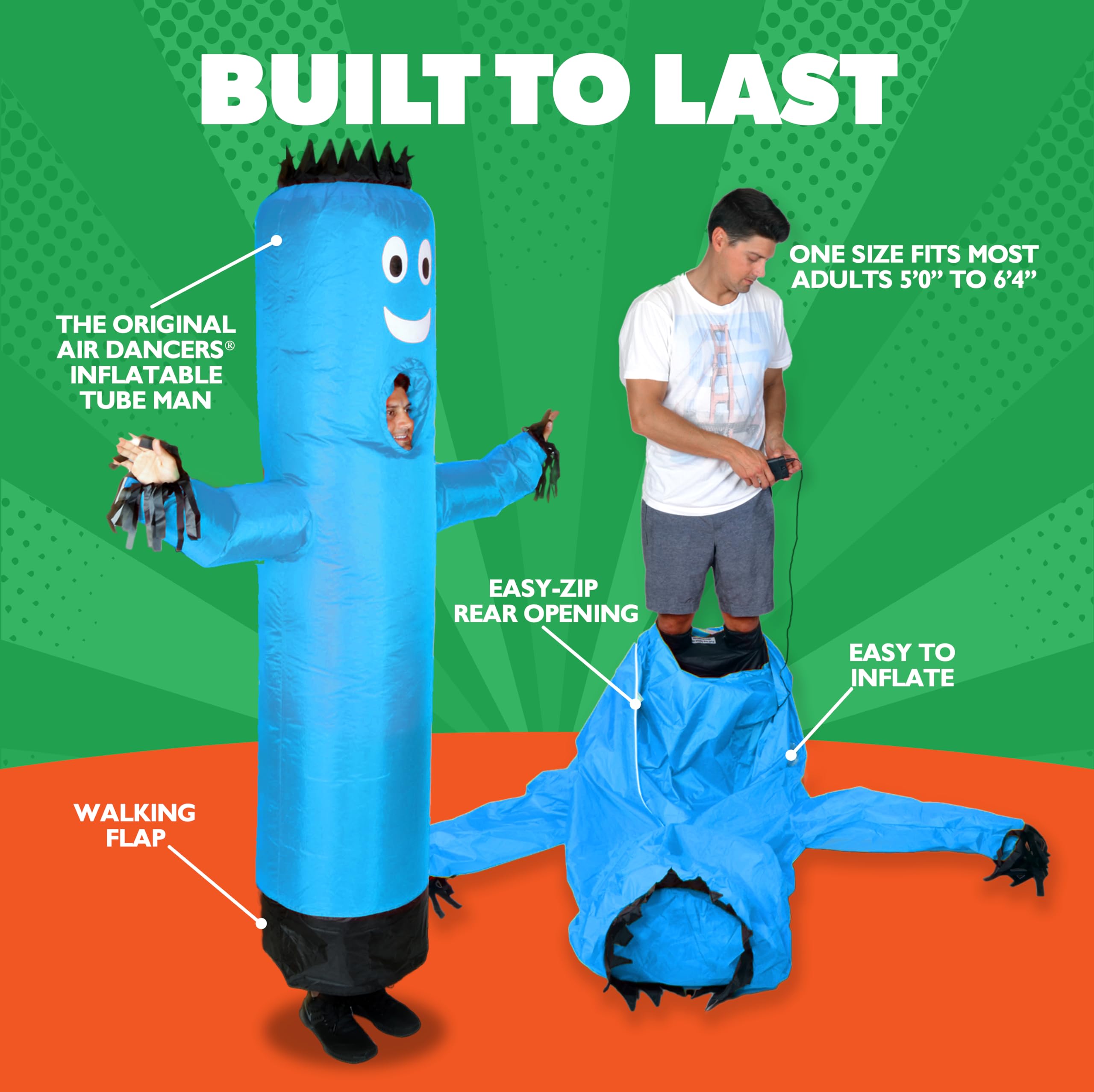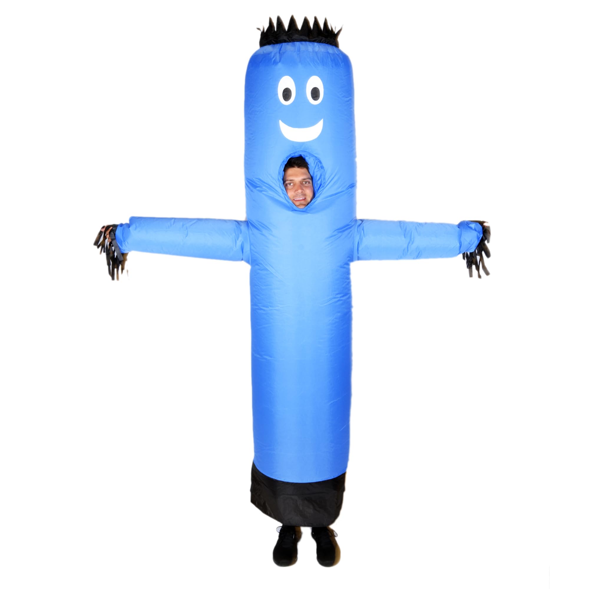 Description Get ready to be the life of the party with the LookOurWay Air Dancers Wacky Inflatable Tube Man Costume! This hilarious inflatable tube man costume is a wearable version of the iconic Air Dancers inflatable tube guy, making it the ultimate inflatable Halloween costume for adults. Perfectly designed to replicate the original wavy arm guy, this wacky inflatable tube man costume features the instantly recognizable face, wild flailing arms, and vibrant color thatβs sure to grab attention at any event. Easy to wear and inflate, this inflatable tube guy costume comes with an integrated blower and battery pack, fitting most adults comfortably. Whether youβre 5'0" or 6'4", youβll have no trouble dancing, waving, and flailing your arms all night long. With superior design and comfort, this wavy arm guy costume allows your face and hands to be outside the costume, making it easier to breathe, move, and have fun.