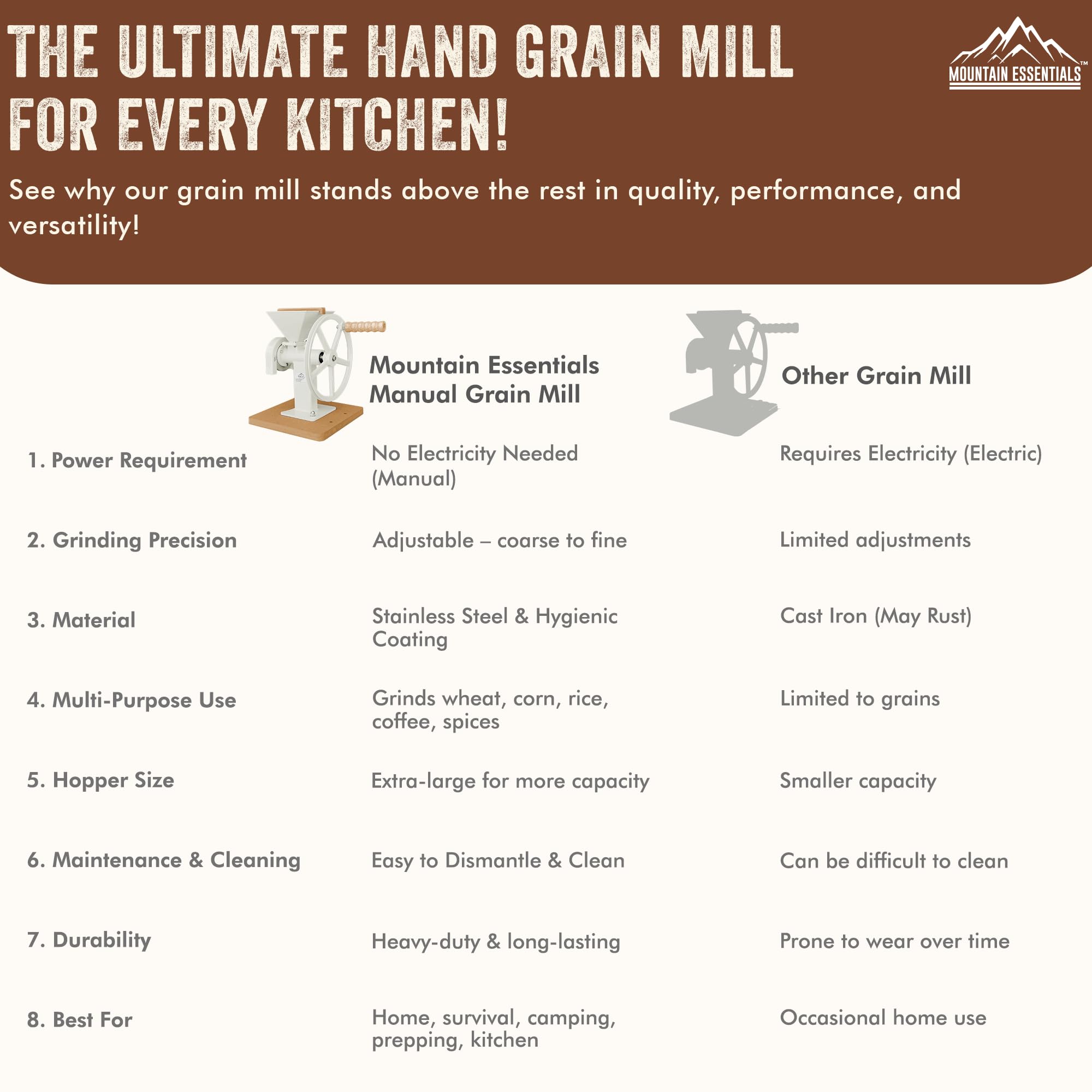 MULTIPURPOSE GRAIN GRINDER MILL – Hand crank grind mill applicable to all kinds of dried materials, including grains, soy, barley, rice, mung beans), spices grinder (star anise, fennel, pepper, rosemary) ,herbs ,sesame, peanuts, walnuts, wheat grinder for flour, dry corn grinder, coffee bean grinder. Not suitable for wet, fresh, oily and other sticky materials.