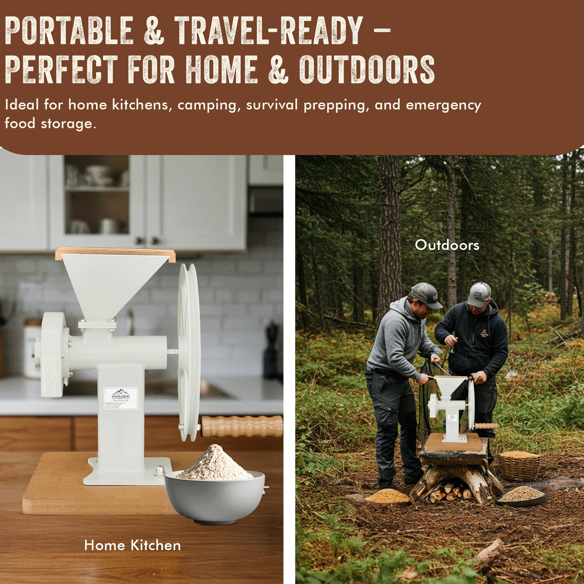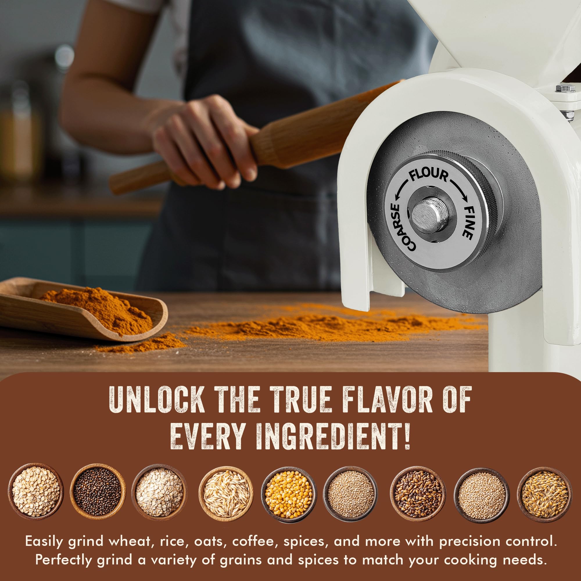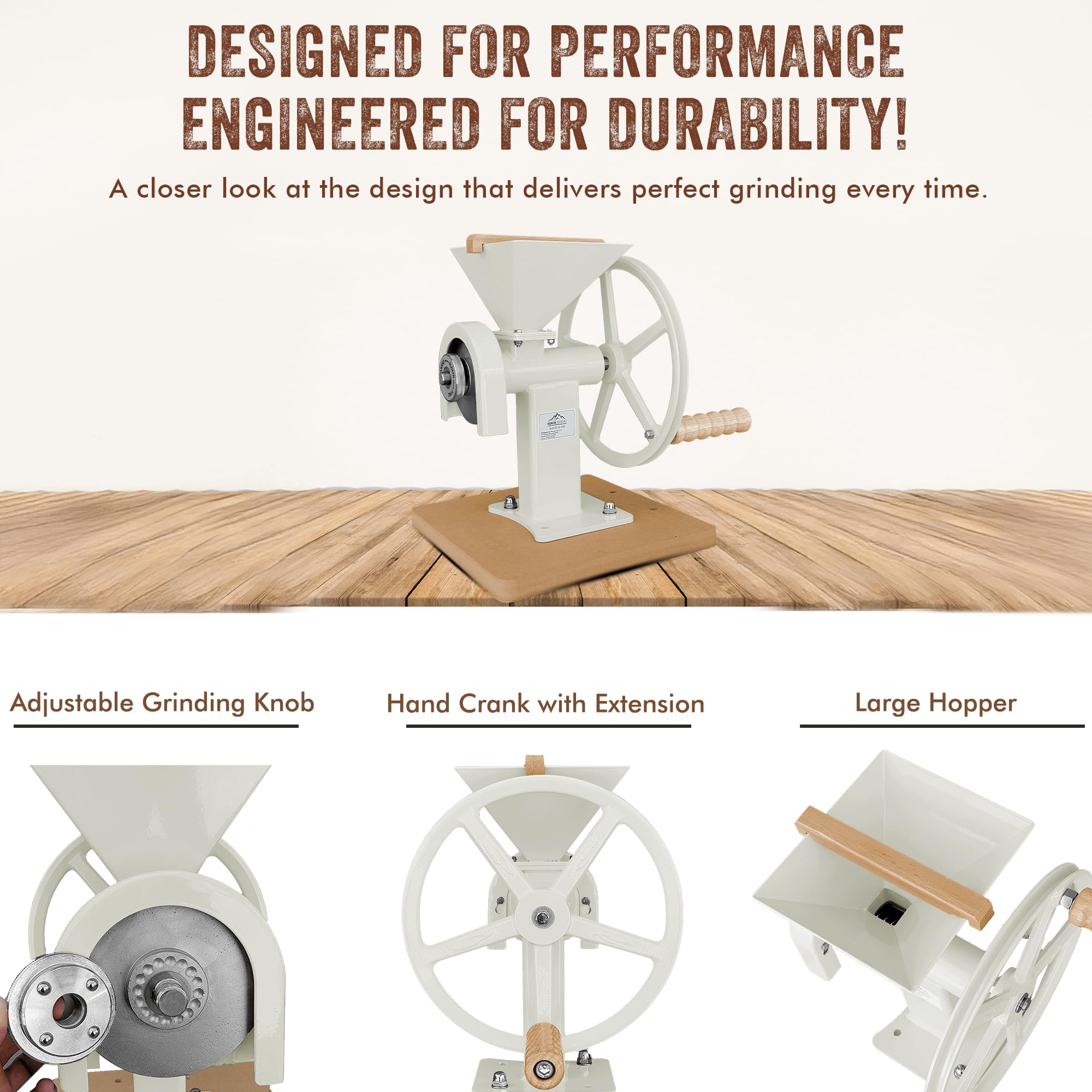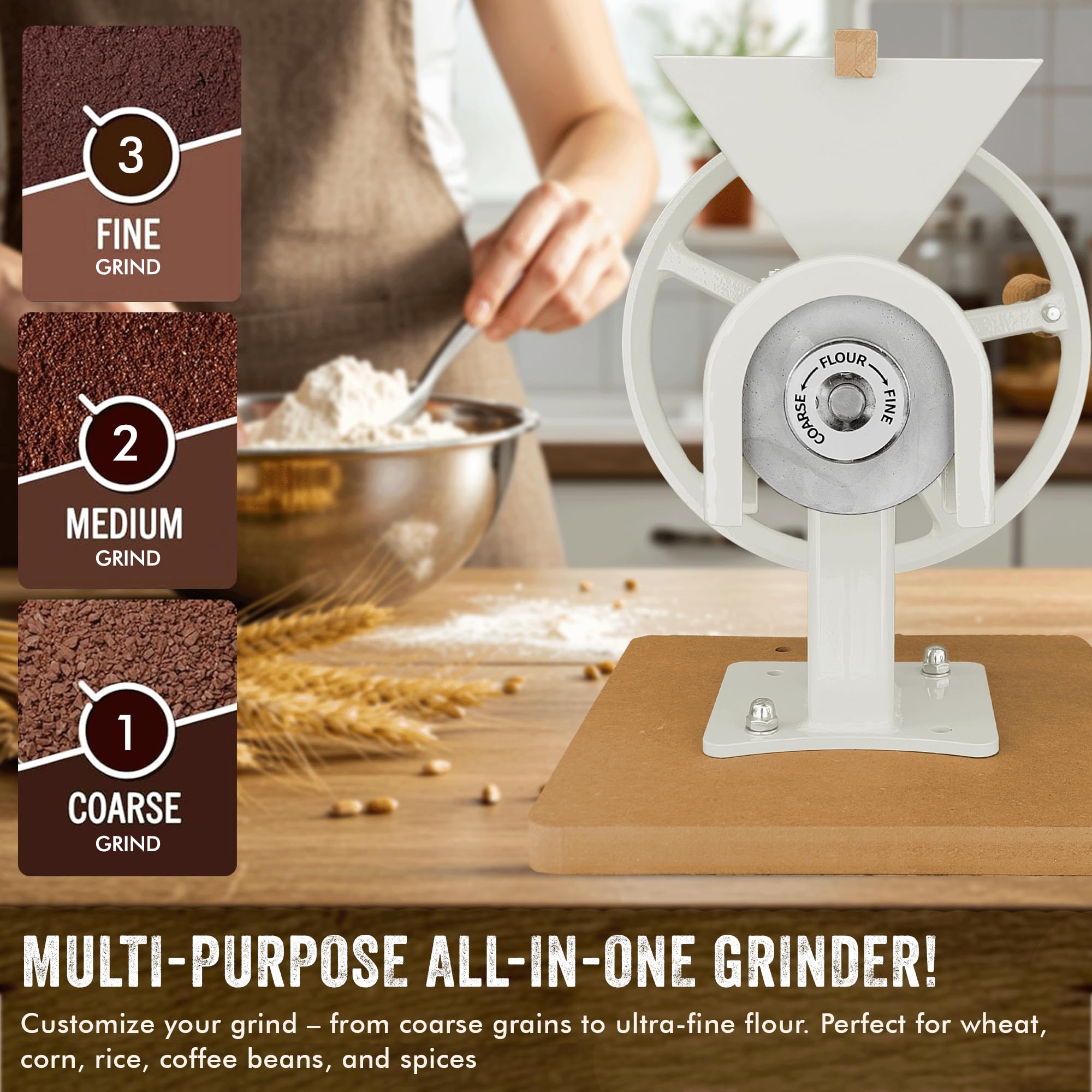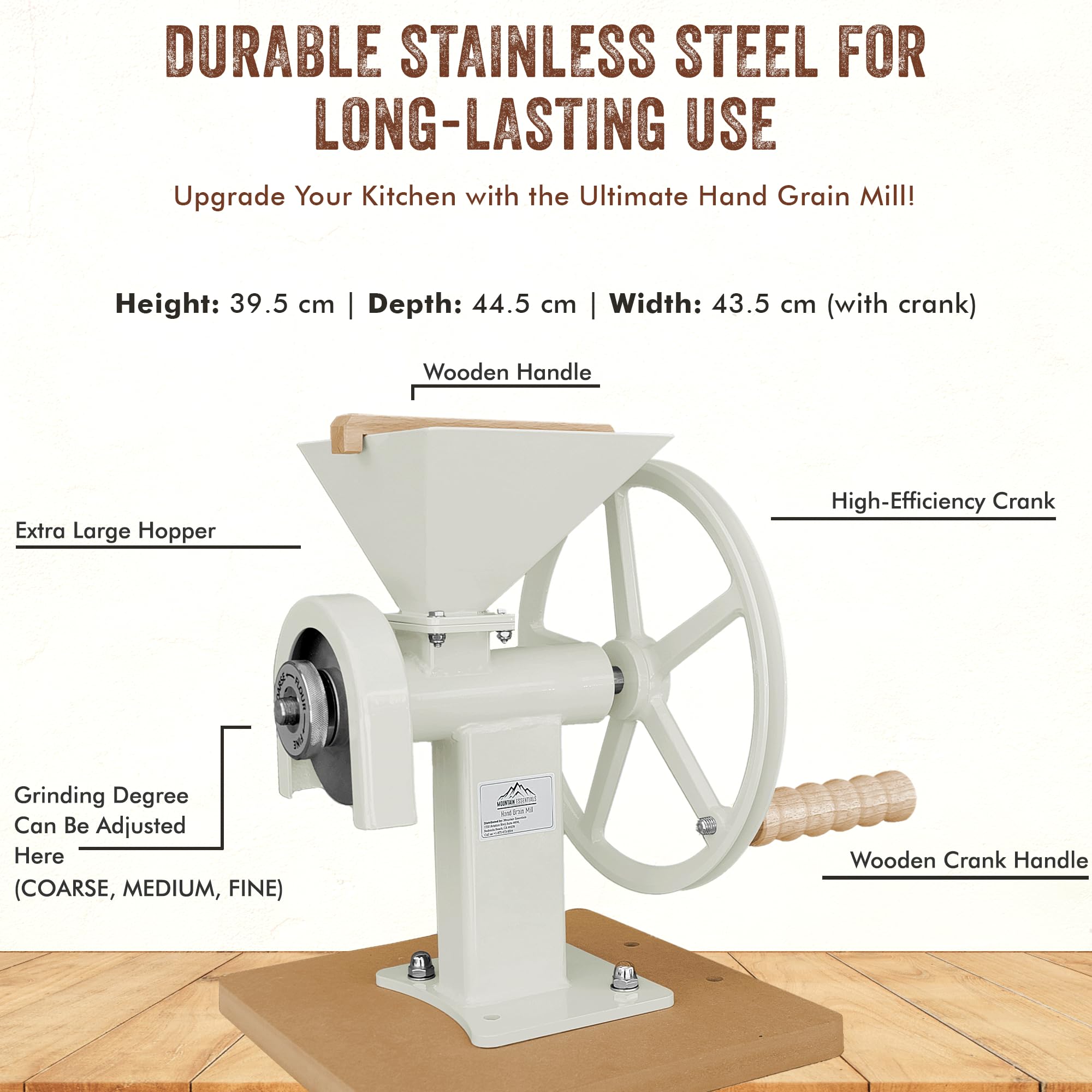 ADJUSTABLE - The grinding degree can be adjusted so generously that even grist such as green kernel meal can be produced. Coffee beans and spices can be processed perfectly via the fine adjustment. The large flywheel with hand crank drives the mill with ease, so it can be easy to produce your own flour without using any electricity. Great for home kitchen or commercial use.