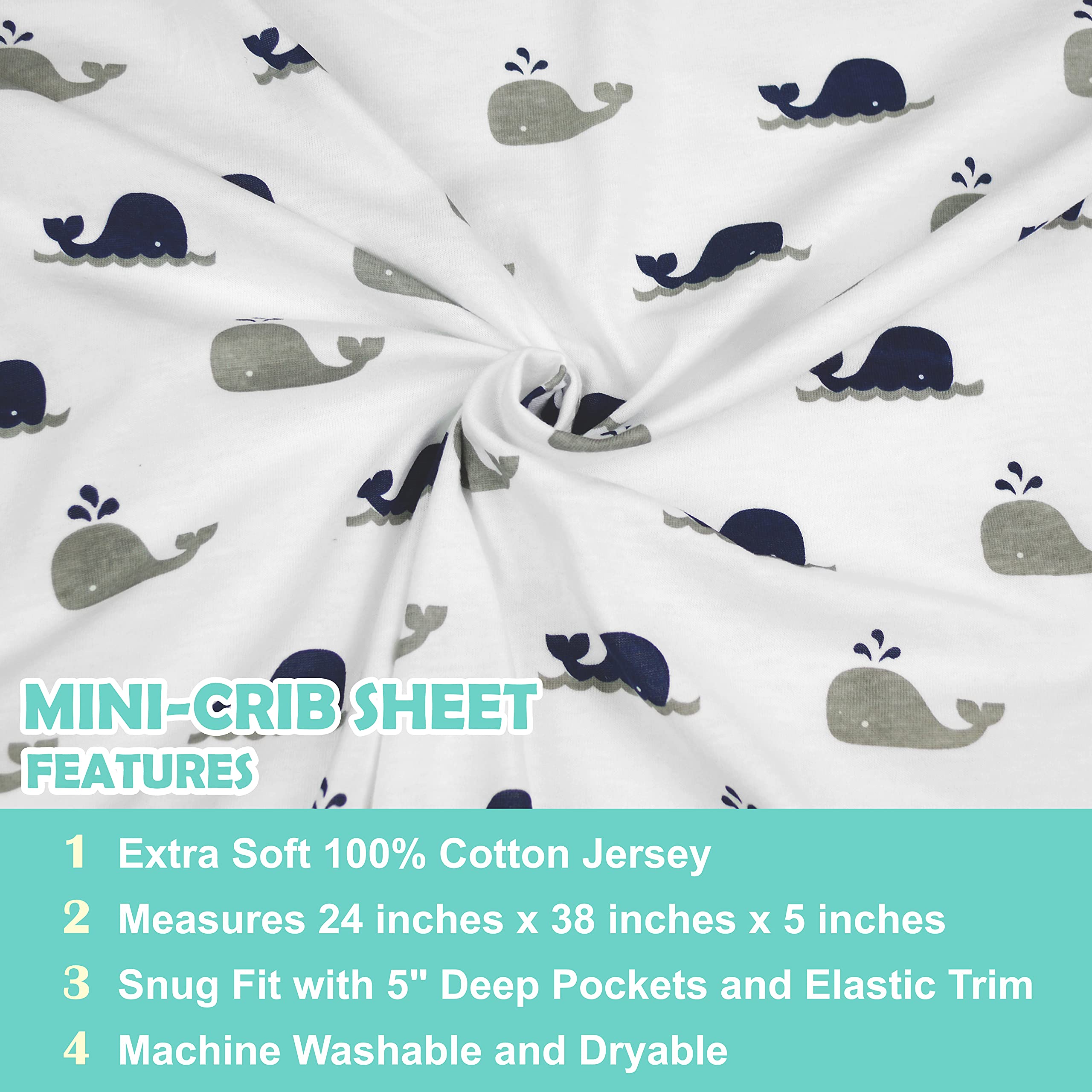 Perfect Fit & Secure Coverage: Made from 100% Cotton Jersey and measuring 24” x 38” with a depth of 5 inches, our mini crib sheets snugly fit most standard pack and play mattresses and mini crib mattresses