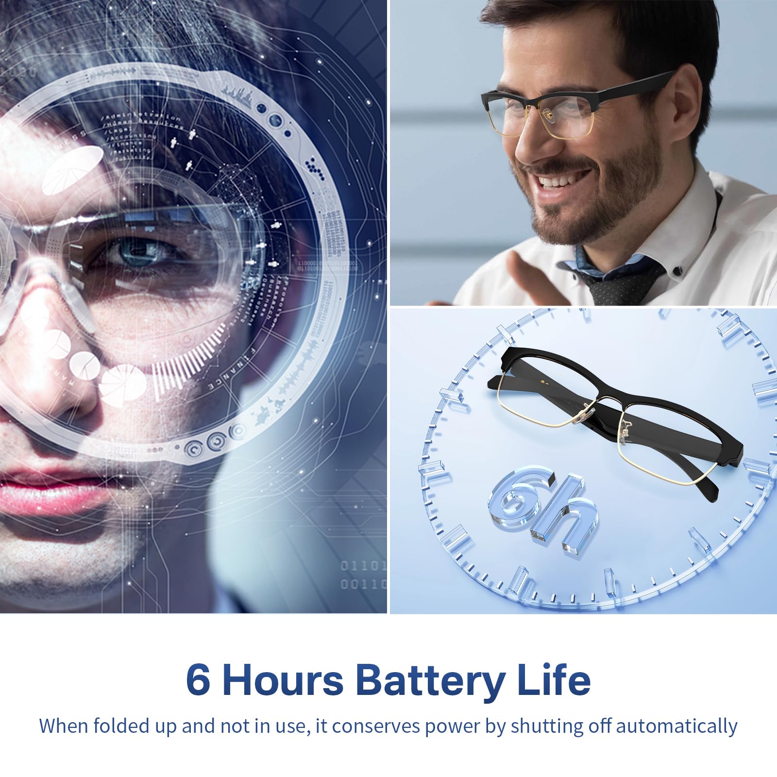 All-day Battery: Our eye glasses built-in 100mah battery,fully charged in 1 hour can support 6 hours of playback, 7 days standby time.