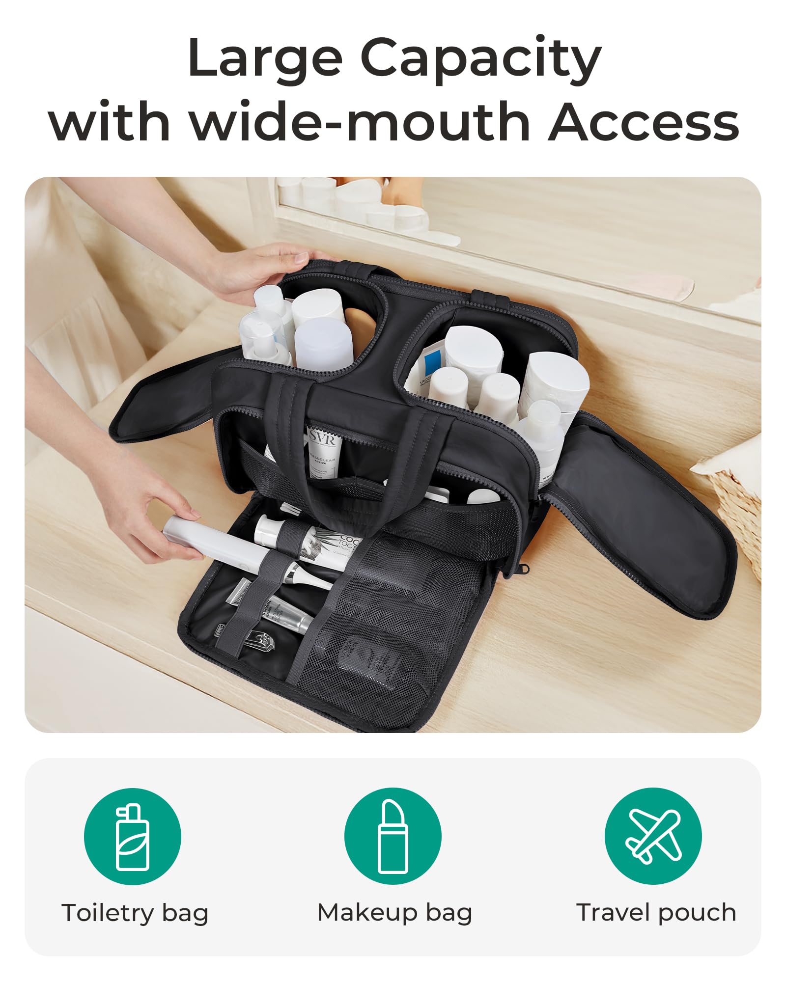 Easy Access and Keep Upright : Full opening and not piling up for easy access to items. Double side full open design of travel bag keeps cosmetic bottles and toiletries can stand upright in the middle compartment. Avoid leakage during transit