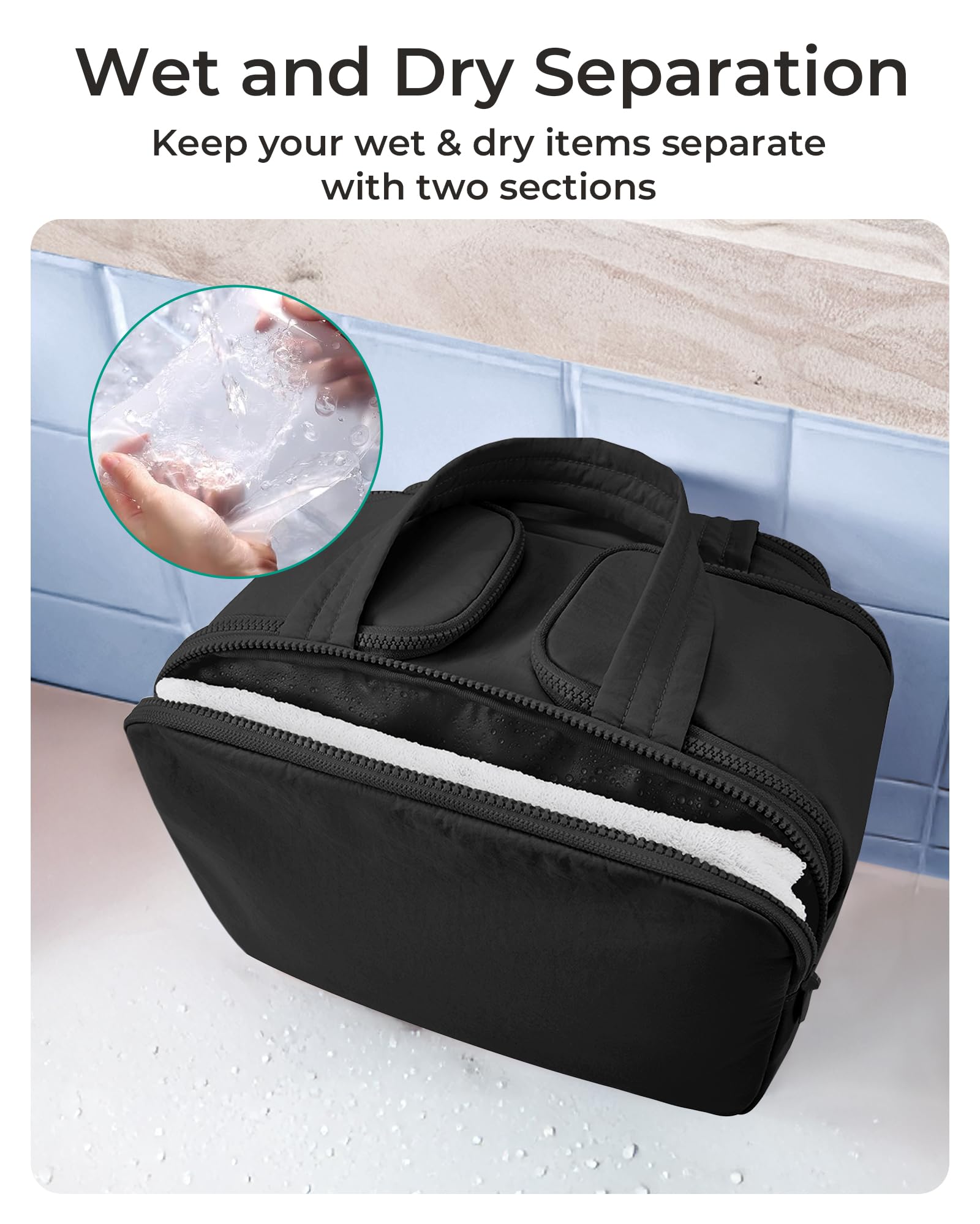 Dry-and-Wet Separation: The large toiletry bag with a waterproof PVC fabric and a front zipper pocket can help keep wet and dry items separate and make it easy to clean