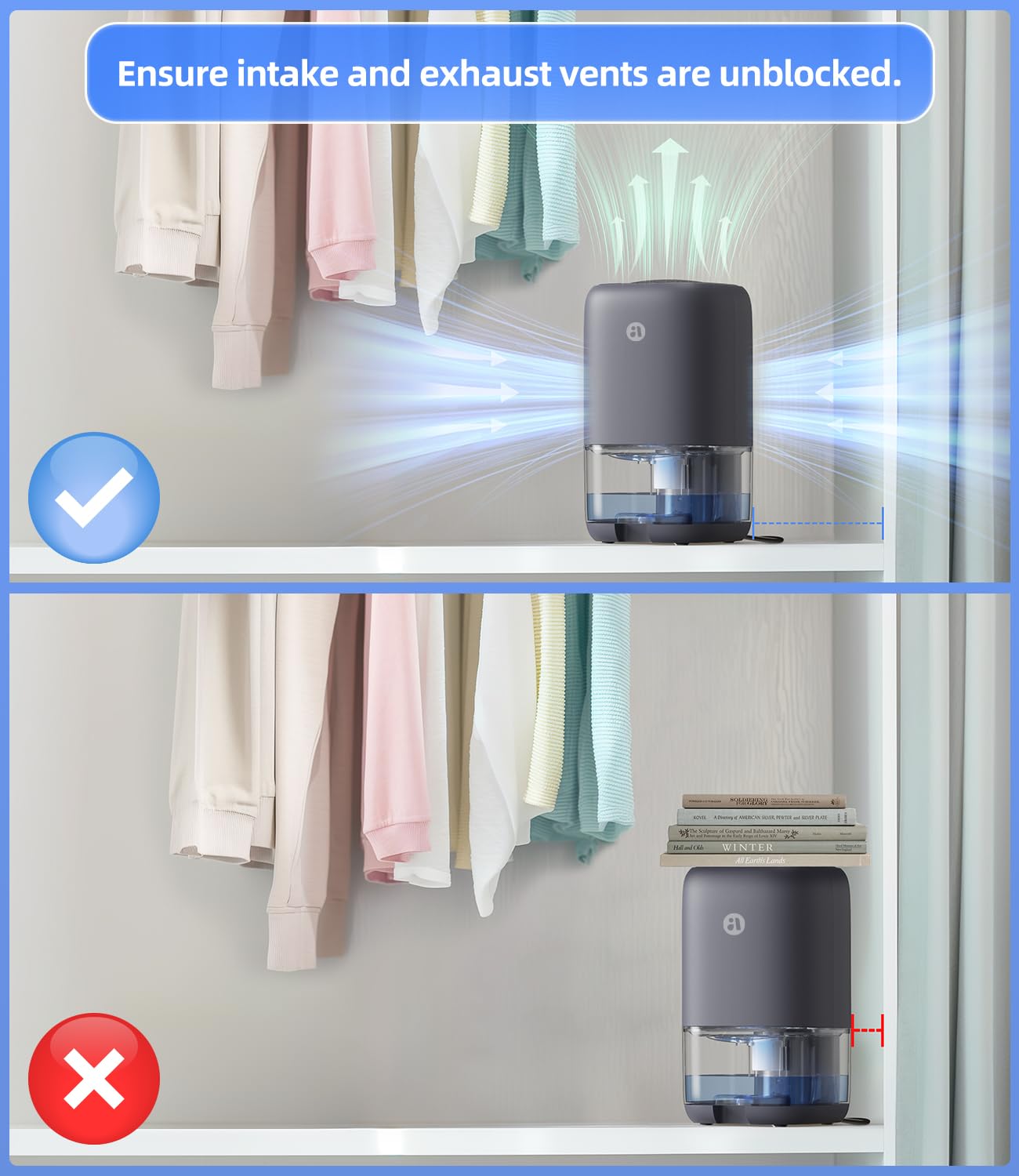 Important usage tips: Please do not block the air inlet at the top of the dehumidifier and the air outlet at the back. Packaging has been upgraded.