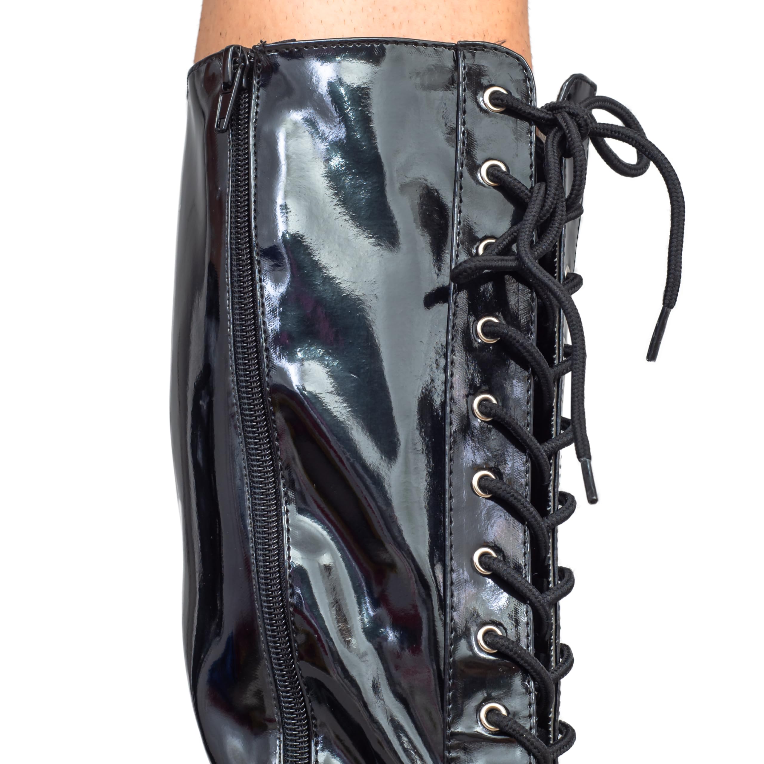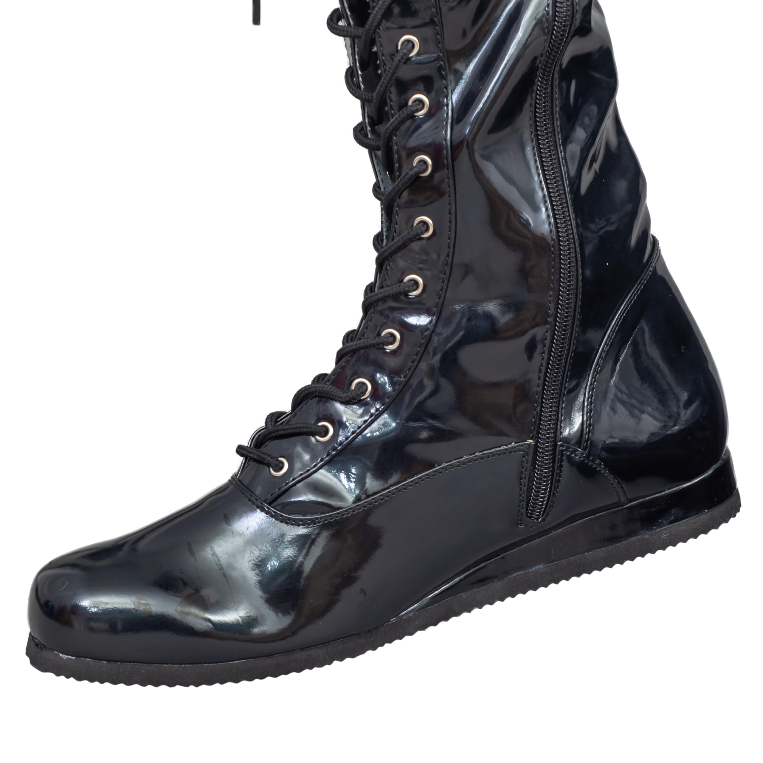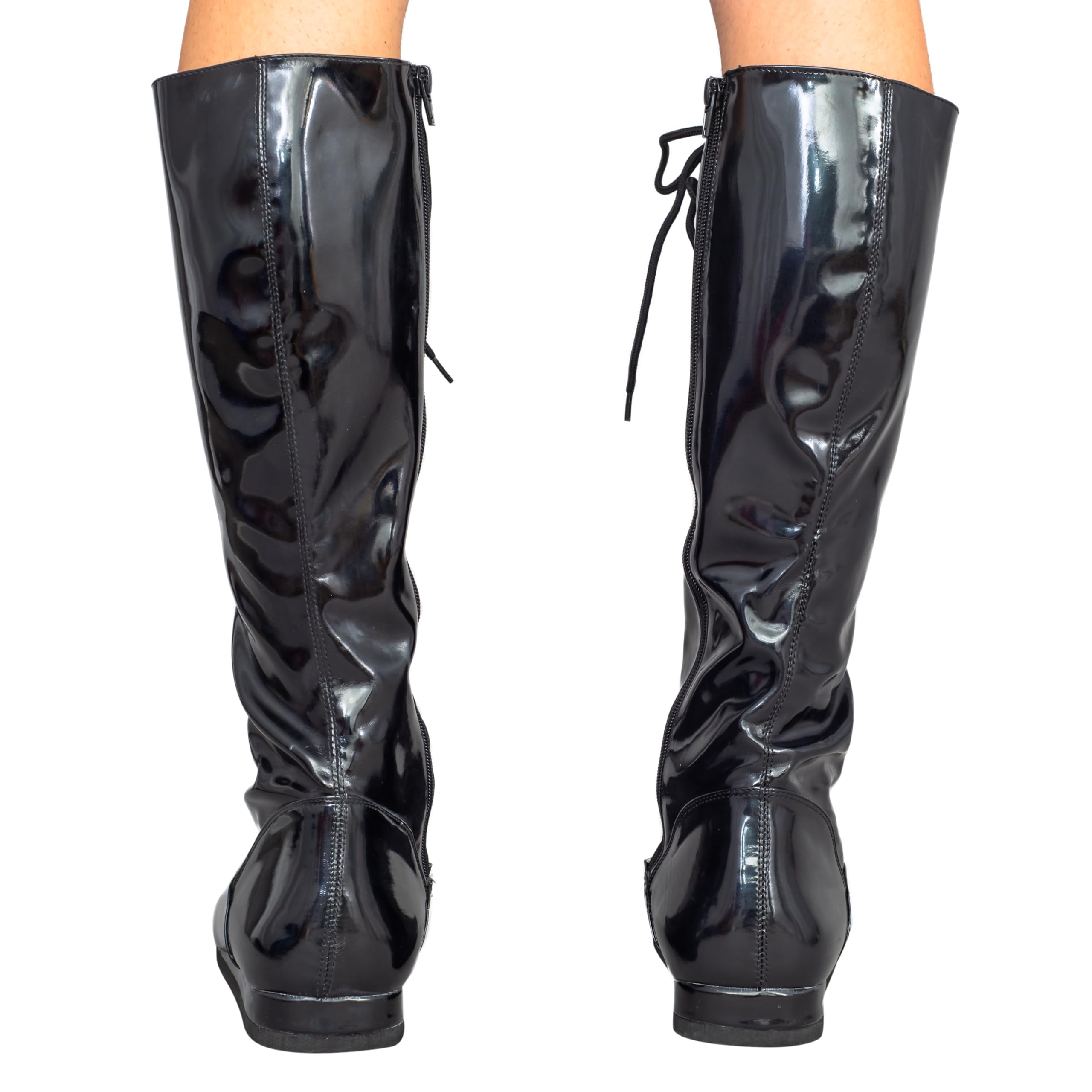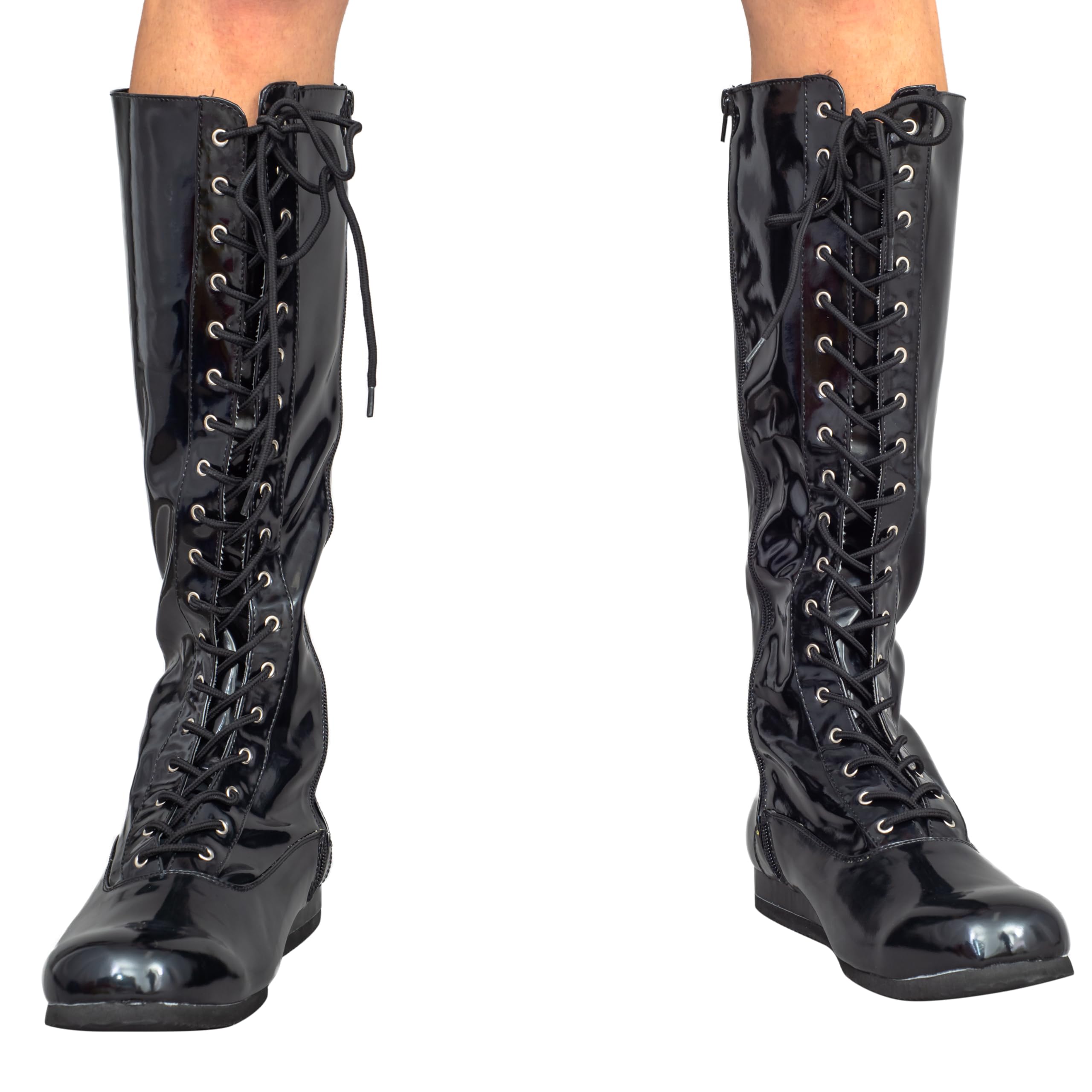 Vinyl drawstring and zipper unisex superhero and pro wrestling boots are available in sizes 8 to 14; available in black, blue, red, and white colors