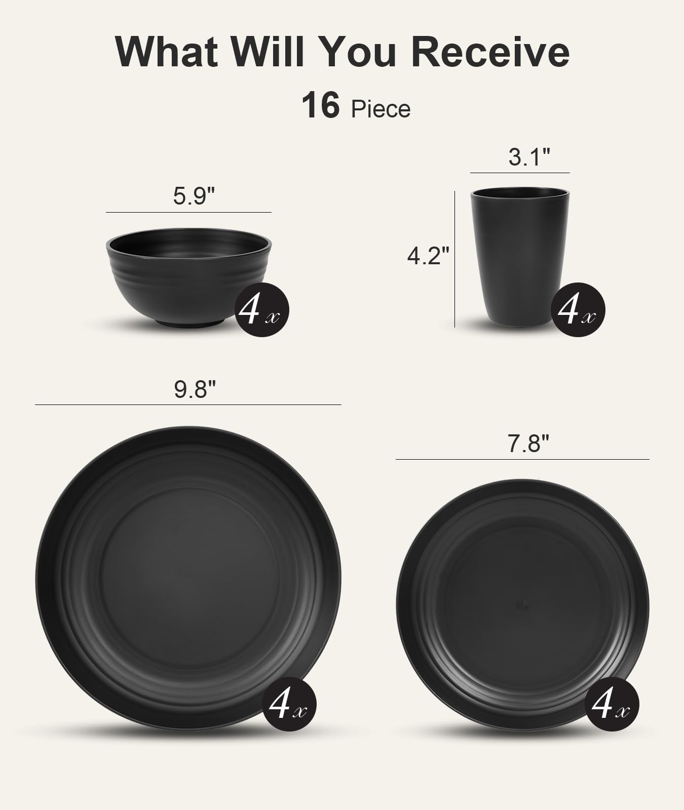 16 Piece Dinnerware Set, Service for 4: Includes 4 round dinner plates, 4 Salad plates, 4 bowls and 4 cups. With a lightweight design, perfect for creating an elegant tabletop presentation