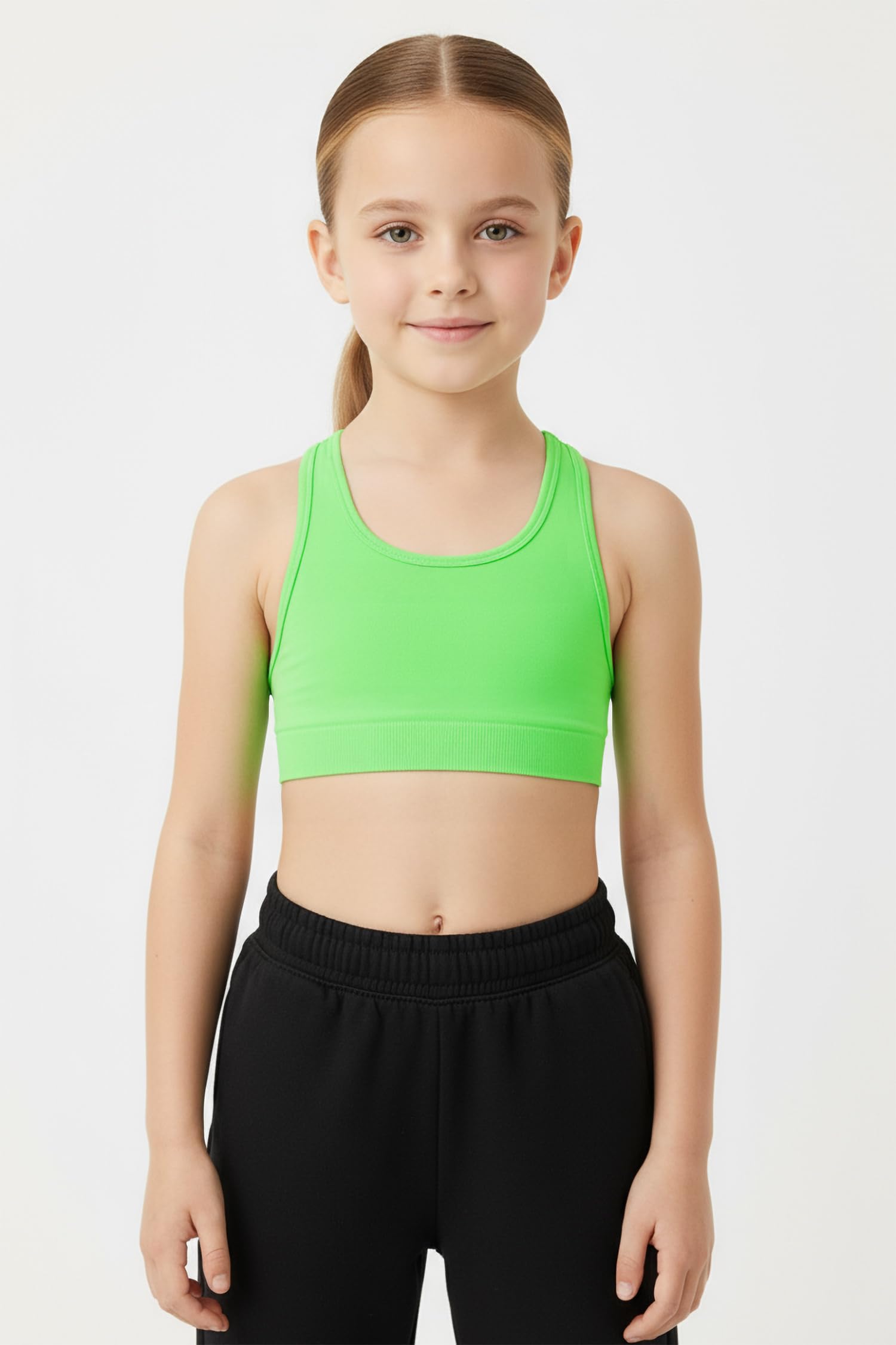 This athletic top is a seamless training bra that provides gentle support and coverage without any adjustable straps. The bra has a seamless construction that eliminates irritation or discomfort, and fits snugly and comfortably against the body, allowing young girls to move freely during their activities. The outfit's moisture-wicking capabilities keep kids sweat-free and dry during exercise, making it a perfect choice for active children who want to stay comfortable and cool while they play.
