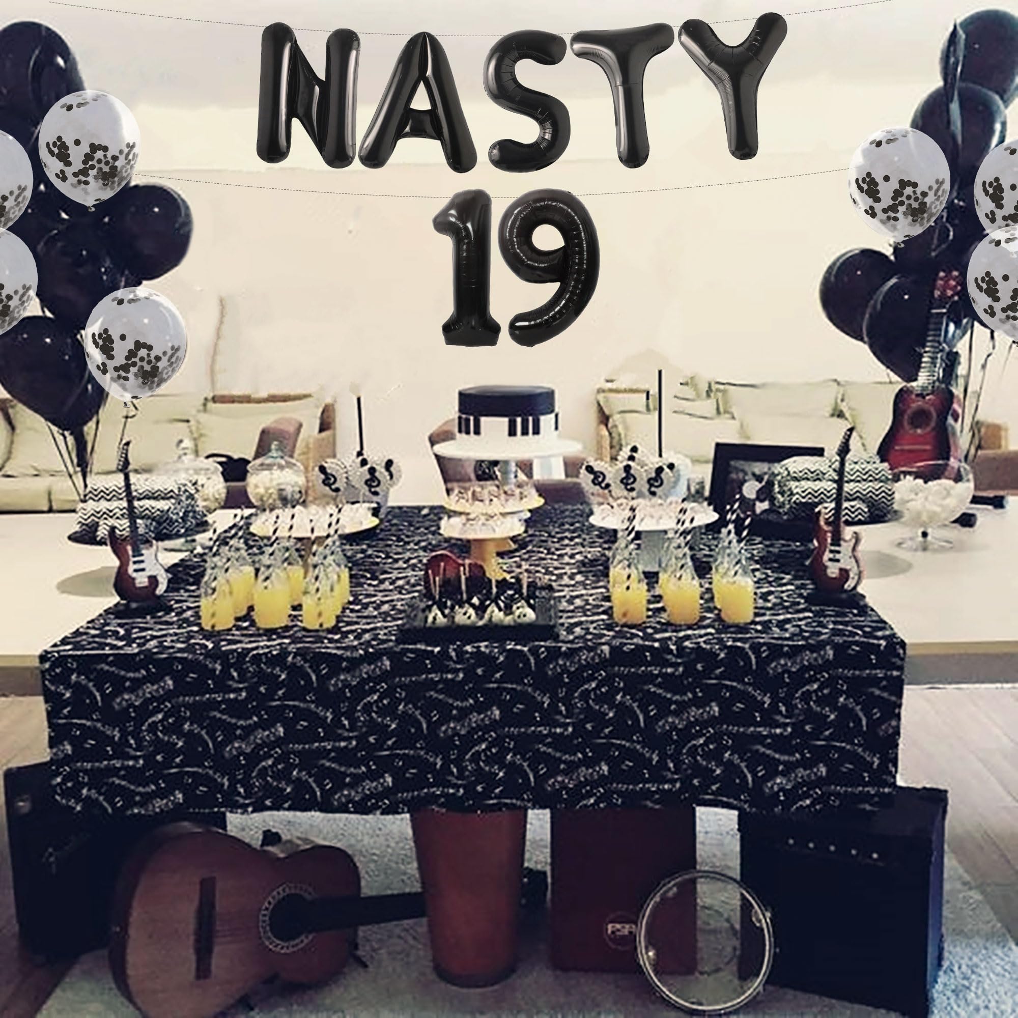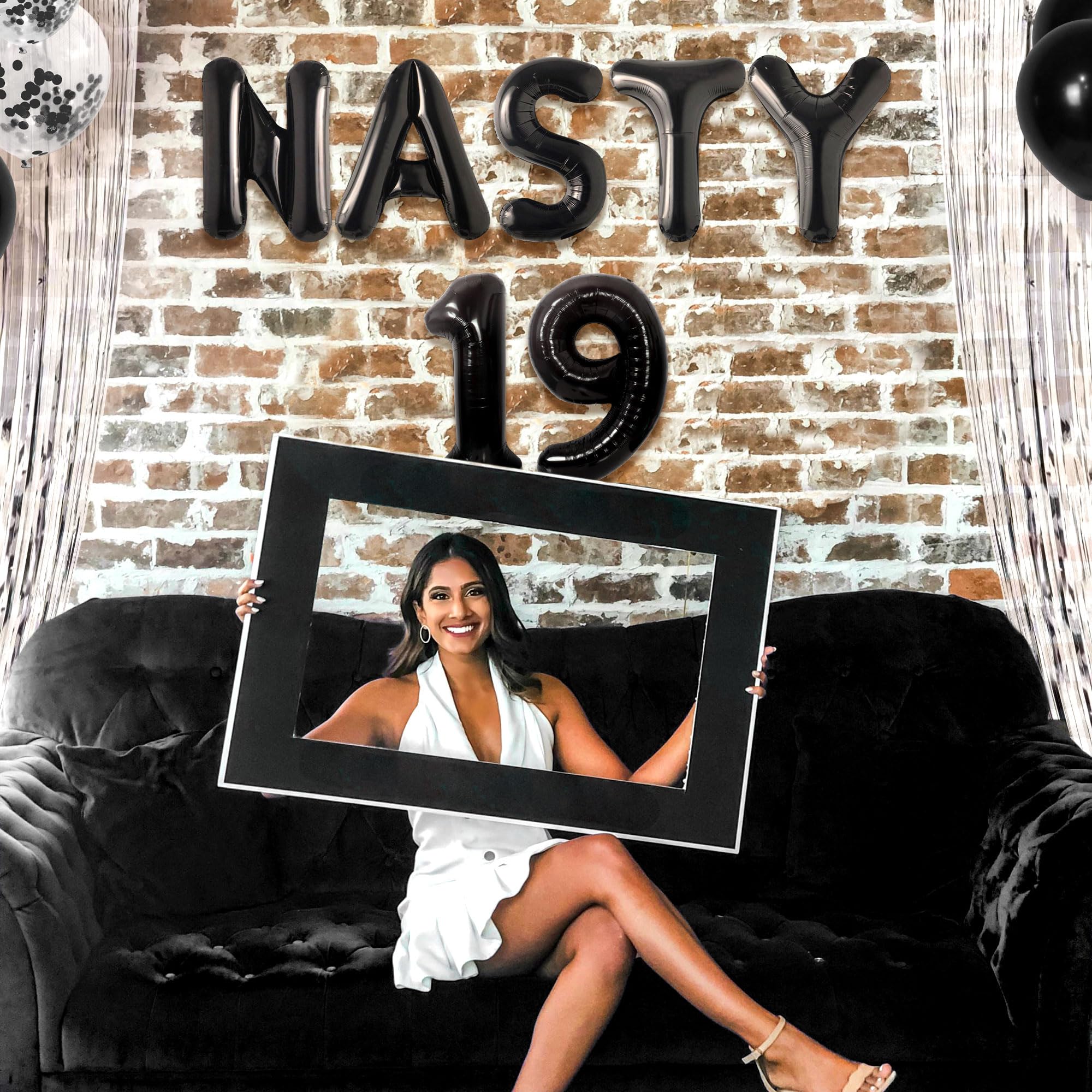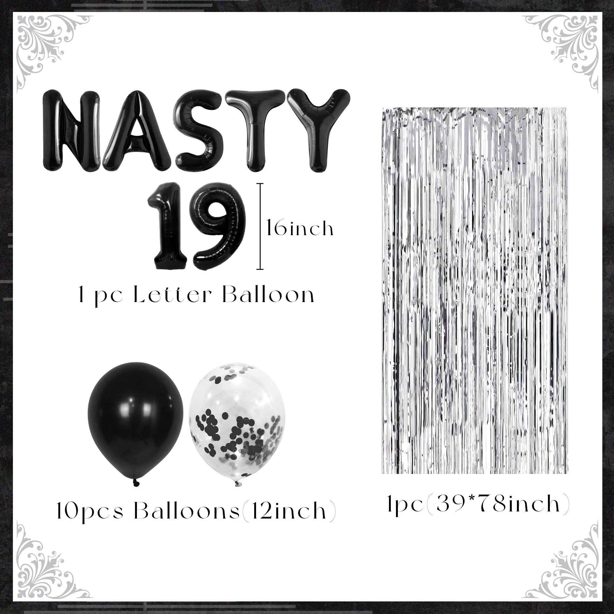 You will get: 1x 16 inches NASTY alphabet balloon, 1x 16 inches 19 numbers balloon, 5x black latex balloons, 5x clear latex balloons with foil inside, 1x silver tassel measuring 39*78 inches