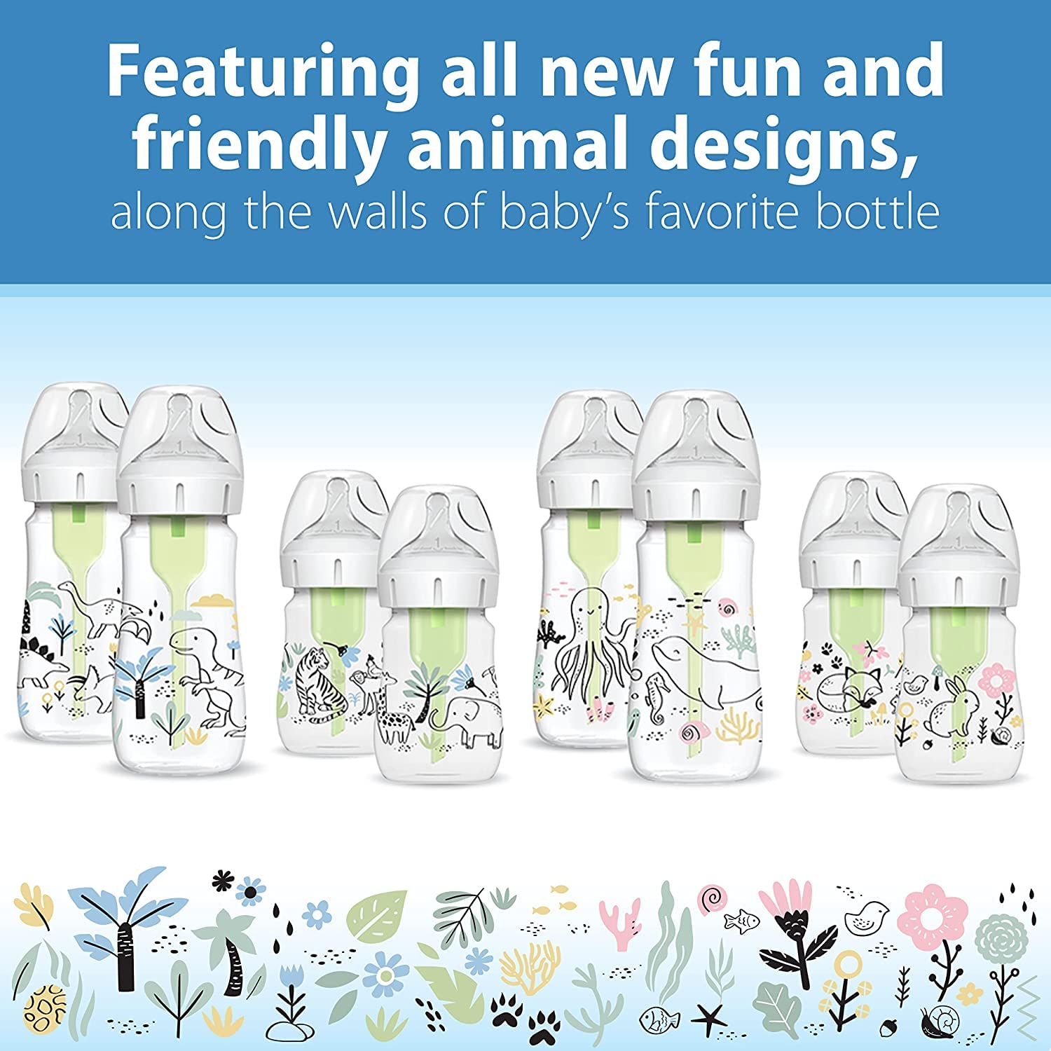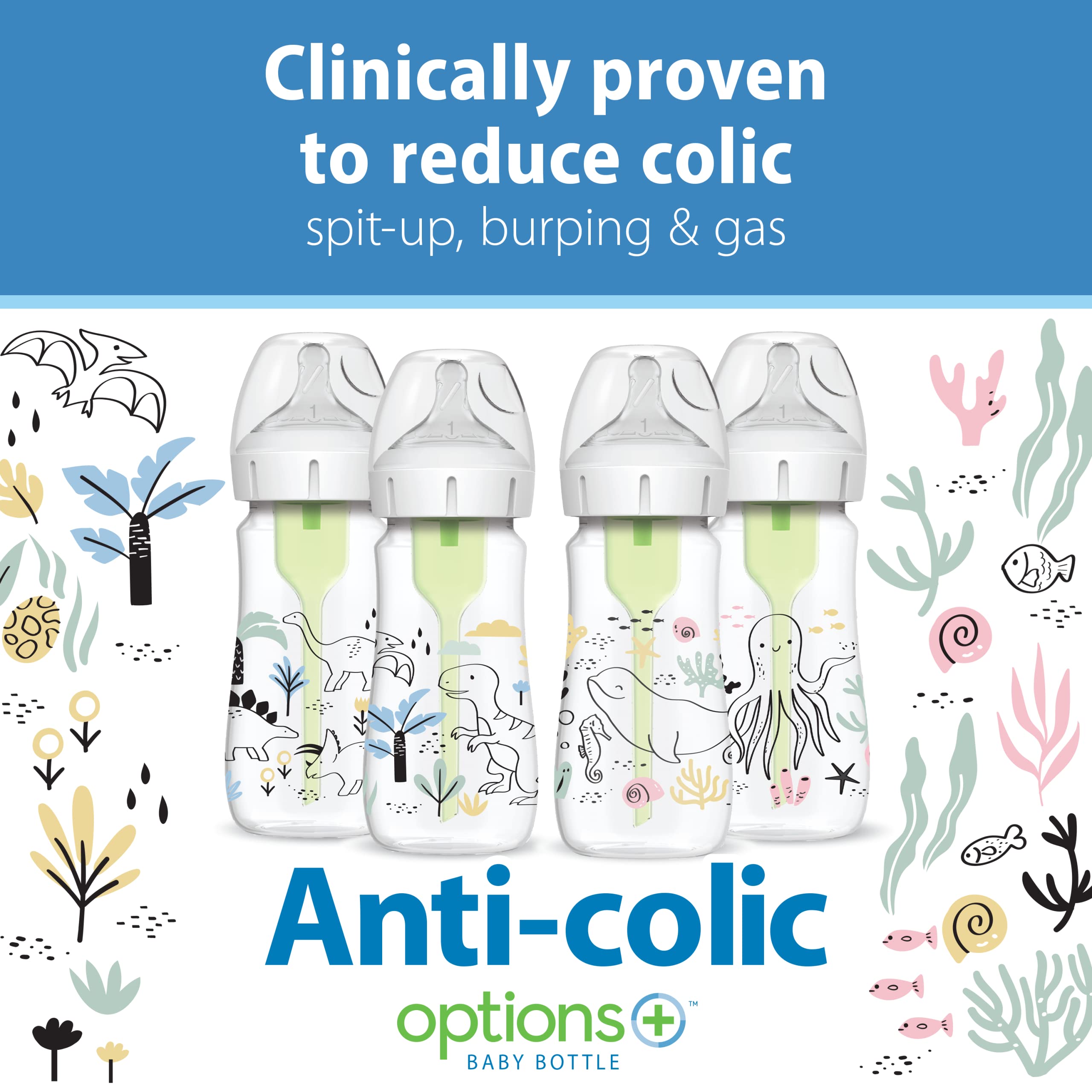Contains (4) Dr. Brown’s Natural Flow Anti-Colic Options+ Wide-Neck Baby Bottle Designer Edition Bottles, 9 oz/270 mL, Level 1 Nipple, 0m+ (2) Dinosaur Designs (2) Ocean Designs