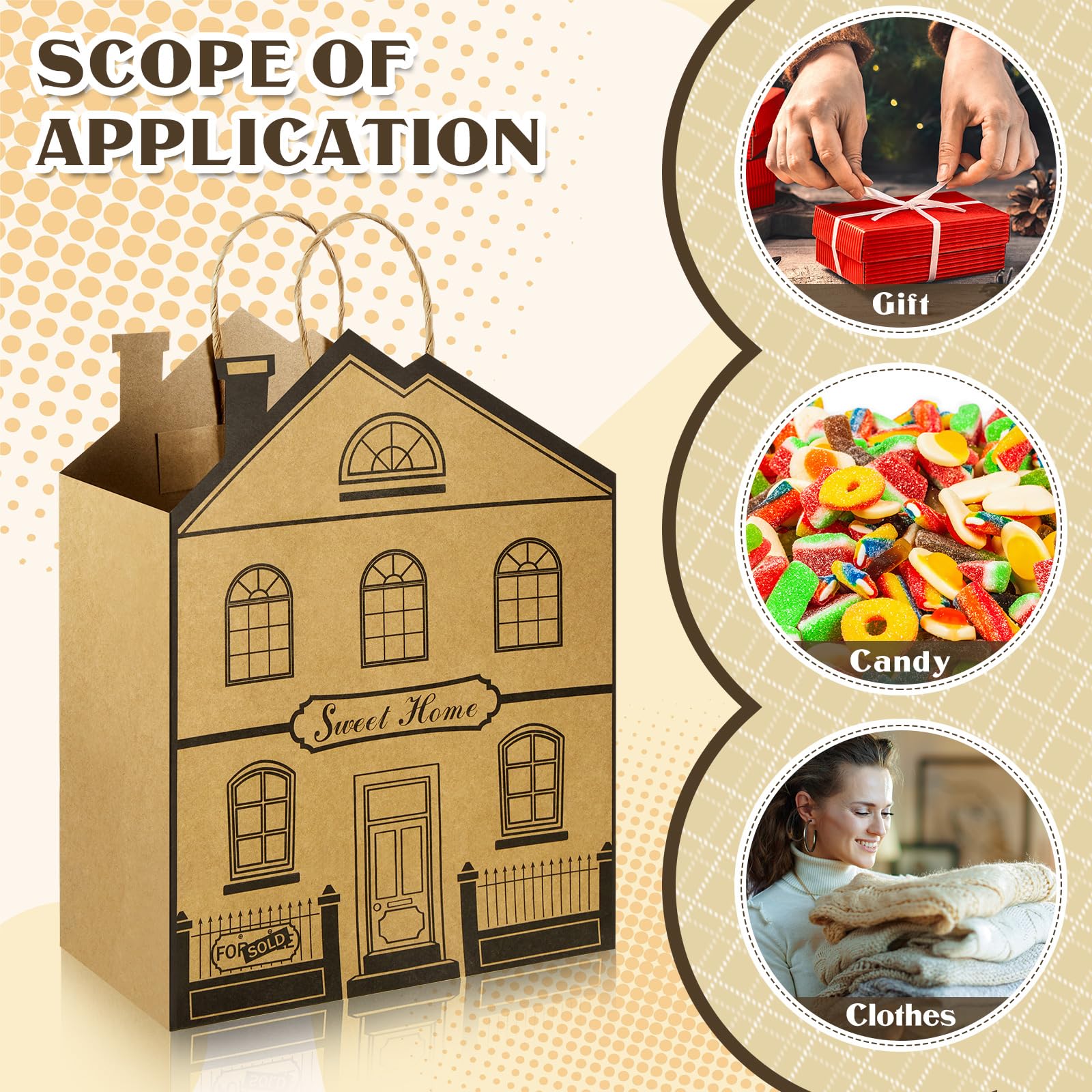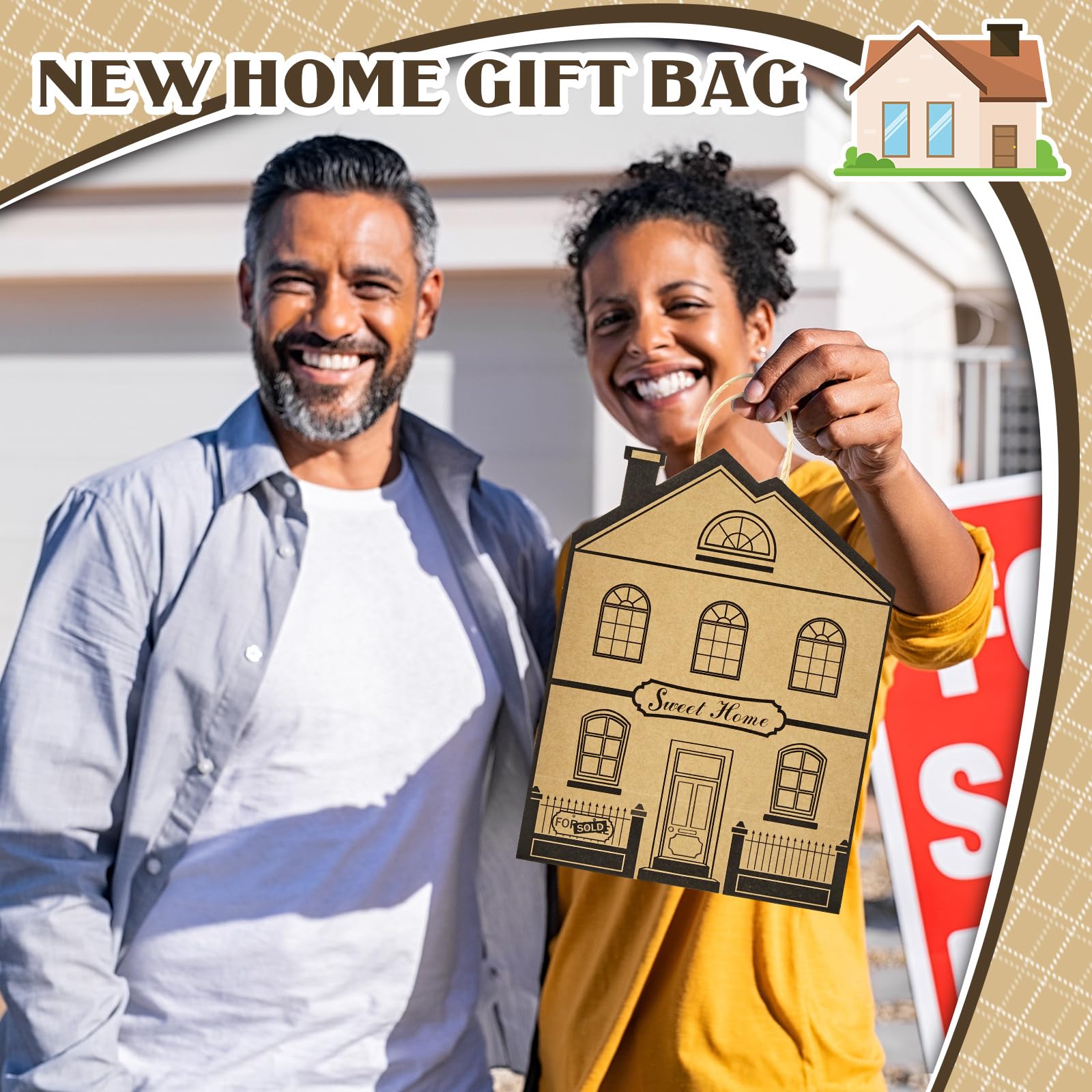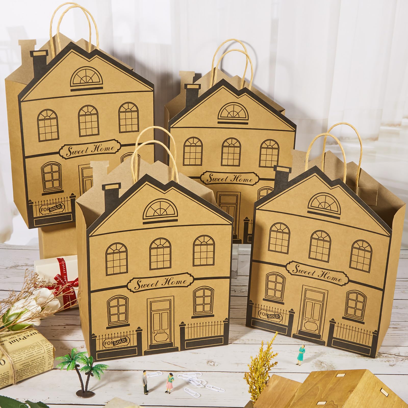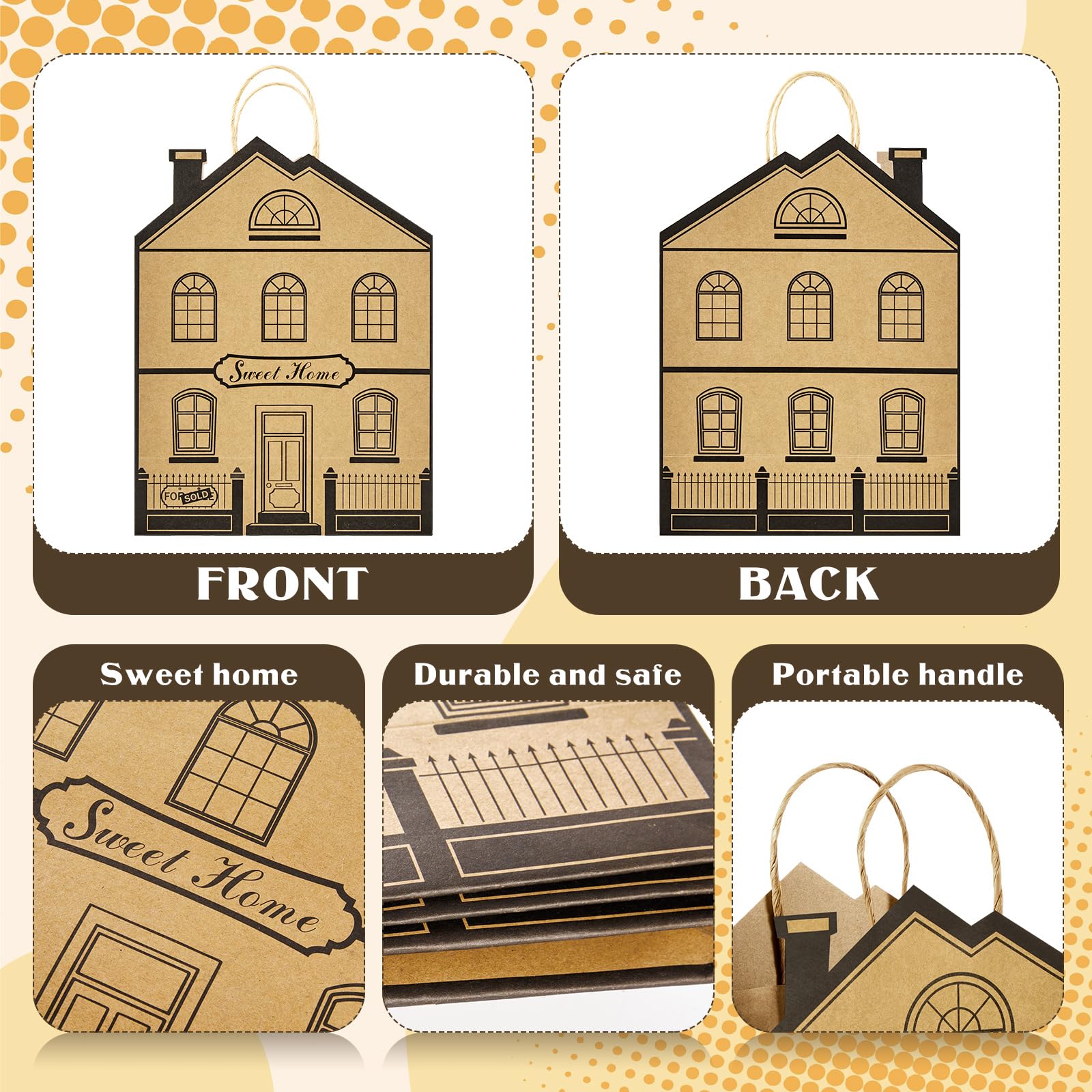 Unique House Shape: this kraft paper bag is based on the reference design of the house shape, simulating the front and back of the house, and printed with the word 'sweet home', eye catching and vivid, easy to attract other's attention, making it a very nice new home party favor