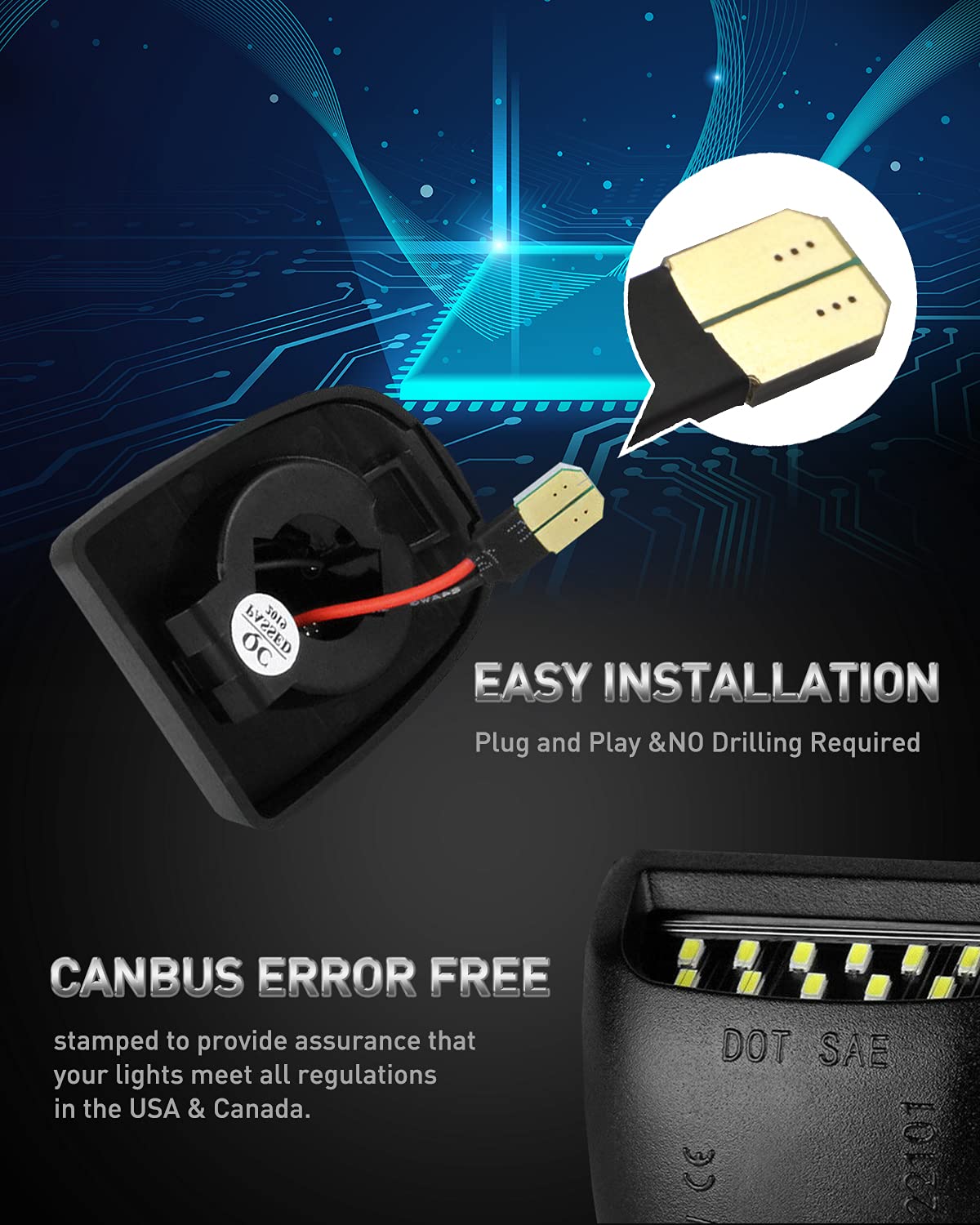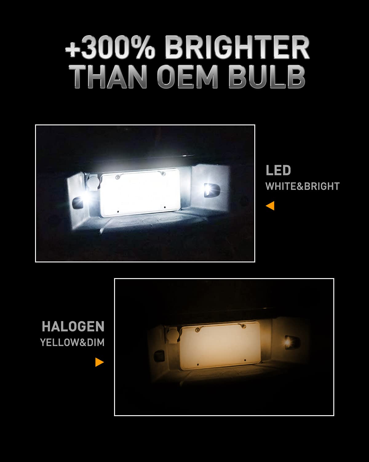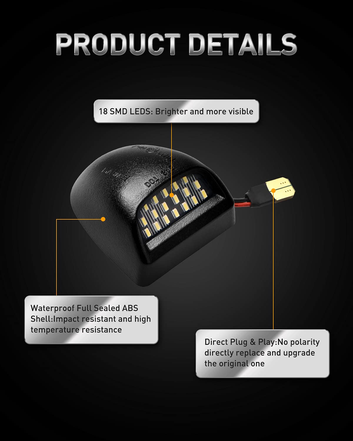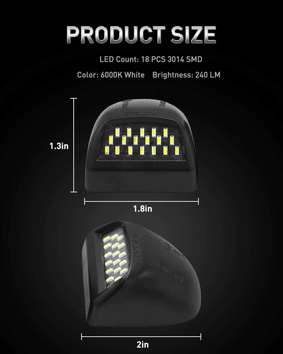 EXTREMELY BRIGHT: Each lamp has 18 SMD 6,000K white 3014 led chips. 300% brighter than your factory license plate lights, maximize the rear end illumination but no blind to back up camera