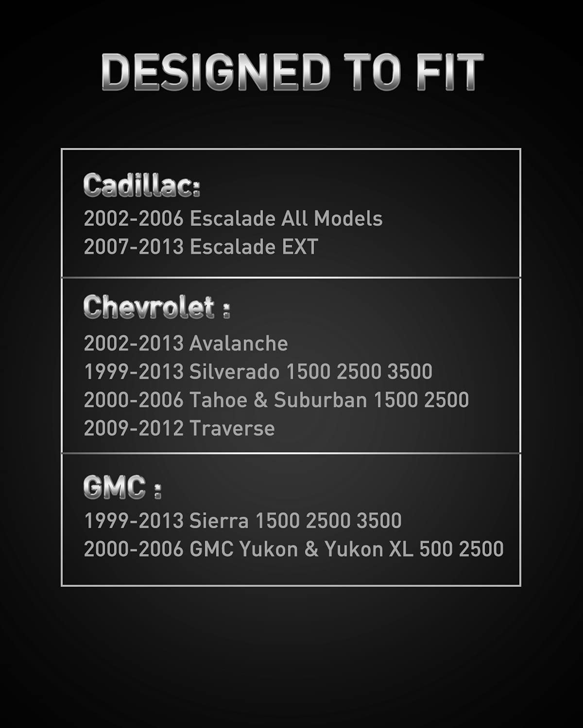 COMPATIBILITY: Compatible with Chevy Silverado 1500 2500 3500, Suburban Tahoe, Chevy Avalanche, GMC Sierra 1500 2500 3500, Yukon /Yukon XL, for Escalade, etc. (For more details, please refer the description.)