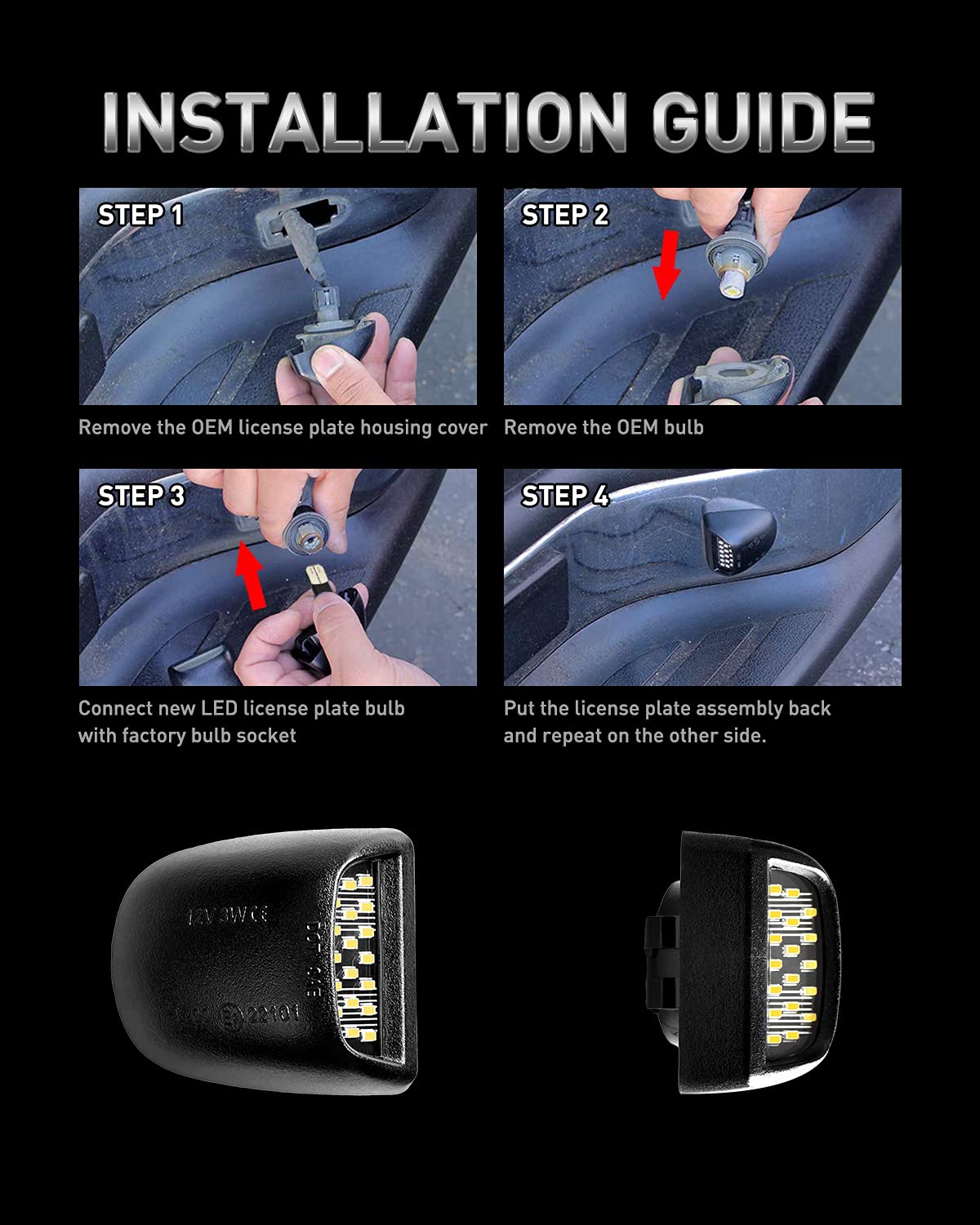 15 MINUTES INSTALLATION: Non-polarity plugs, simply plug & play, direct fit into original housing without modifications. Simple upgradation but greatly increase the visibility of your license plate.