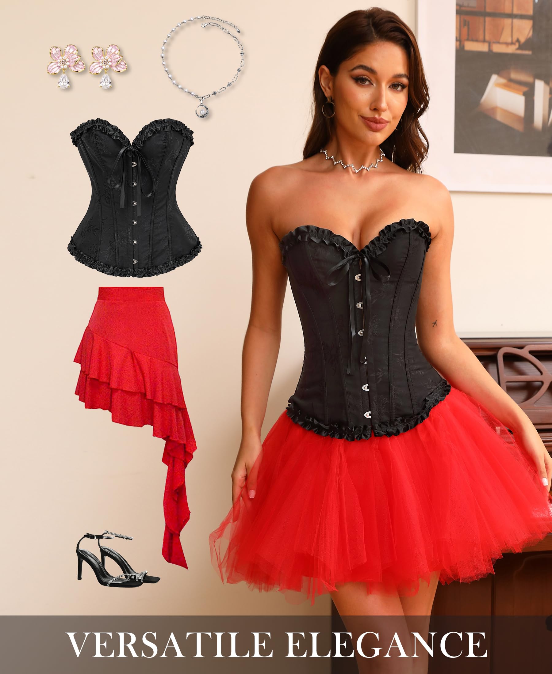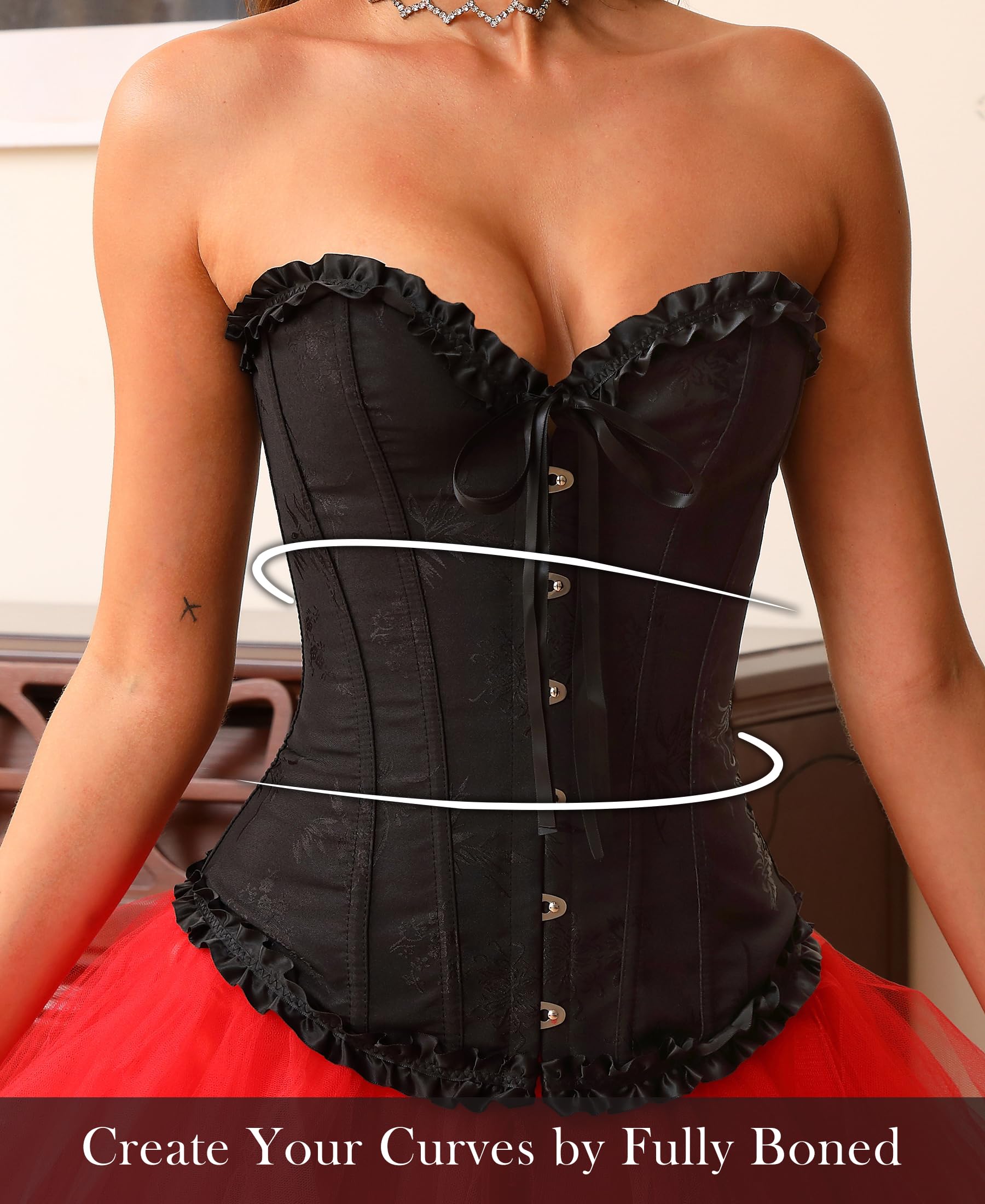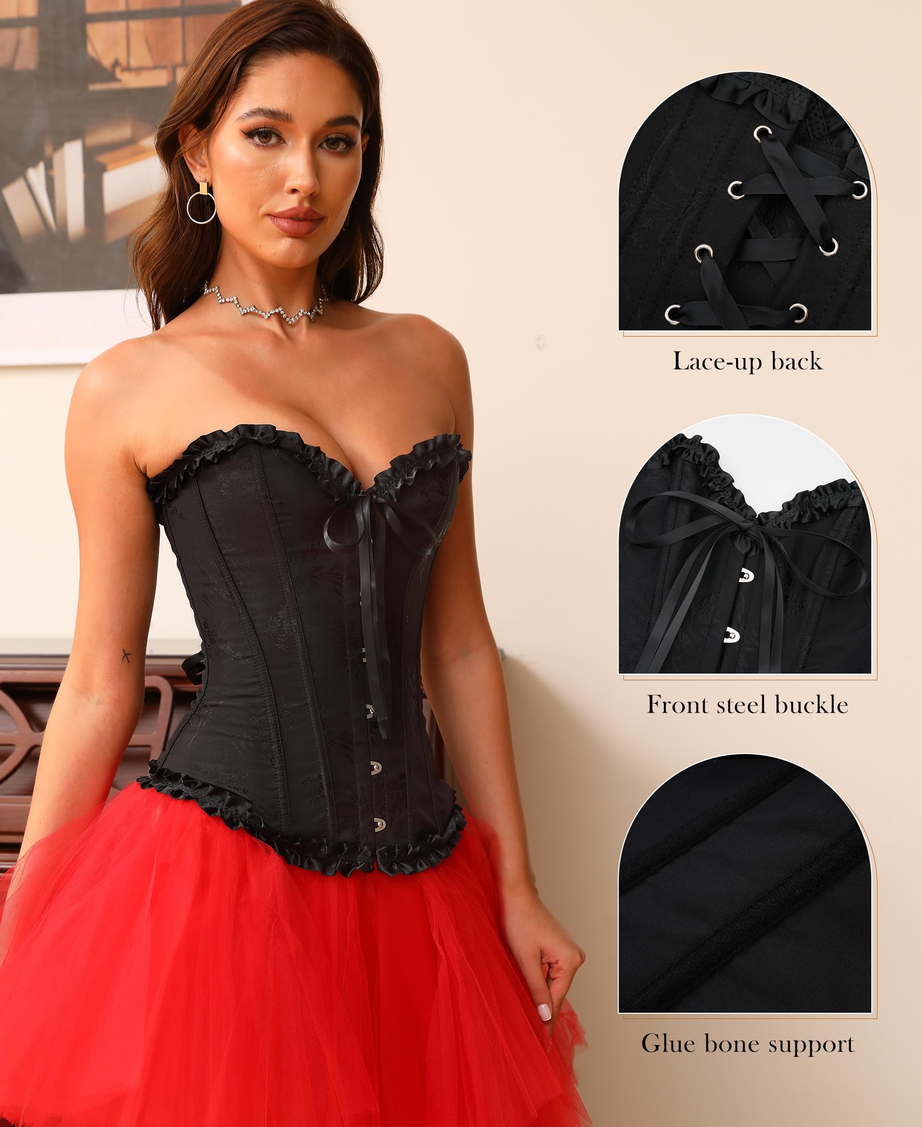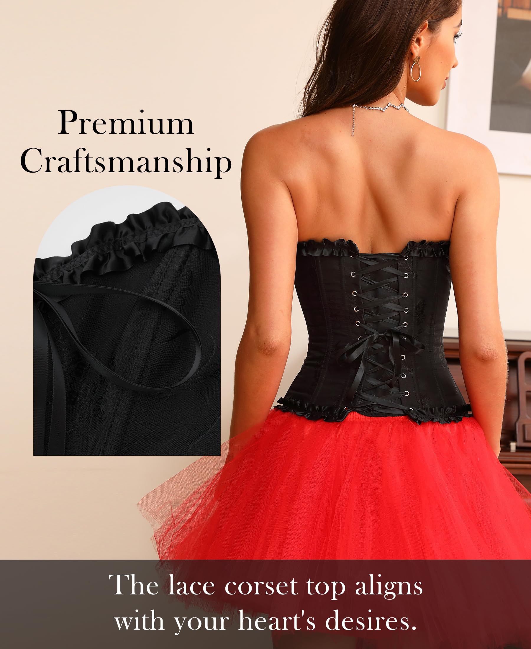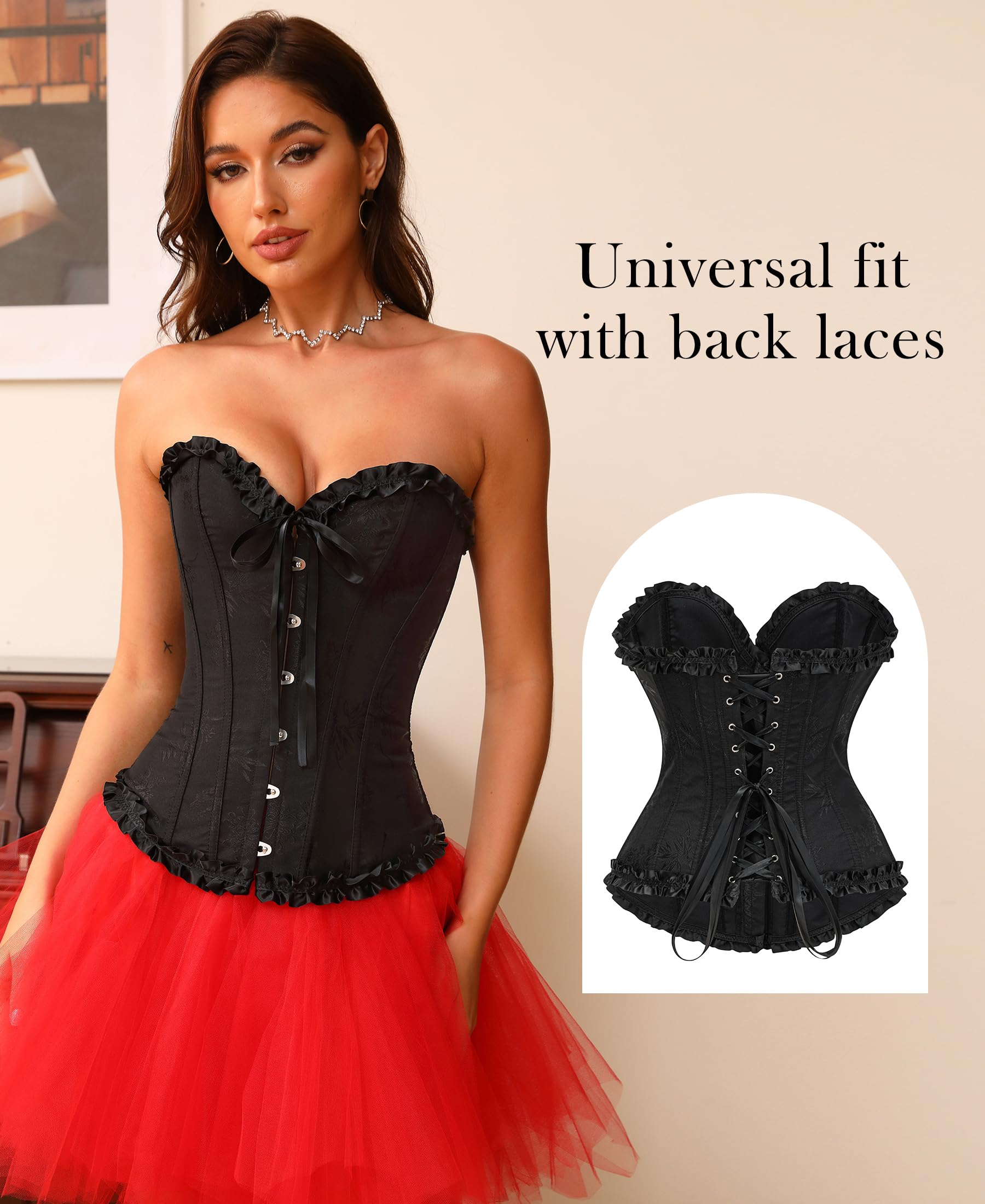 ALL DAY COMFORT: Our overbust corset top is a harmonious blend of comfort and elegance, made with materials that caress your form while ensuring freedom of movement. The waist corset unique 12 plastic bone structure is engineered to support an upright posture, reducing back strain. Designed for wearability from dawn until dusk, the waist cincher corset is the ideal everyday companion. Our lace corset top aligns with your body's needs and your heart's desires.