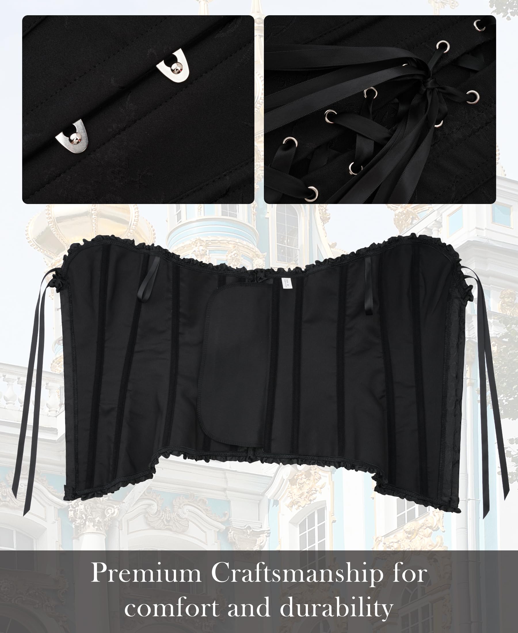 PREMIUM CRAFTSMANSHIP: Our women's bustiers & corsets are crafted with an unwavering commitment to quality. The outer shell of corset shapewear is a blend of luxurious Polyester, complemented by a pure Polyester lining that promises longevity and resilience. The stainless steel busk closure stands as a bastion of reliability, ensuring your corset black crop top remains securely fashioned, no matter the occasion.