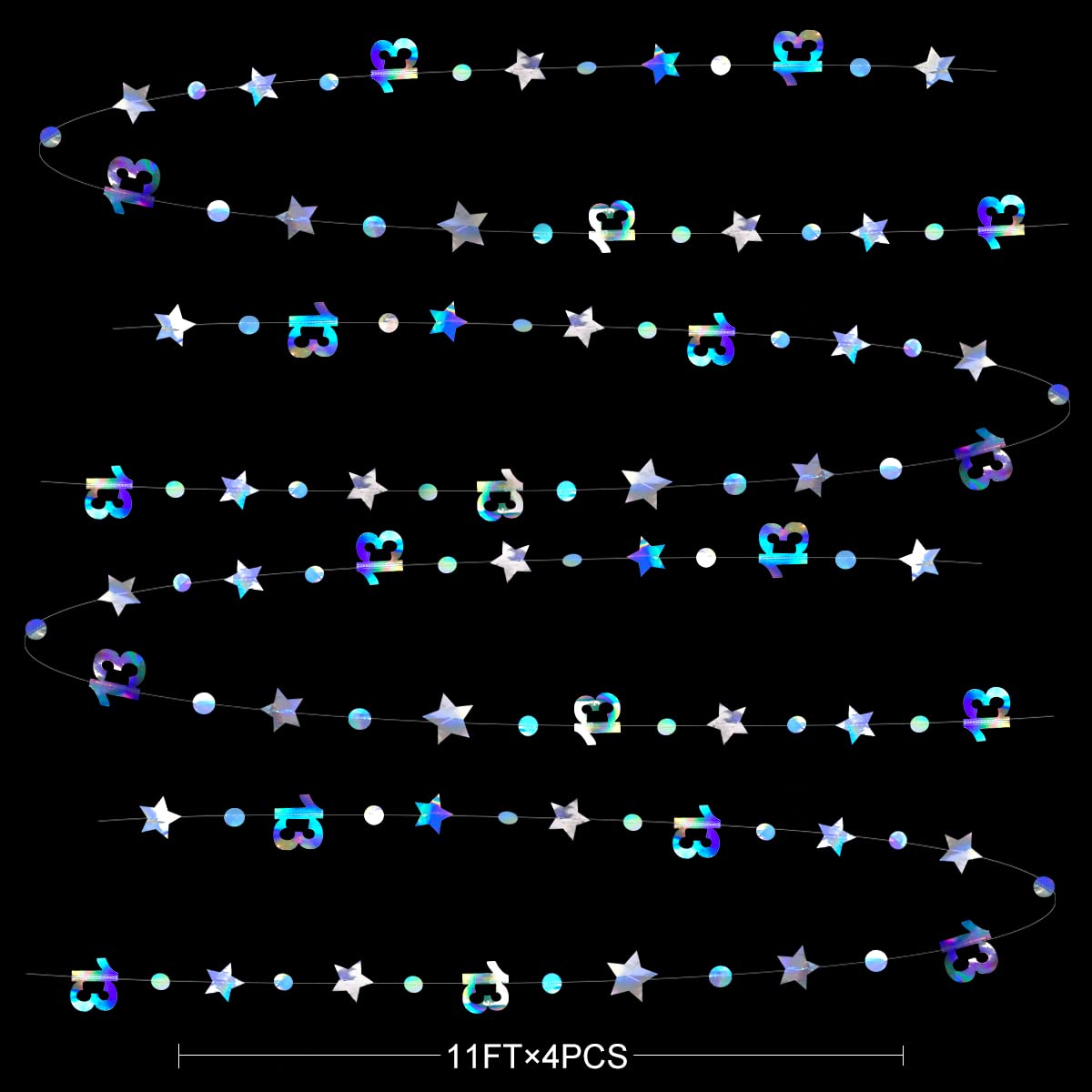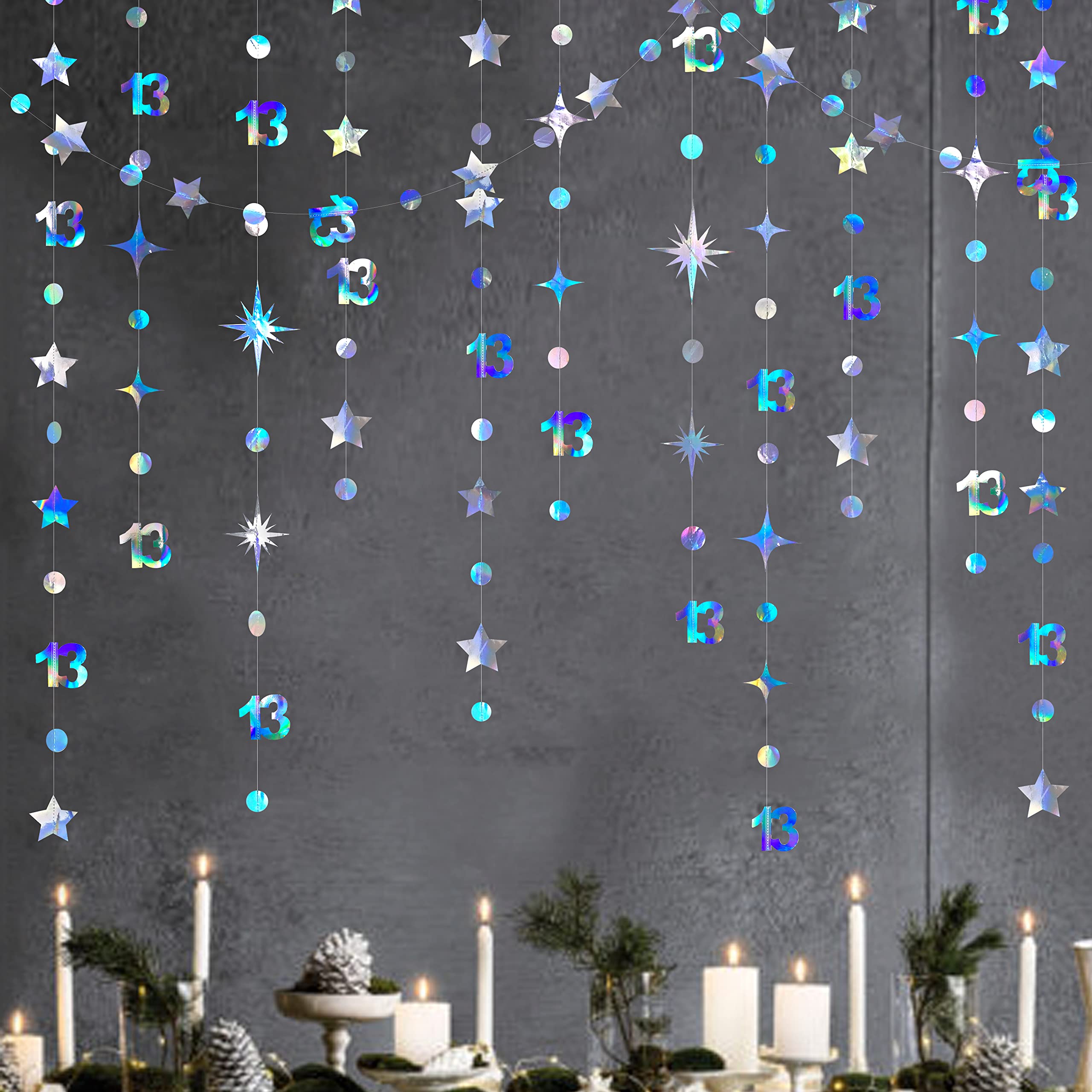 👍 Package includes - 4 strings of 11.5 feet/3.5 meters iridescent holographic number 13 sparkling twinkle star and circle dots garlands , totally is 46 feet/14 meters