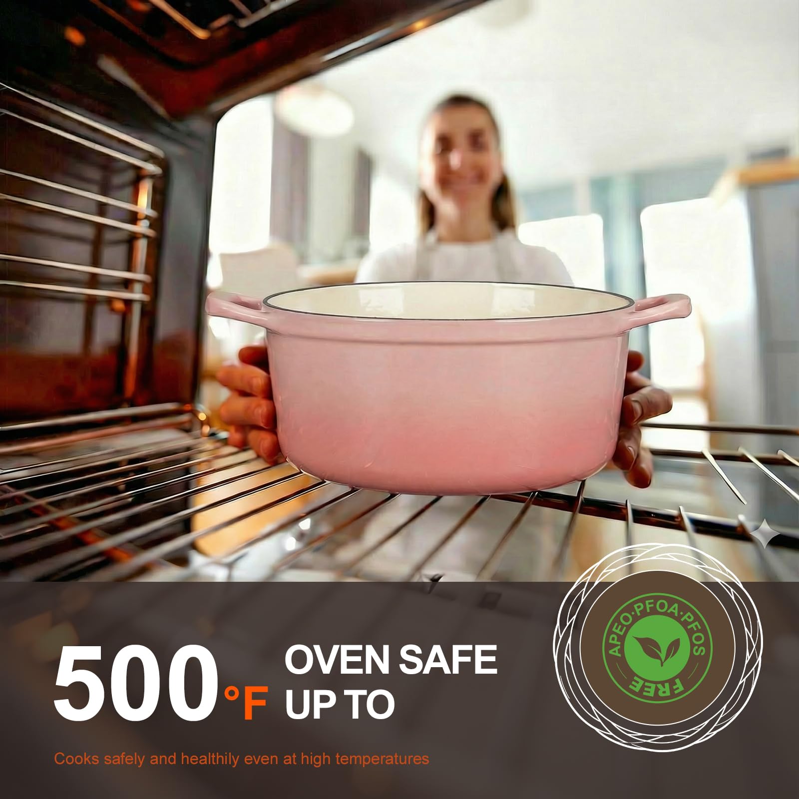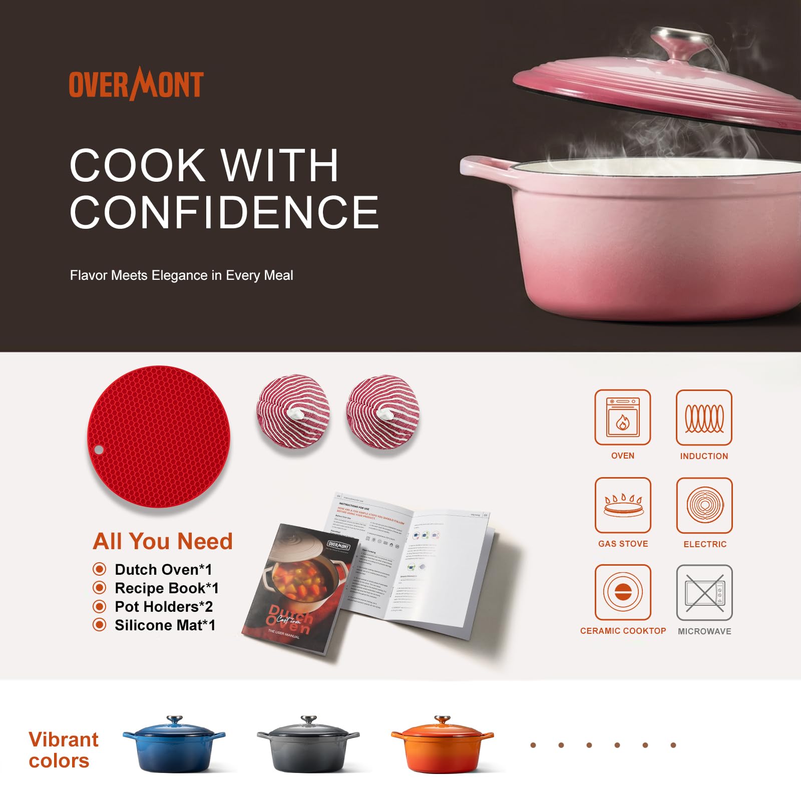 【Universal Compatibility】Our premium enamel dutch oven is designed to shine on various stovetops, including gas, electric and ceramic. Plus, it's oven safe up to 500℉, offering an exceptional range of cooking options. From stewing to roasting, this Overmont upgraded dutch oven can handle it all.