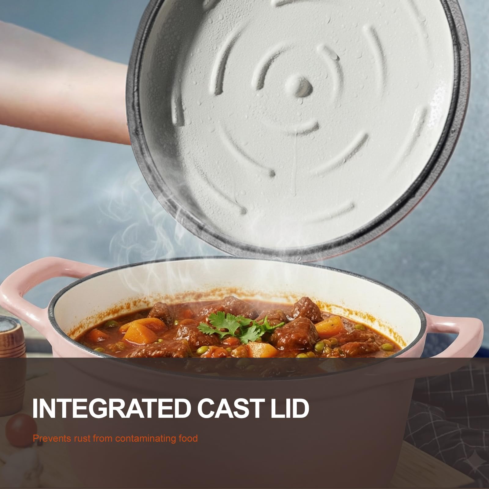 【Flavor Preserving Design】Say goodbye to dry or overcooked meals! Raised water-ripple condensation points redistribute moisture evenly to your food. Unlike traditional lids, where condensation runs down the sides, our dutch oven lid keeps your dishes succulent and flavorful. The one-piece lid prevents steam from reaching the knob, avoiding rust and ensuring pure flavor.