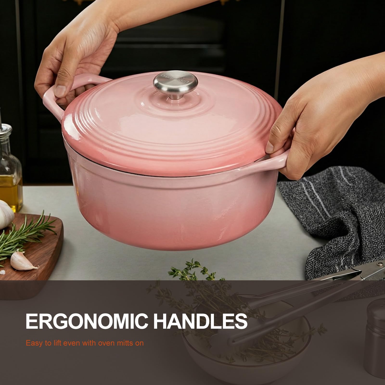 【Safety & Convenience】Our dutch oven features widened, upward-angled loop handles designed with ergonomics in mind, ensuring easy lifting even while wearing oven mitts. The upgraded step-style lid knob increases the distance from hot steam, reducing the risk of burns.