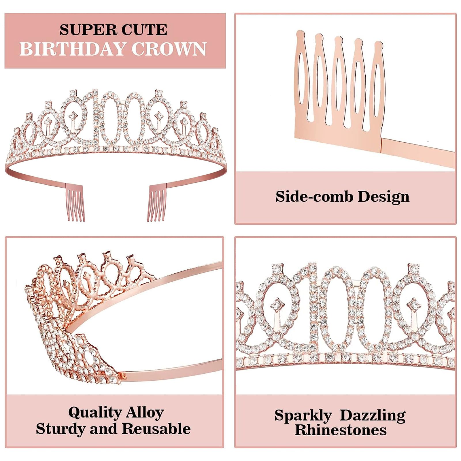 【100th Birthday Tiara For Women】: The 100th birthday crown headband is made of quality alloy and shiny rhinestones, rose gold color highlights elegance. Crown with combs that make sure it can grip the hair more tightly for fitting girls