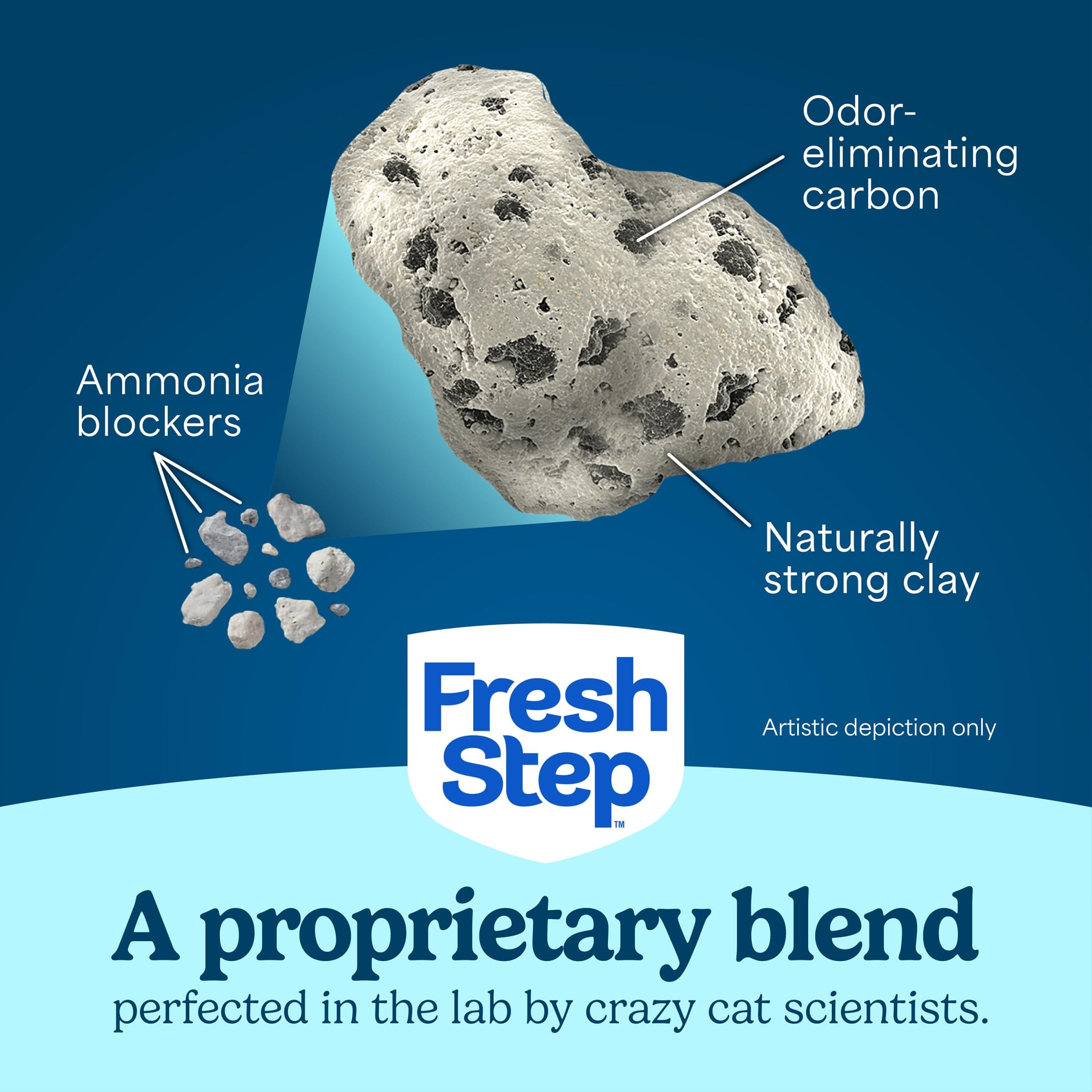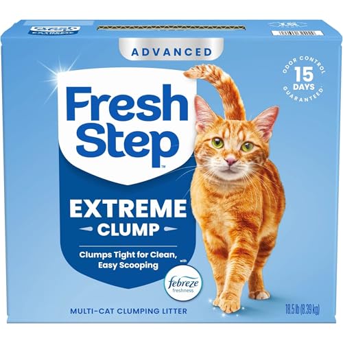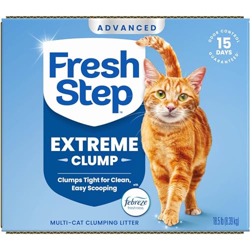 Fight cat litter box odors instantly with Fresh Step Advanced Extreme Clumping Litter. Featuring an extra-strength odor-fighting formula with Ammonia Block Technology, this activated charcoal clumping cat litter fights 100% of litter odors (1) to help keep your home smelling fresh. This Fresh Step litter combines the power of Febreze freshness and an extra-strength Mountain Spring scent (2) to guarantee 15 days of odor control in your cat's litter box (3). With naturally-strong clay plus built-in odor-fighting power, Fresh Step Extreme Cat Litter locks in cat urine and liquid on contact and forms tight clumps. The ClumpLock technology makes scooping the kitty litter box quick and easy with no messy crumbles. Plus, the low-dust cat litter formula helps keep floors and other surfaces cleaner. Enjoy more catnaps and cuddle time with your kitty when you choose Fresh Step cat litter. (1) Ammonia and fecal malodor (2) vs. Fresh Step Multi-Cat (3) See package for more information on terms and conditions