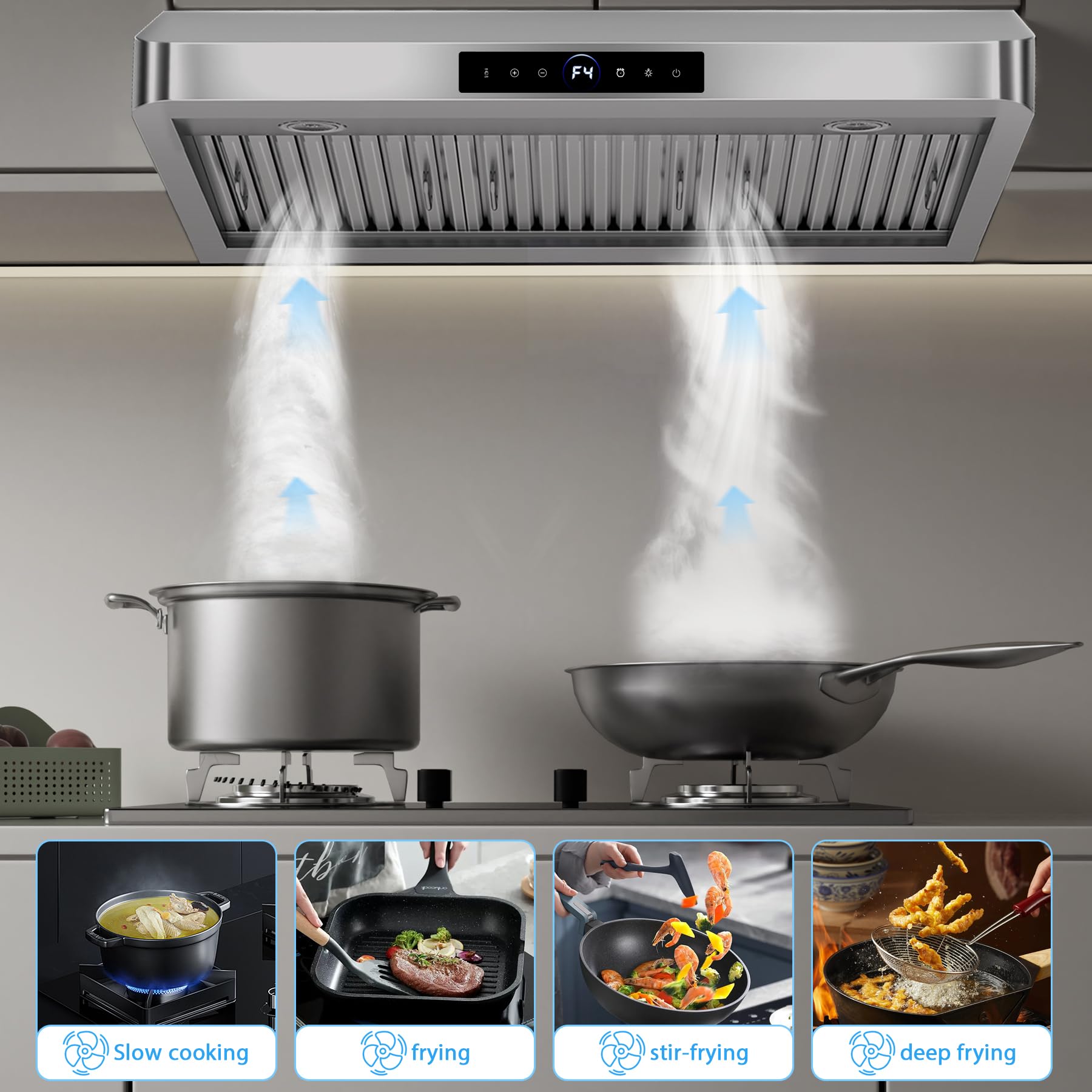 Touch & Gesture Control. This stylish and durable stainless steel under cabinet range hood combines modern elegance with smart features. The intuitive digital touchscreen allows for quick adjustments, and advanced gesture sensing technology allows you to precisely adjust the wind speed with a wave of your hand, with smooth operation and effective avoidance of accidental touches.