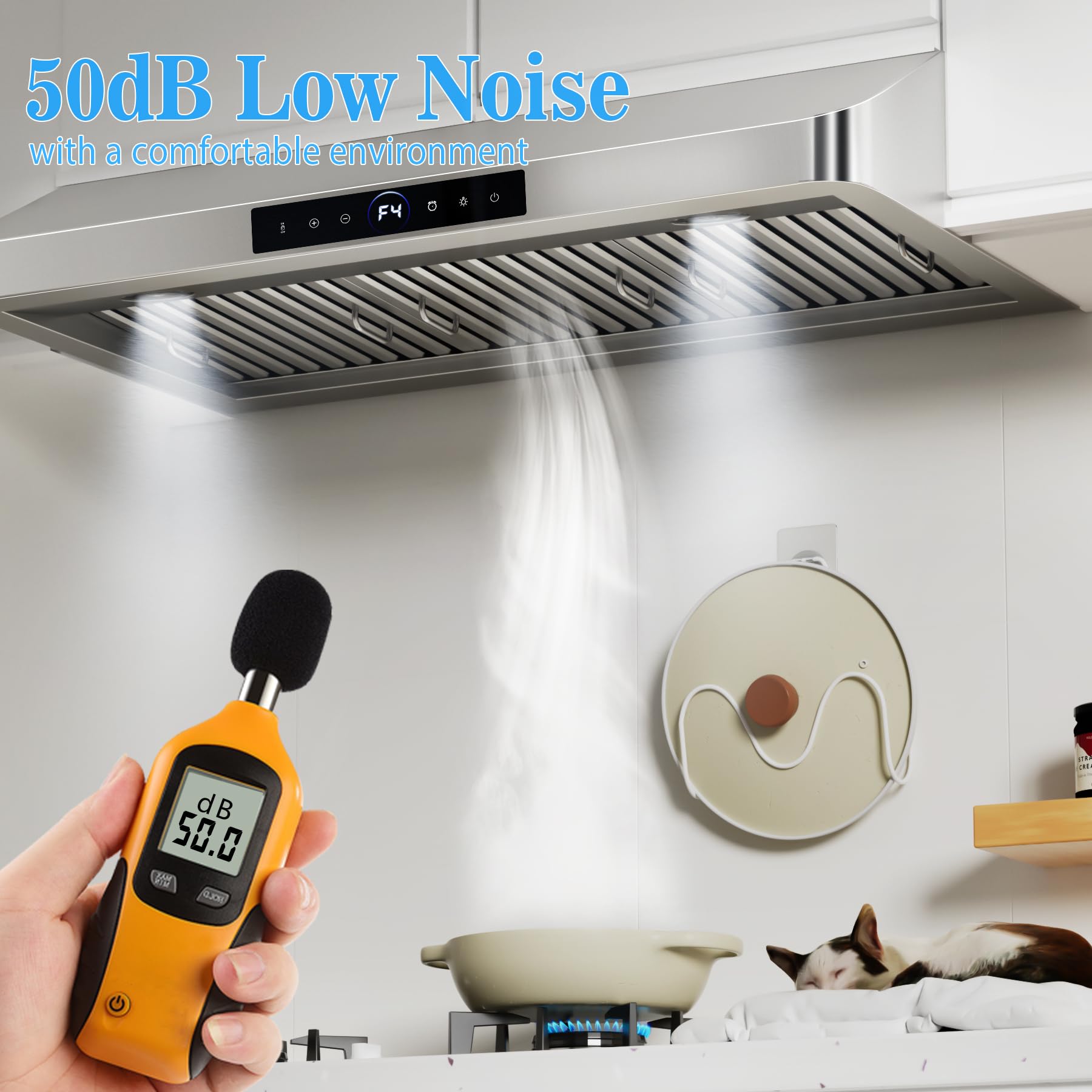 Ultra-quiet and Powerful Range Hood. Unique dual duct system and dual motor design, powerful suction and low noise performance. At low speed, the noise is as low as 35 decibels, so quiet that even pets can take a nap; even at the highest setting, the noise is controlled below 50 decibels, which is quieter than a microwave oven, bringing a peaceful and pleasant cooking experience.
