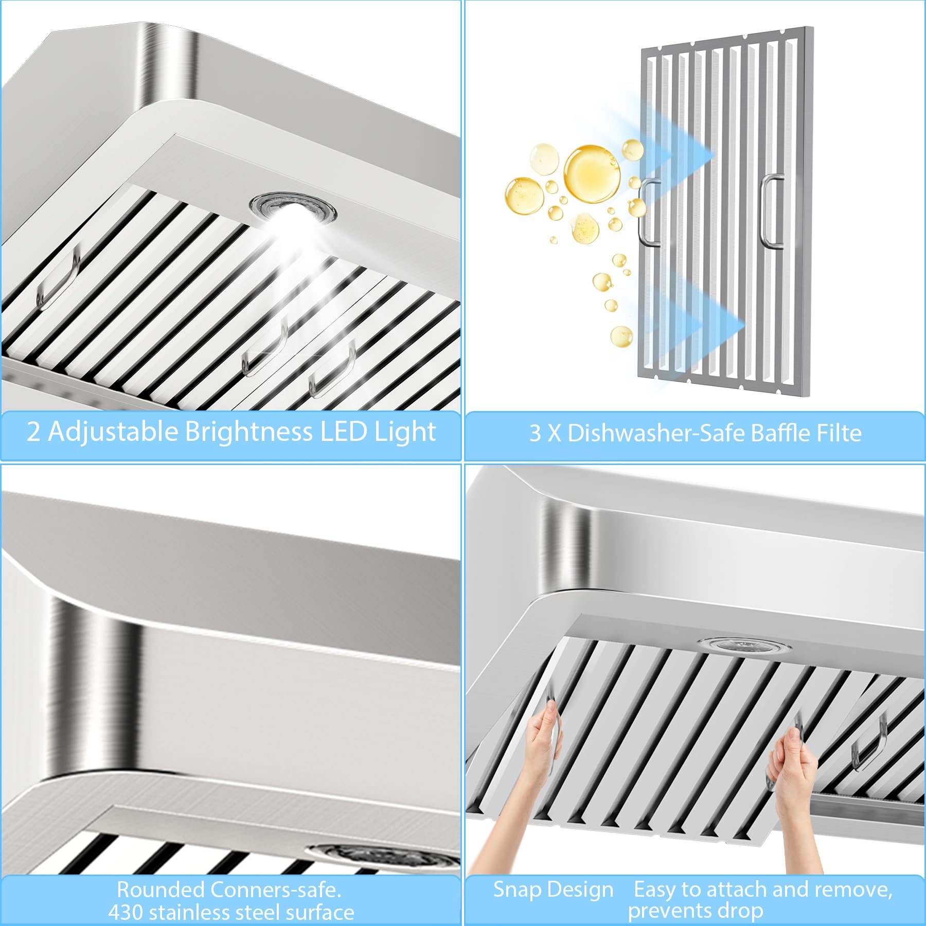 Machine-washable Stainless Steel Baffle Filters. The kitchen vent hoods equipped with two heavy-duty stainless steel baffle filters, they are heat-resistant and rust-resistant, and can effectively capture grease and impurities. The filters are easy to disassemble and reassemble, and can be directly put into the dishwasher for maintenance-free, long service life, and easy to create a clean kitchen.