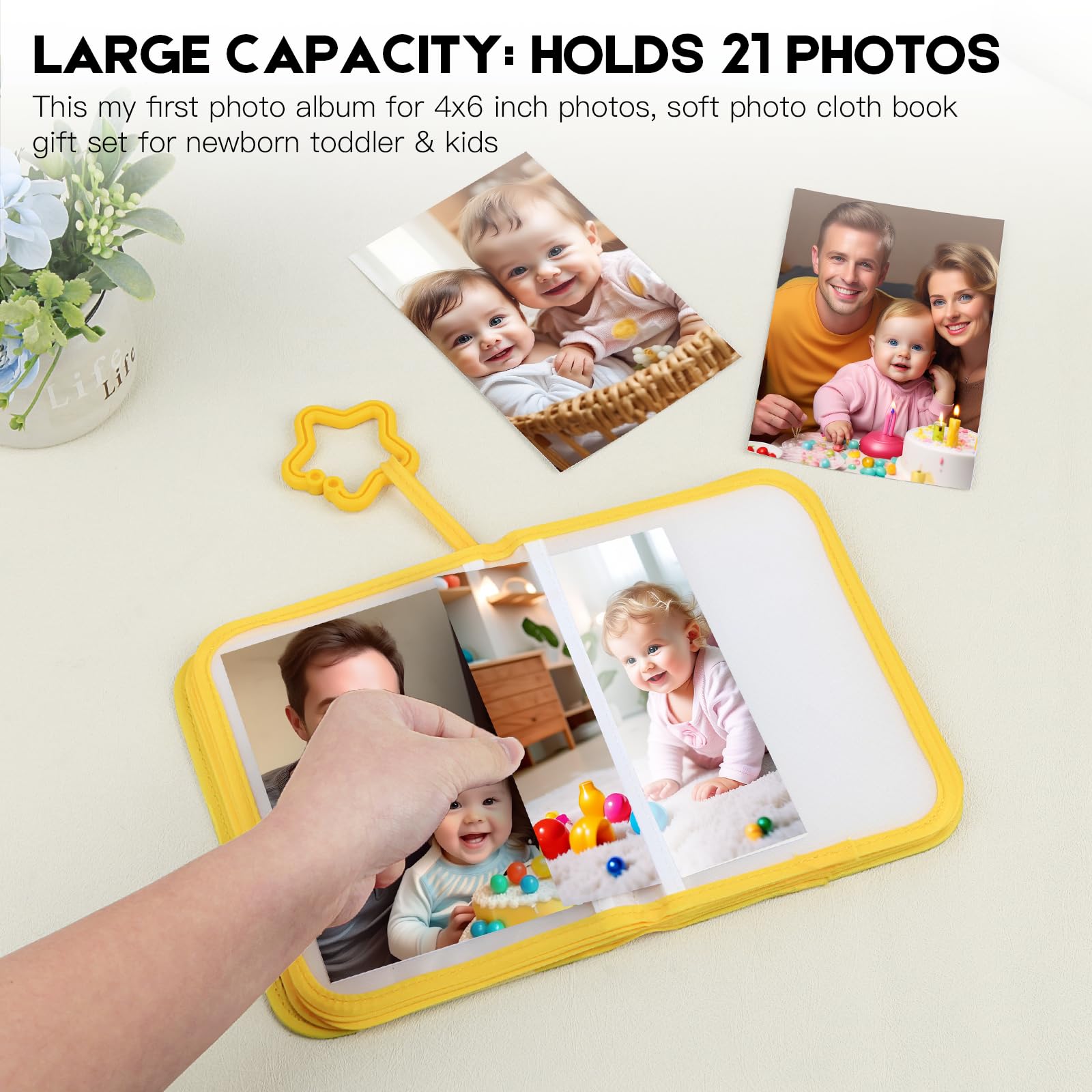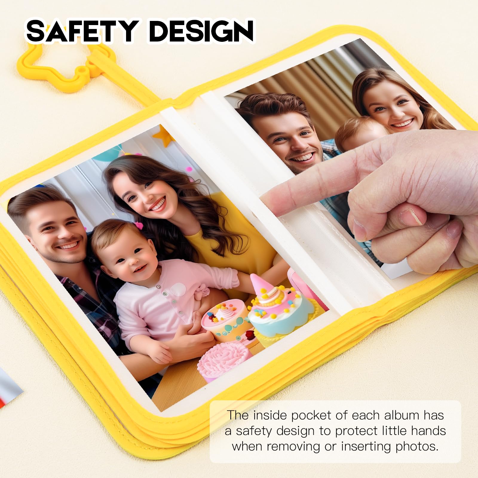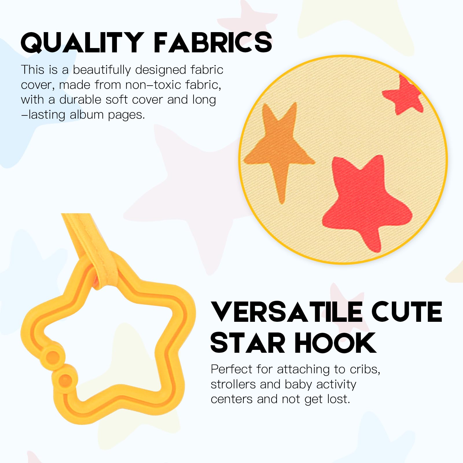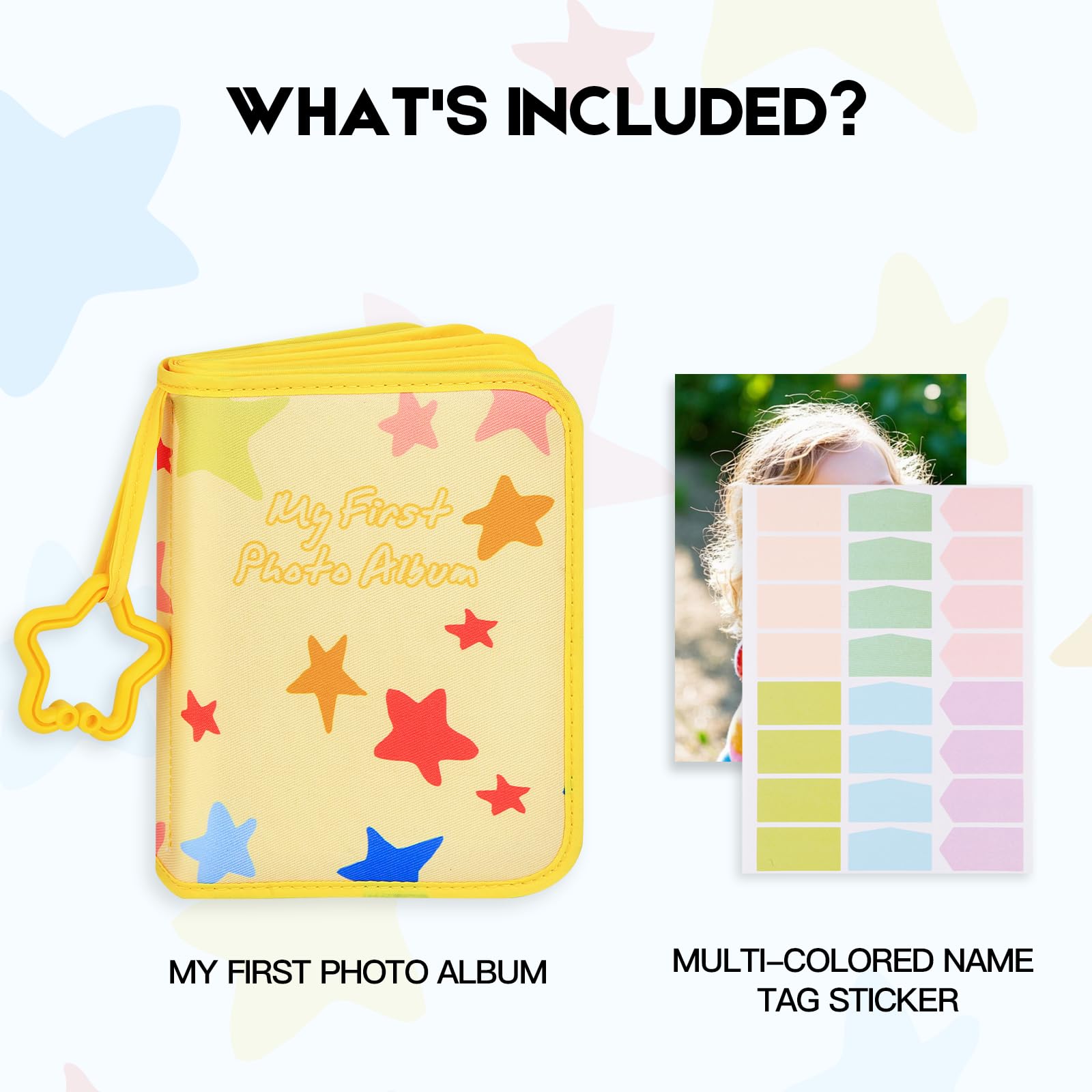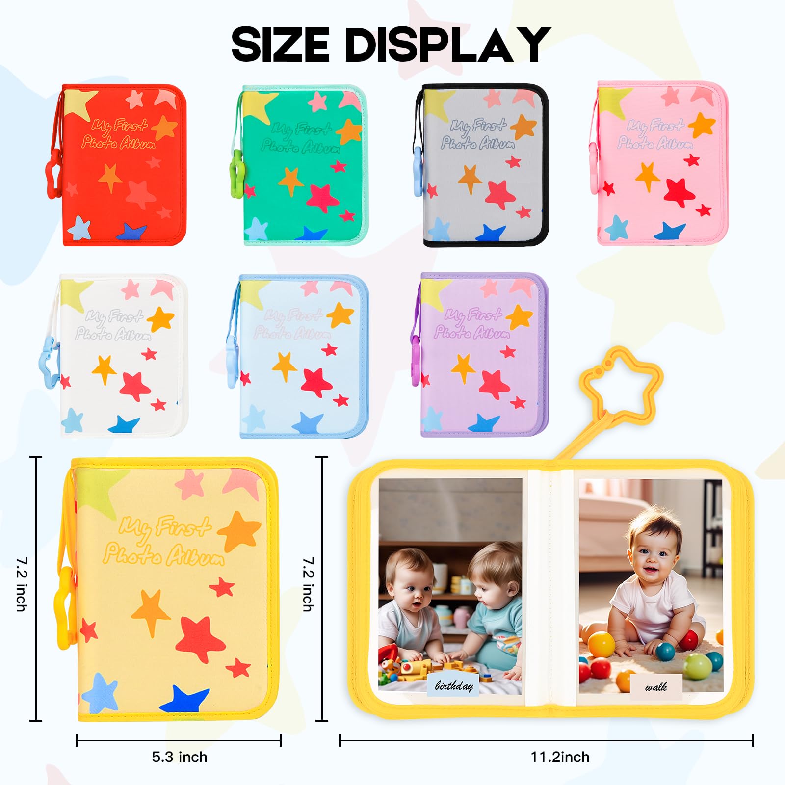 PERFECT SIZE: This small baby photo book is perfect for baby's tiny hands. Holds up to 21 4x6 inch photos. Clear photo pockets, can protect pictures from baby's drool, pictures won't stick to pockets, easy to insert and remove. The star hook can be easily attached to the cot, pram, etc. Child safety mirror on one side in the middle of the last page of the album.