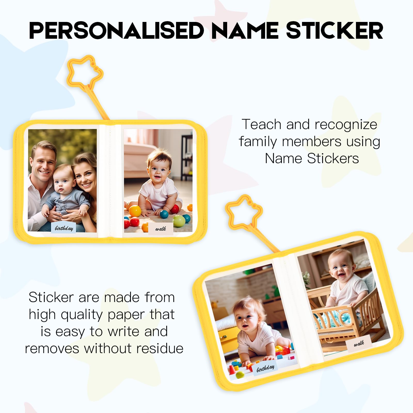 NAME TAG STICKERS: Cultivate children's imaginations and stimulate their curiosity, using family photos with name tags helps promote early brain development, social skills, literacy and communication skills. The familiar faces in this baby photo book help to stimulate the brain. Photographs and baby-safe mirrors stimulate your child's imagination and curiosity. The soft photo book is a great way to teach your baby about family members.