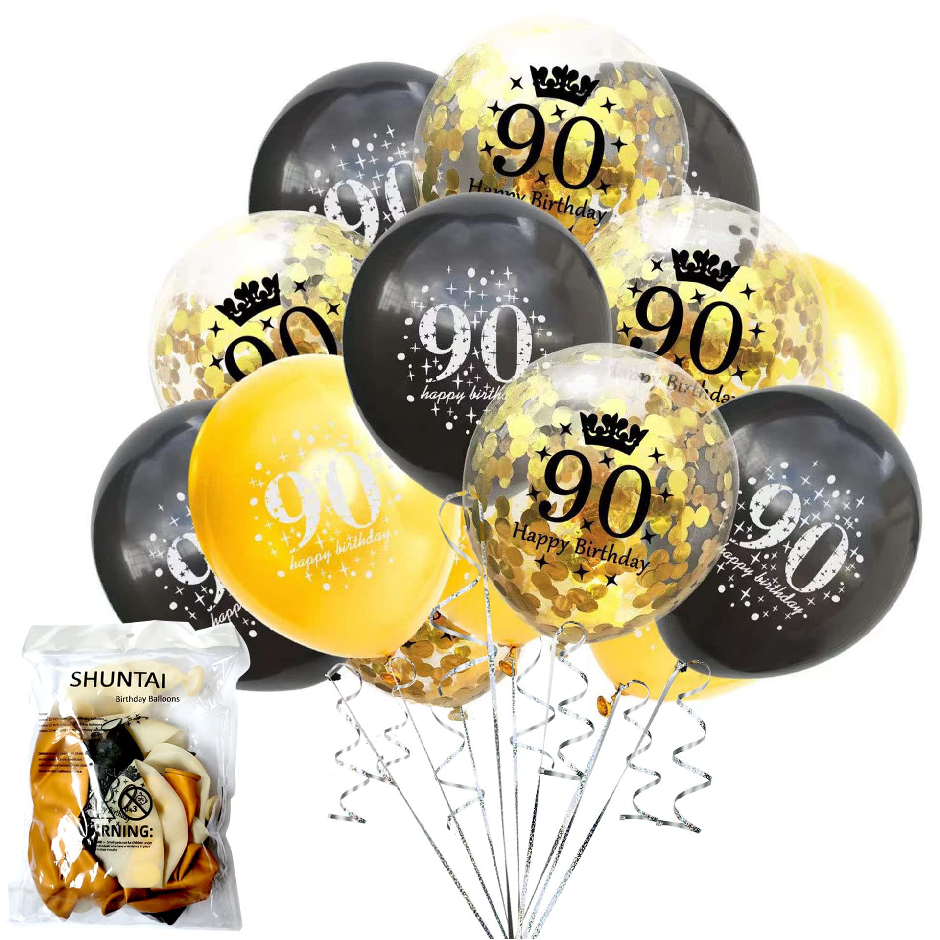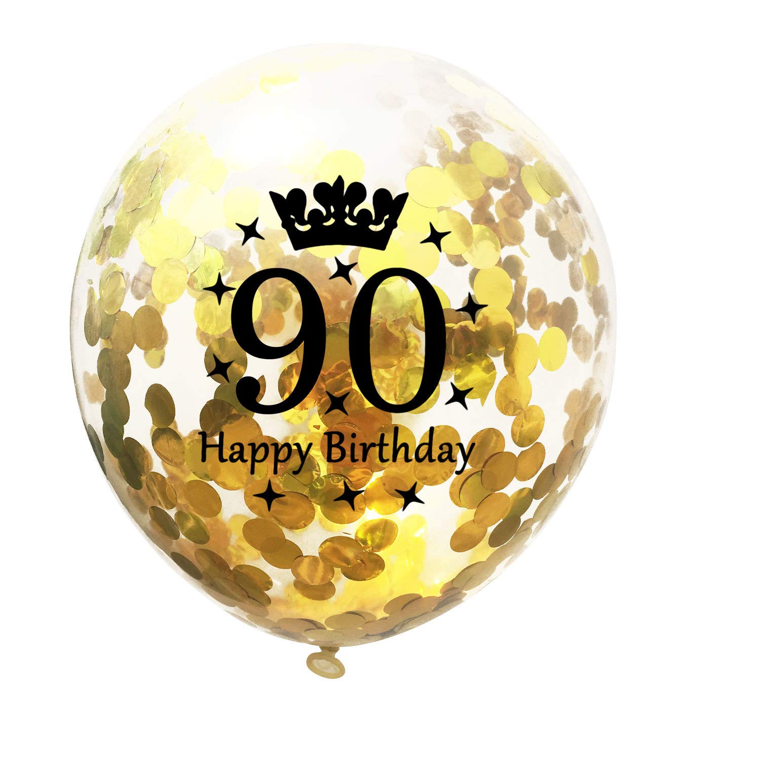 Package:5 pieces 12 inch black latex balloon printed with the words "90 Happy Birthday",5 pieces 12 inch gold latex balloon printed with the words"90 Happy Birthday",5 piece 12 inch gold confetti balloons printed with the words"90 Happy Birthday", very suitable for women men 90th birthday party decorations
