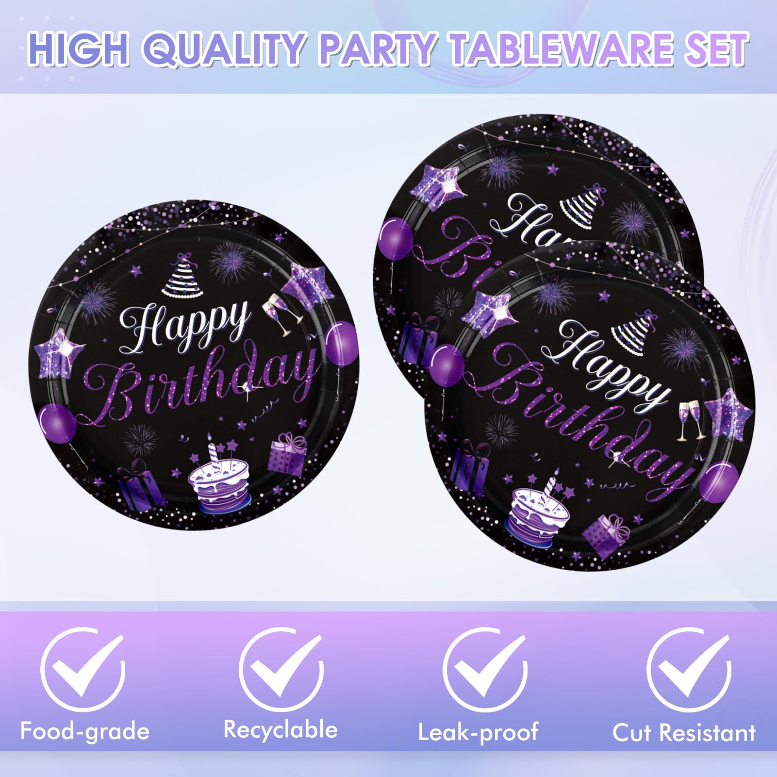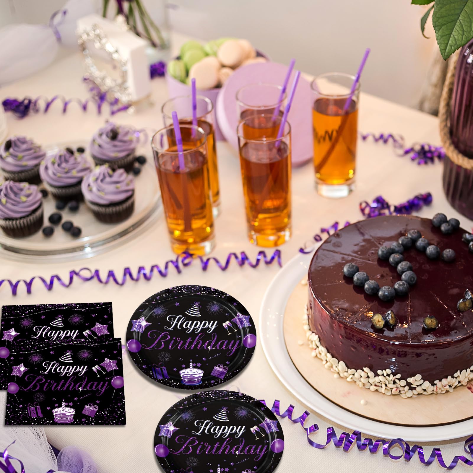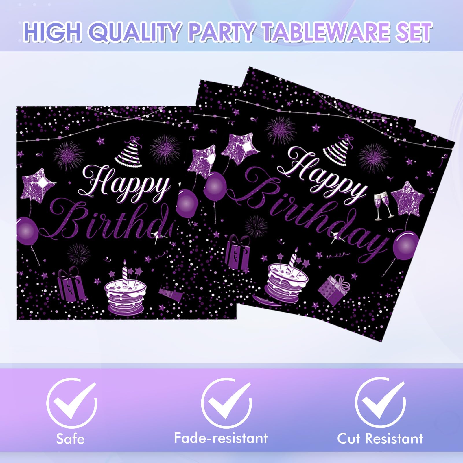 Unique Design:Purple and black party decorations are designed with exquisite and vibrant birthday patterns. The elegant purple and black are combined with rich birthday elements such as ribbons, balloons, cakes, etc. to create a very attractive visual experience. Your guests will be delighted by the visually appealing and lively design elements, and purple decorations for party will enhance the overall effect of your birthday celebration.