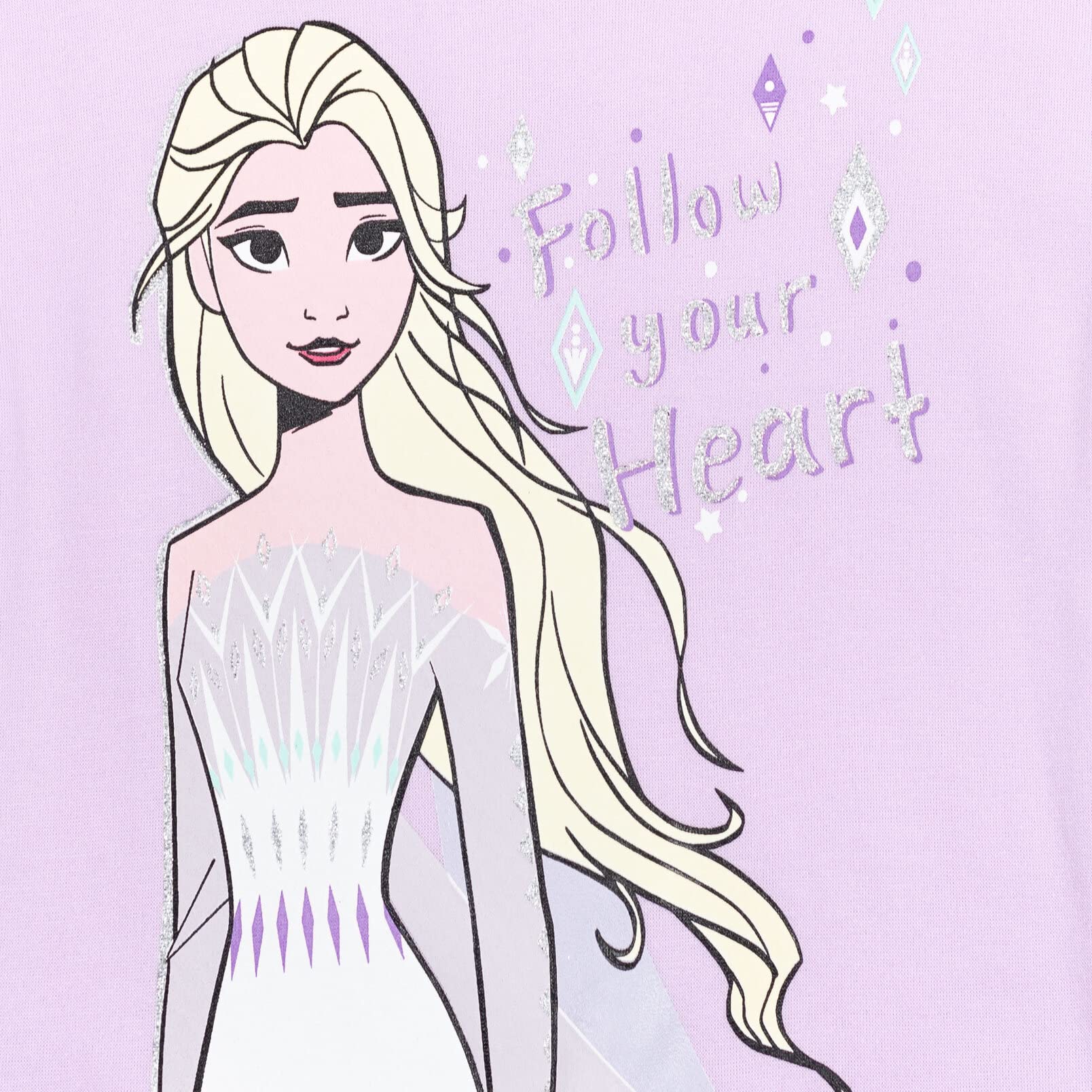 Featuring Queen Elsa in a white dress with the words "Follow Your Heart" in awesome screen print design with silver and purple glitter on top and blue, purple and white all-over diamond sparkle print on pants