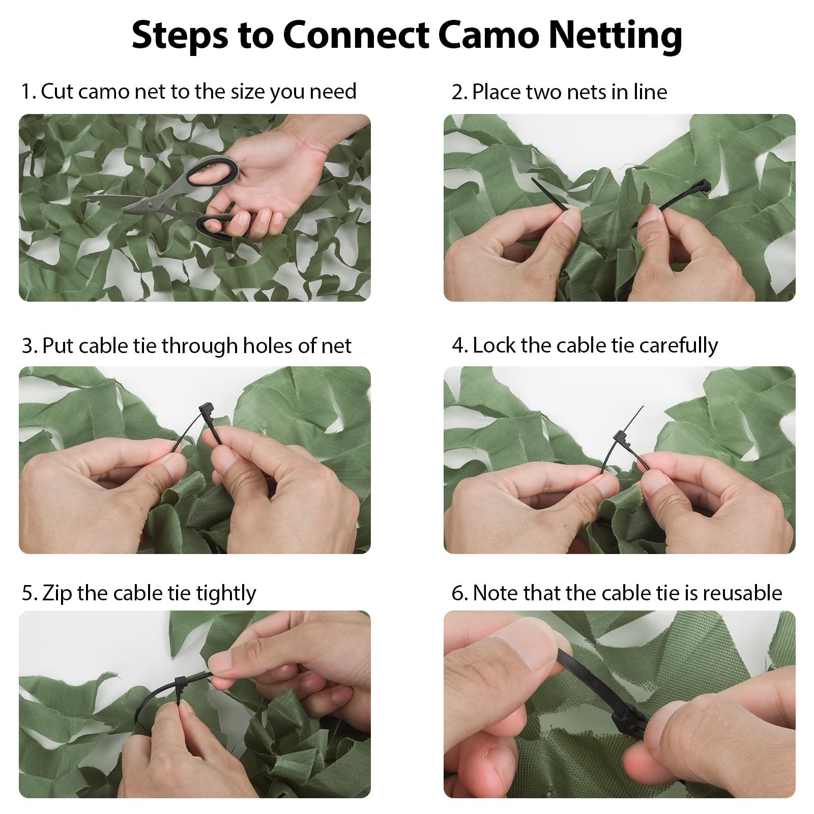Free Cutting: Camouflage netting can be easily cut to any size; you can use zip ties to fix it. Camo net can match with a variety of background colors, so you can observe the surrounding terrain well, providing maximum concealment in the field