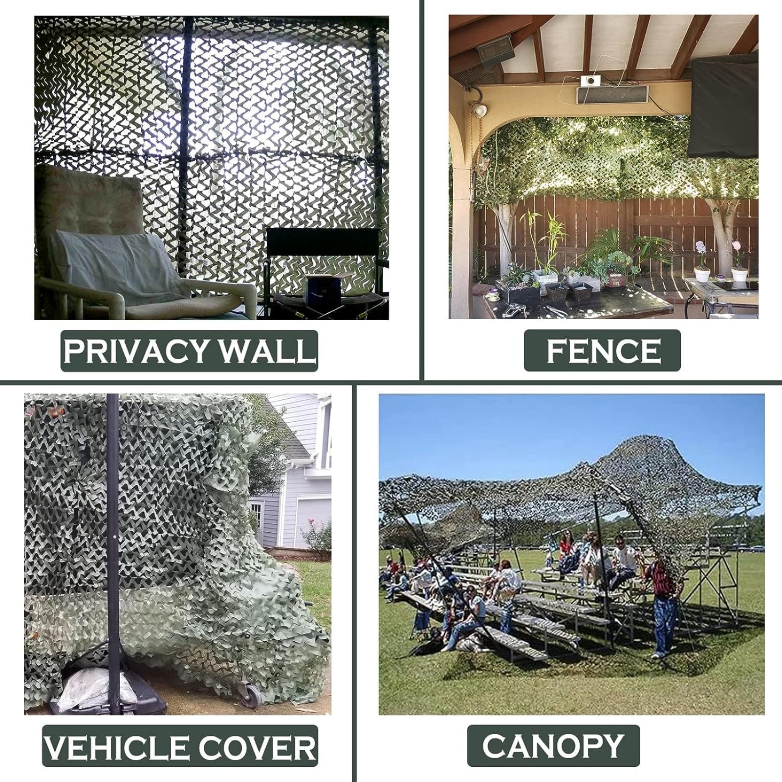 Applicable Scenarios: Camo netting comes in a variety of colors and sizes, perfect for jungle theme decorations,military party decorations, hunting, house decoration, fencing, roof shade, camping, movie sets, bird watching, CS games, camo car covering etc. You are only limited by your imagination