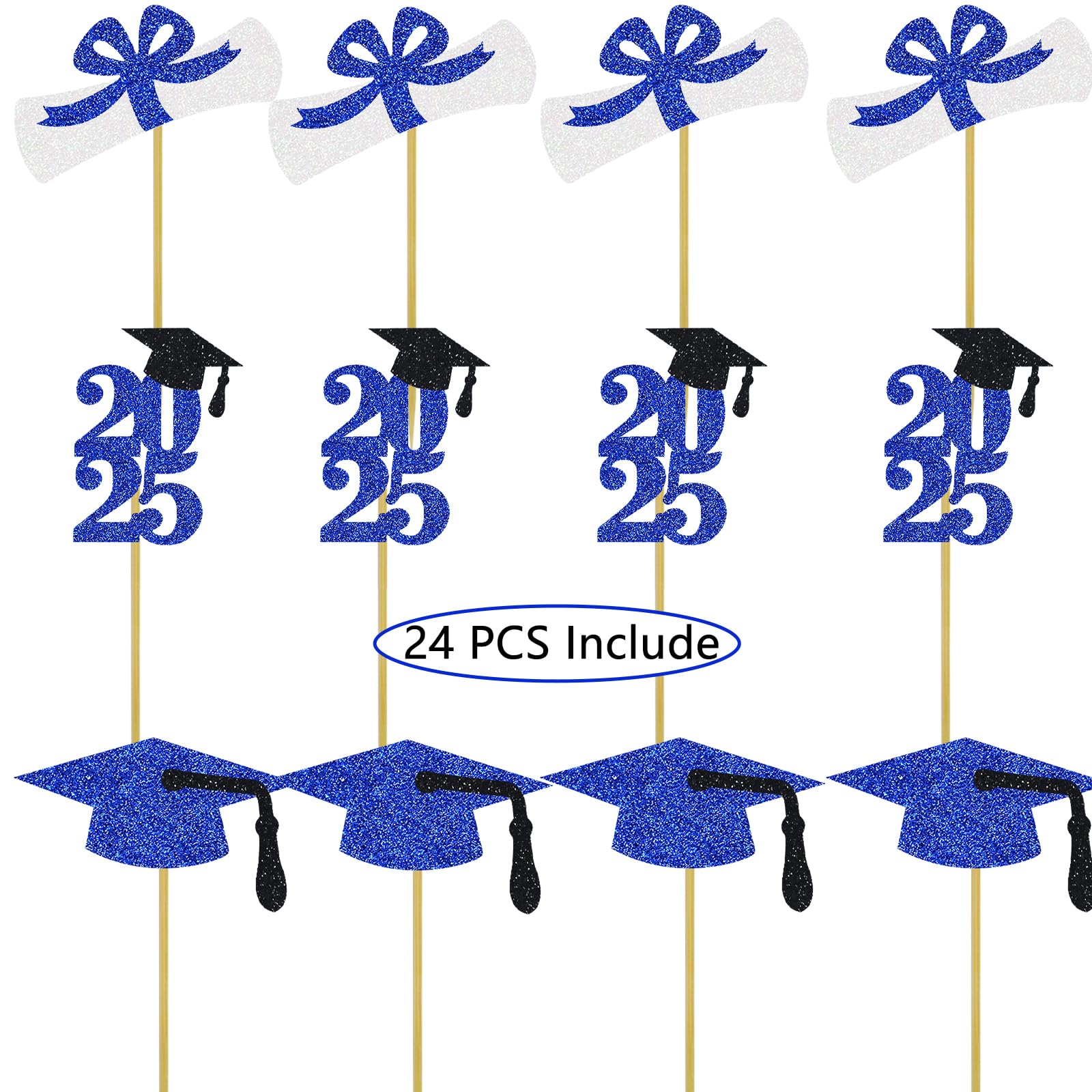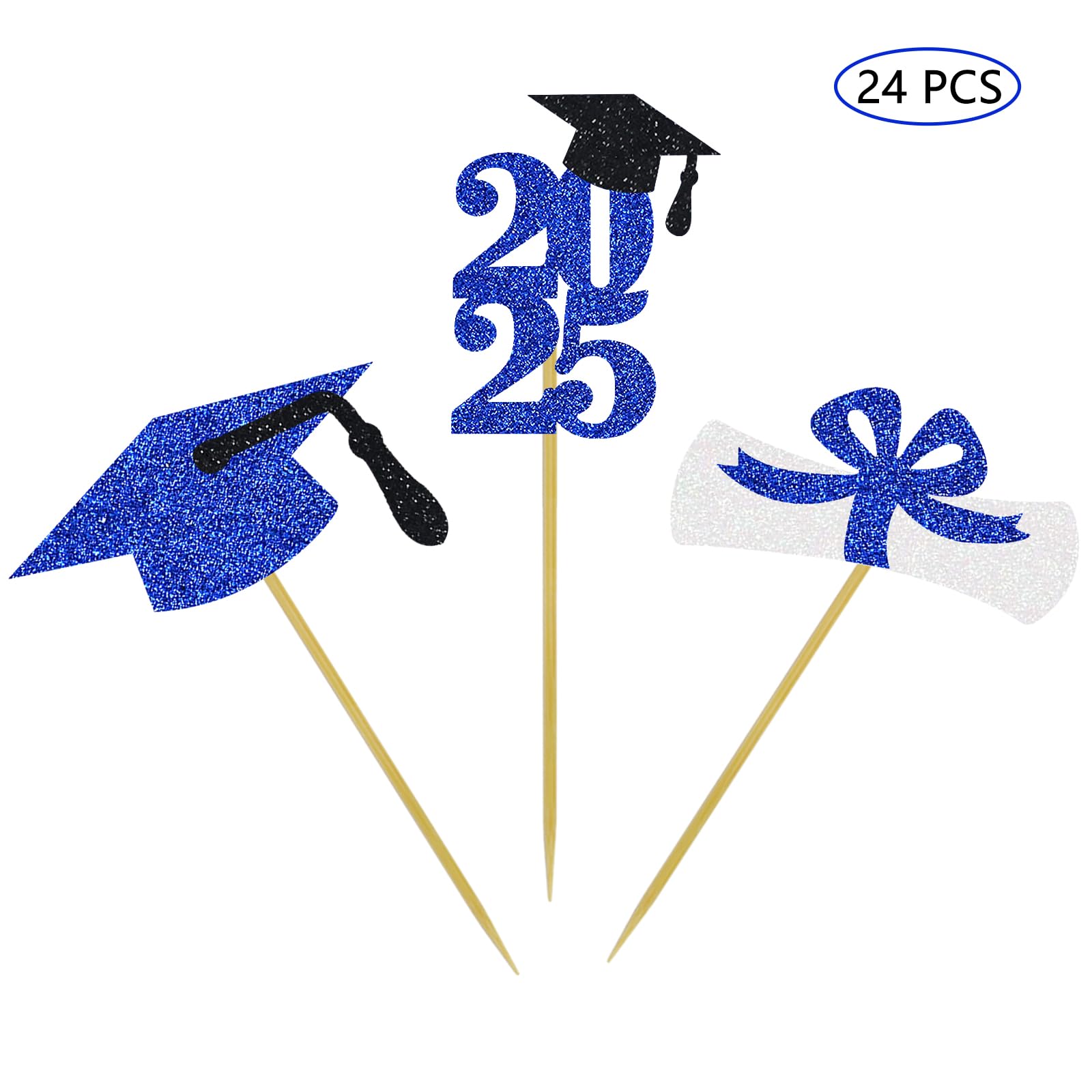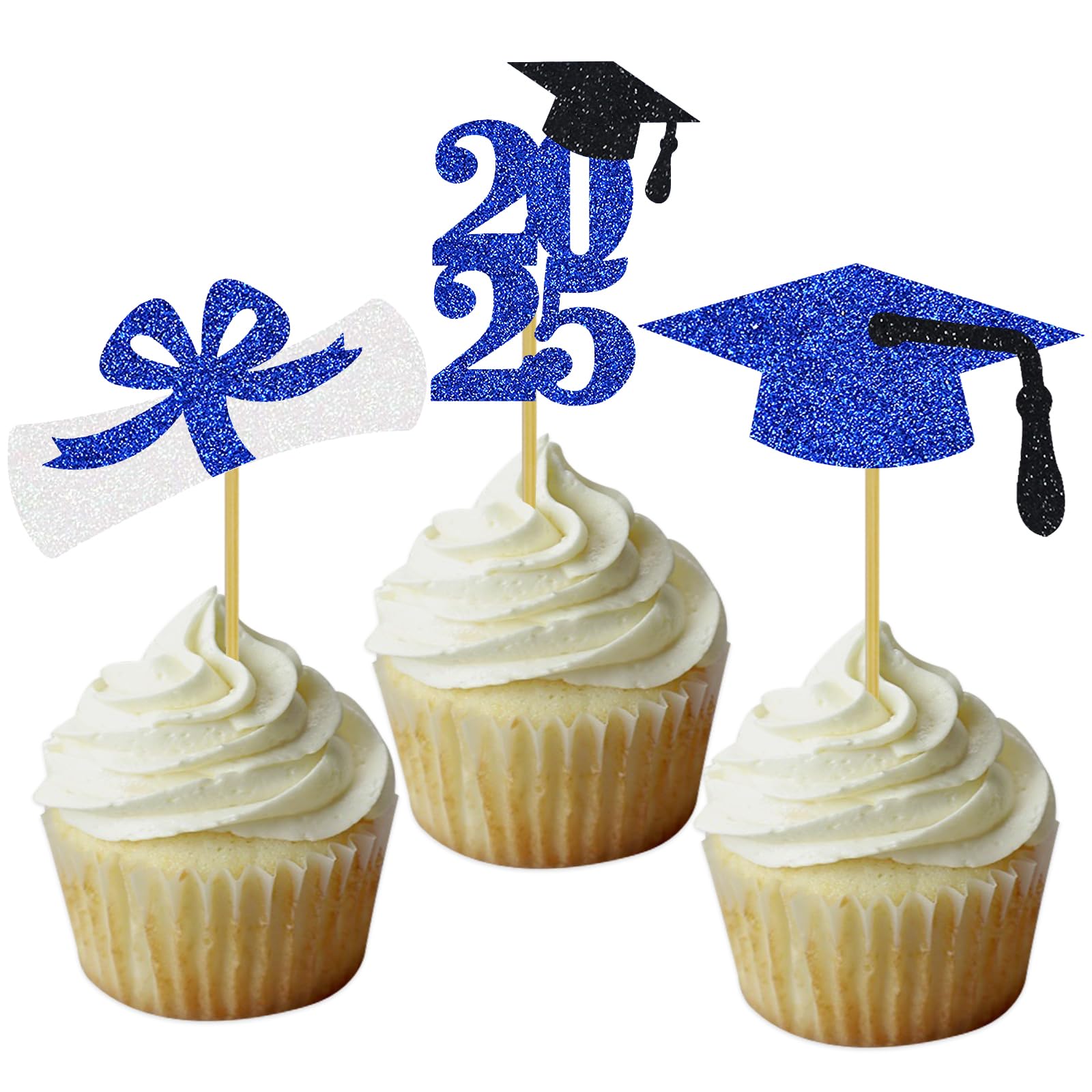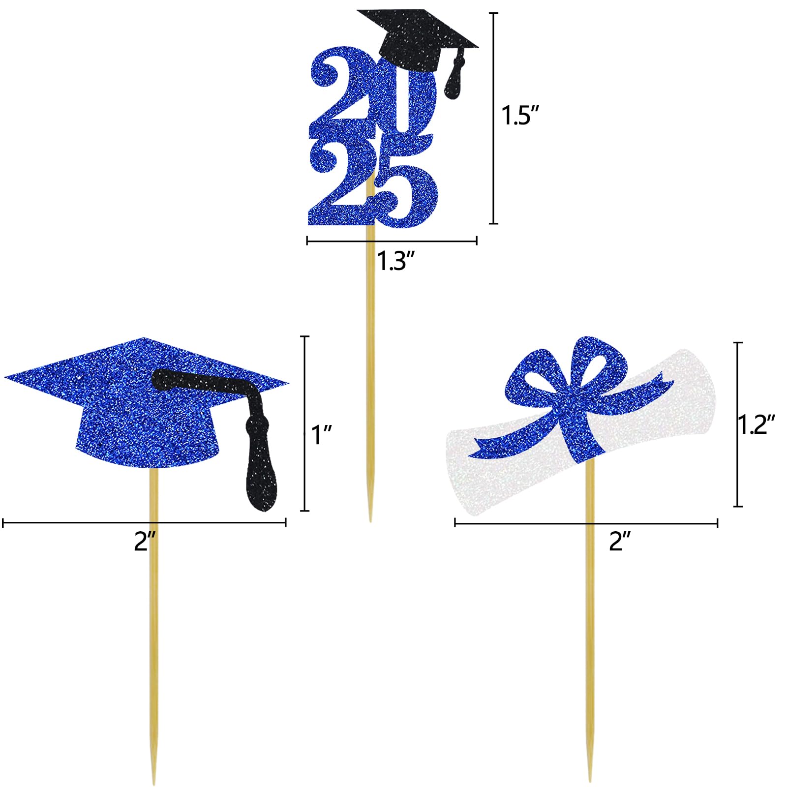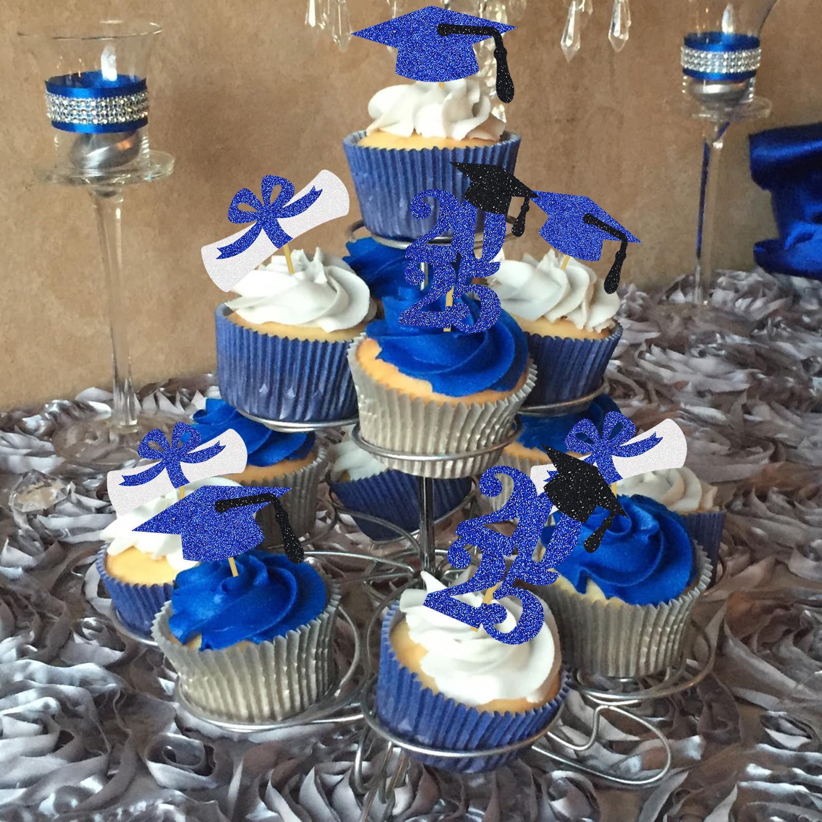 2025 graduation cap cupcake toppers: 8 pcs blue grad cap cupcake toppers with black tassel, 8 pcs blue 2025 number cupcake toppers, 8 pcs blue white diploma bow cupcake toppers