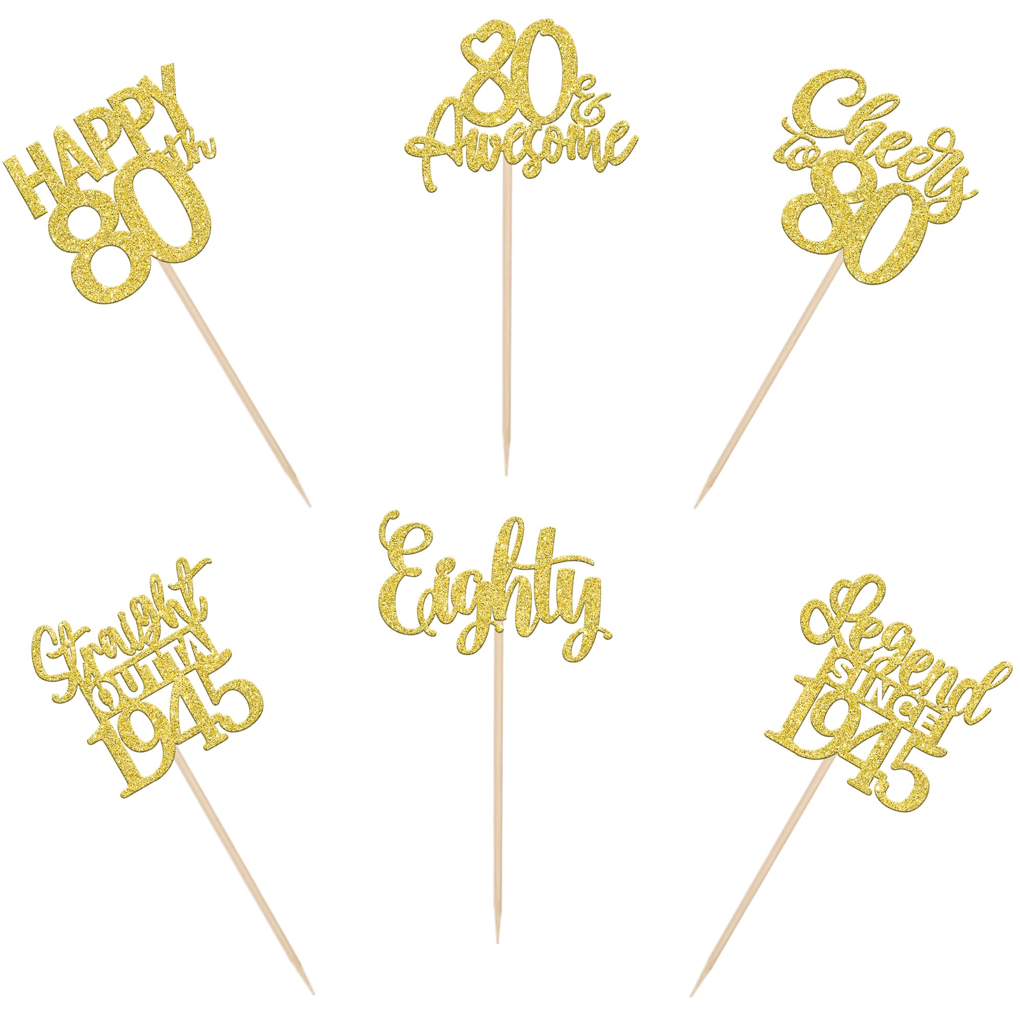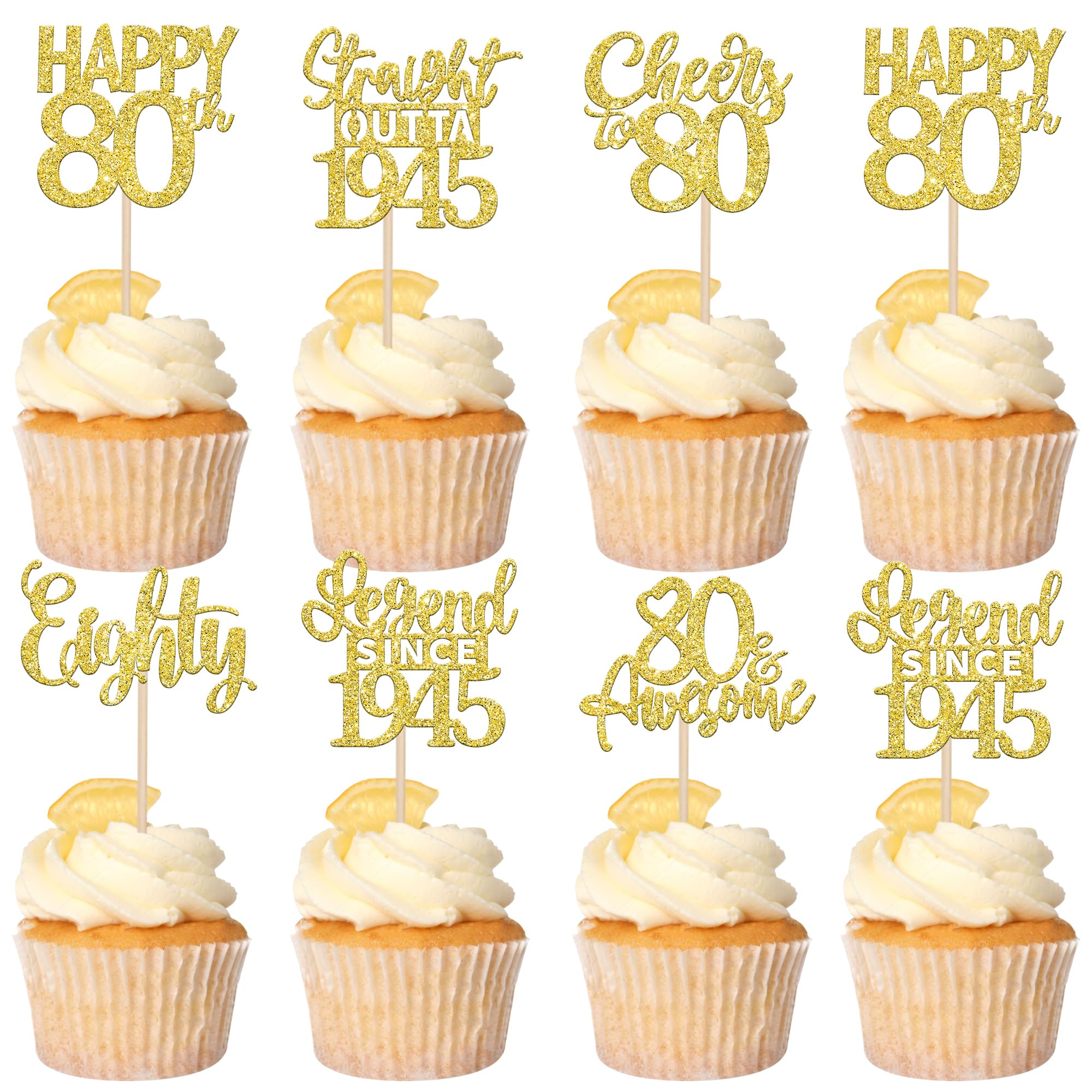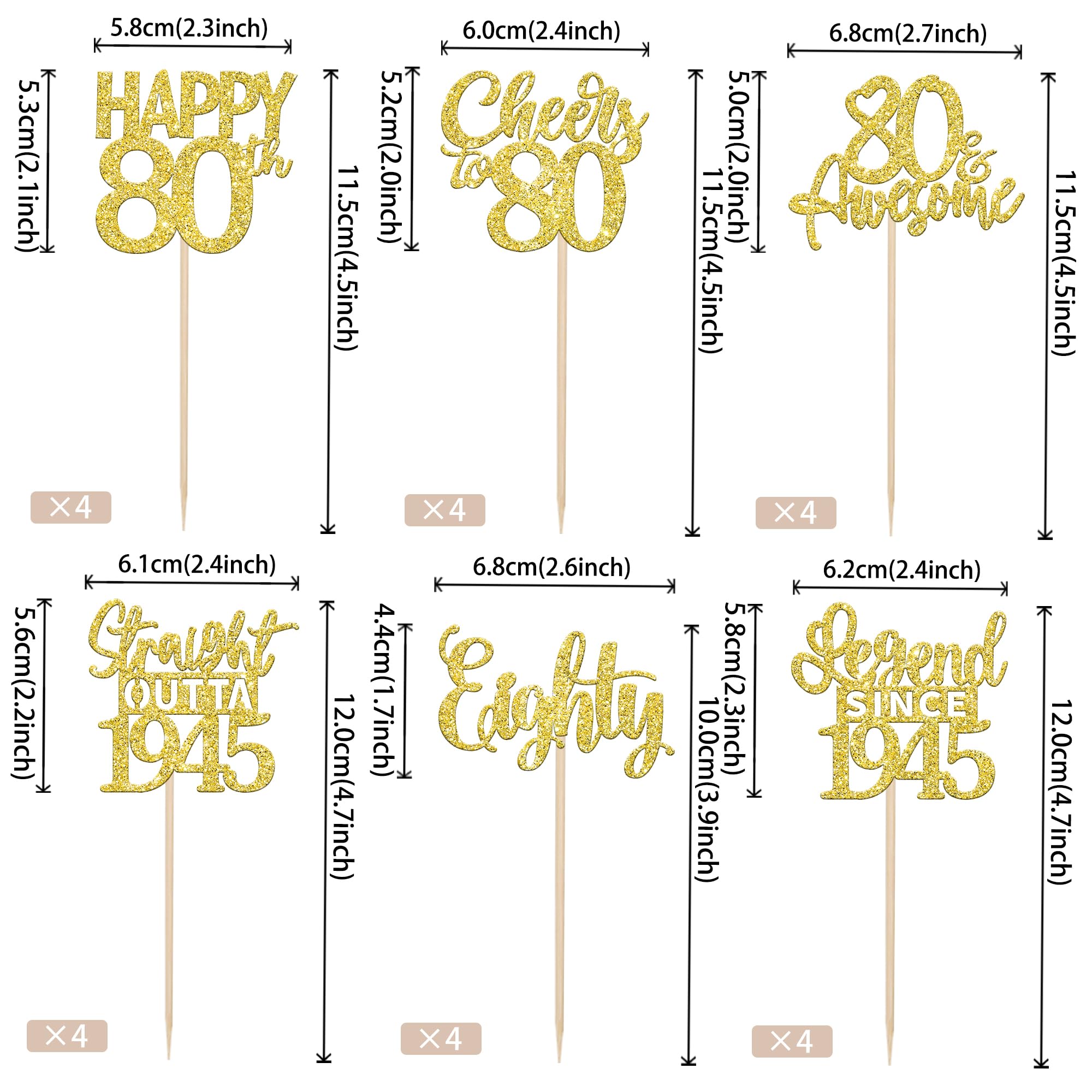 24PCS Happy 80th Birthday Cupcake Toppers Eighty Straight Outta 1945 Cupcake Picks Cheers to 80 Birthday Decorations Lengend Since 1945 Cupcake Decorations for 80th Birthday Anniversary Party Cake Decorations Supplies Perfect for legend since 1945 theme party, 80th anniversary theme party,cheers to 80 years theme party, 80 awesome theme party cupcake decorations supplies. Pack of 24 pcs,4 pcs of each design. The size is 2.3*4.5/ 2.4*4.5/ 2.7*4.5/ 2.4*4.7/ 2.6*3.9/ 2.4*4.7 inch ( with stick ) Made of high quality paper card stock,thick and sturdy. These straight outta 1945 cupcake toppers are one side glitter, another side is white, and they are intended for decoration only, please do not put them in oven or microwave. If the item you received has any defects, please contact us immediately.we will deal with it within 24 hours.