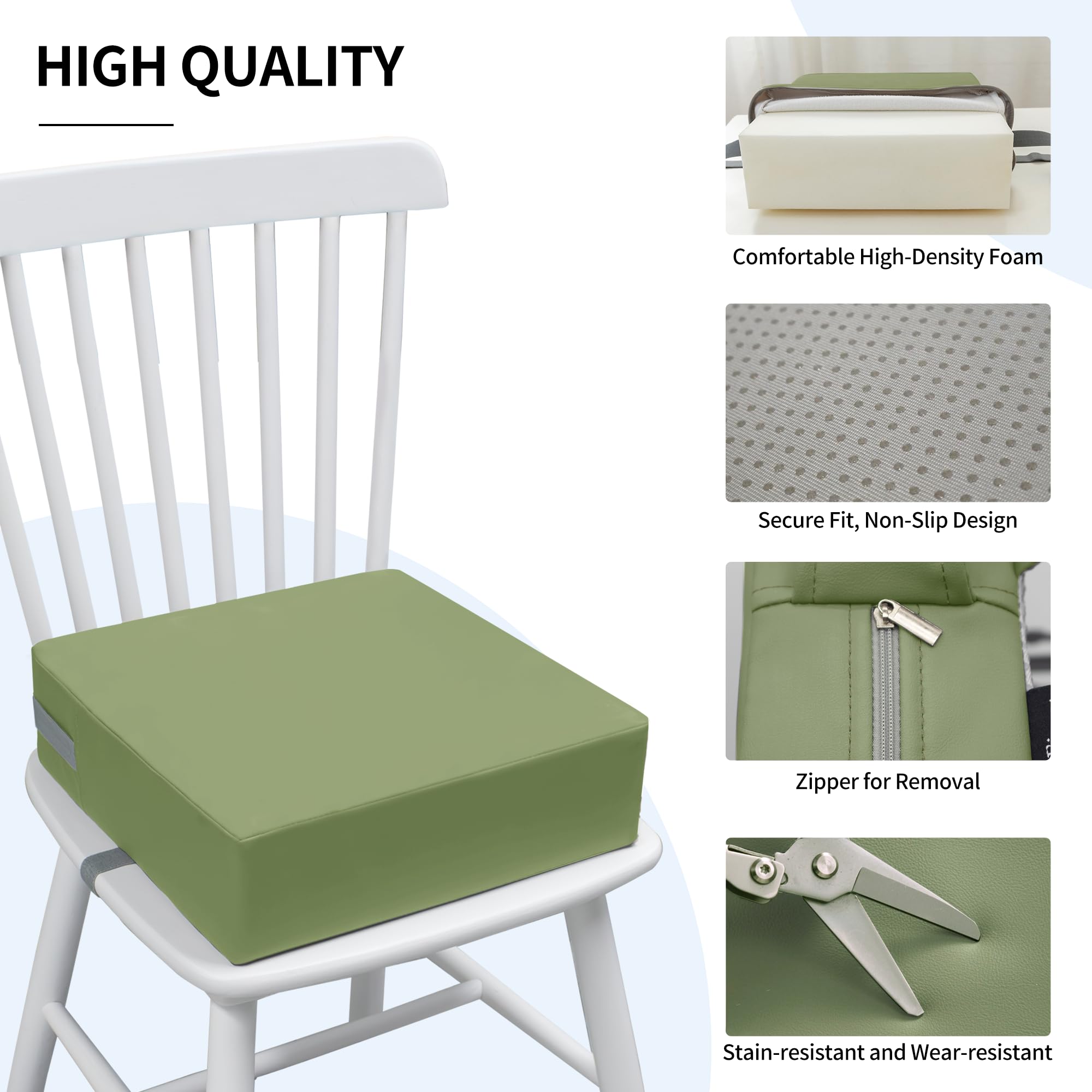 Waterproof and Durable: The surface of the table baby booster seat is made of high-quality waterproof PU leather, which is skin-friendly, waterproof, wear-resistant and wrinkle-resistant. If food accidentally falls on the booster pad, you can just wipe it with a damp paper towel to clean it. In addition, the booster pad has a zipper for easy removal and cleaning