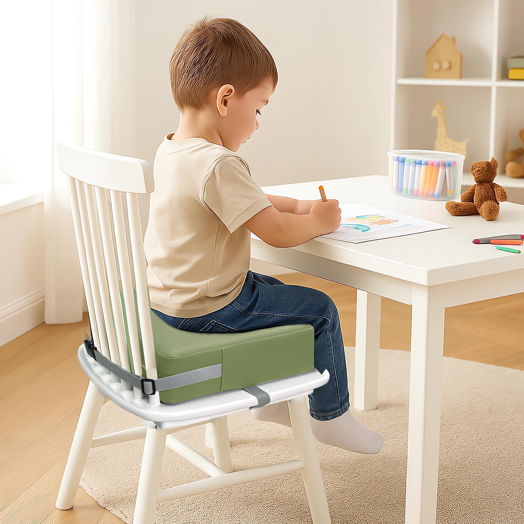 Safe and Anti-slip: Toddler booster seat for the dining table has two elastic safety belts on the seat cushion, which can be fixed on the backrest and bottom of chairs of various sizes, and the bottom of the seat cushion has non-slip silicone to ensure that the seat cushion will not slip. Double protection for children's safety while eating