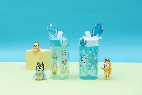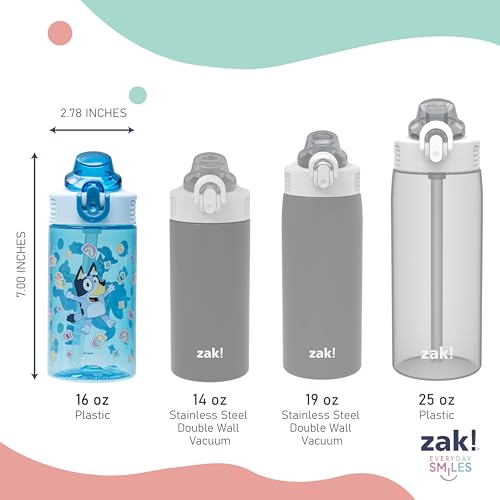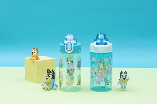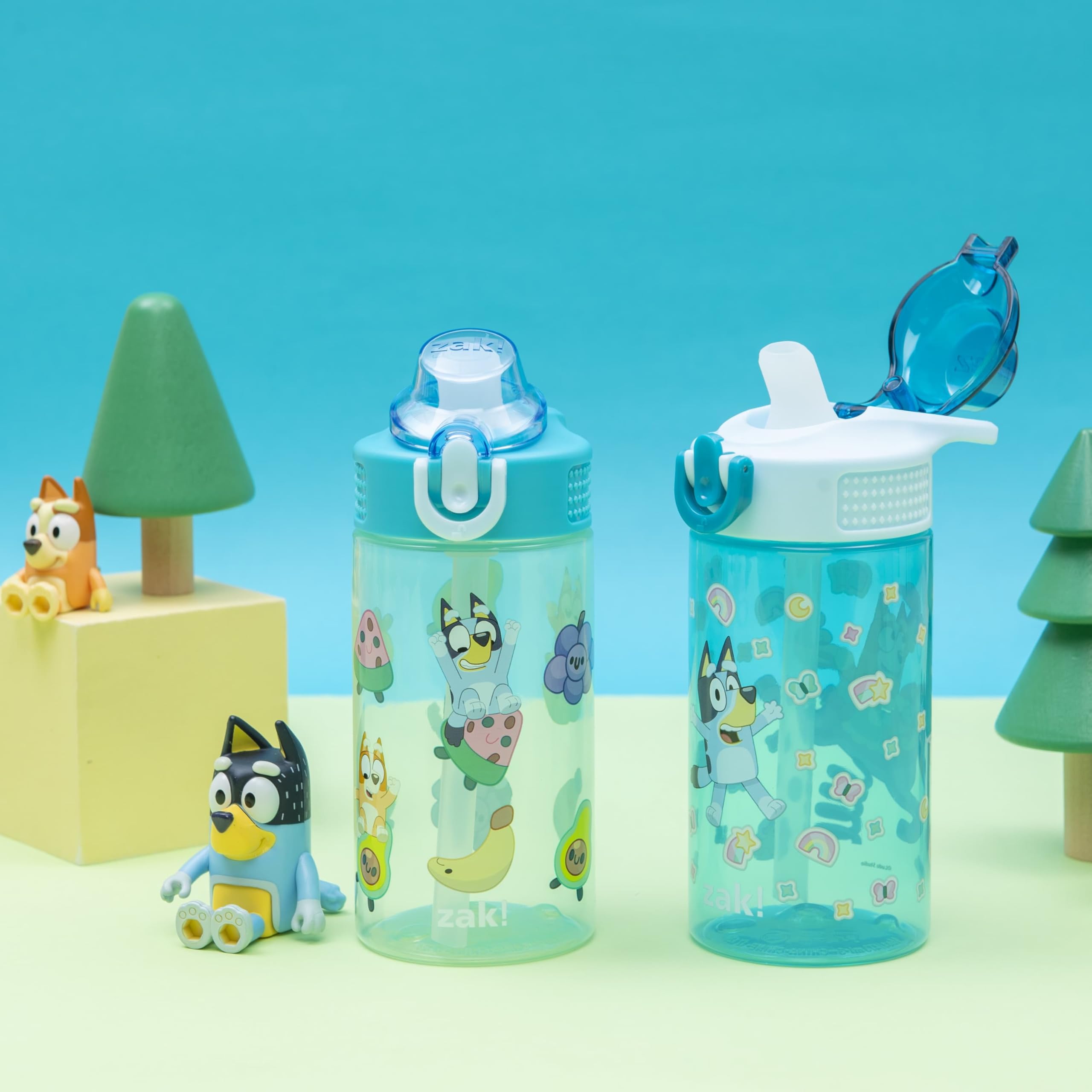 Let kids enjoy hydration with a fun Bluey water bottle set by zak! designs! Easy to Clean: The silicone spout and straw can be removed from the lid, and the pieces are dishwasher safe for simple cleanup at the end of the day. Reusable and Durable Material: Reusable water bottles will last wash after wash—good news for you and the environment! The 16 oz water bottles are made of PP plastic, durable enough for kids to use every day and bring on any adventure. Leak-Proof Lid: The lid screws on securely and won't leak when the spout is closed, though water flows for easy drinking when the spout is open. The easy-open button has a flip-up lock to keep it from activating accidentally. On the Go: The water bottle has a built-in carrying loop on the lid for easy transportation, and with the spout cover to keep the spout clean and closed, it can be tossed into a bag for worry-free travel. Specifications: Set of two water bottles with 16 oz capacity. Made of durable plastic. BPA-Free - zak! is committed to safety. Dishwasher safe, do not microwave. Length: 4.33-inch, Width: 2.78-inch, Height: 7-inch. Character: Bluey and Bingo (Bluey).