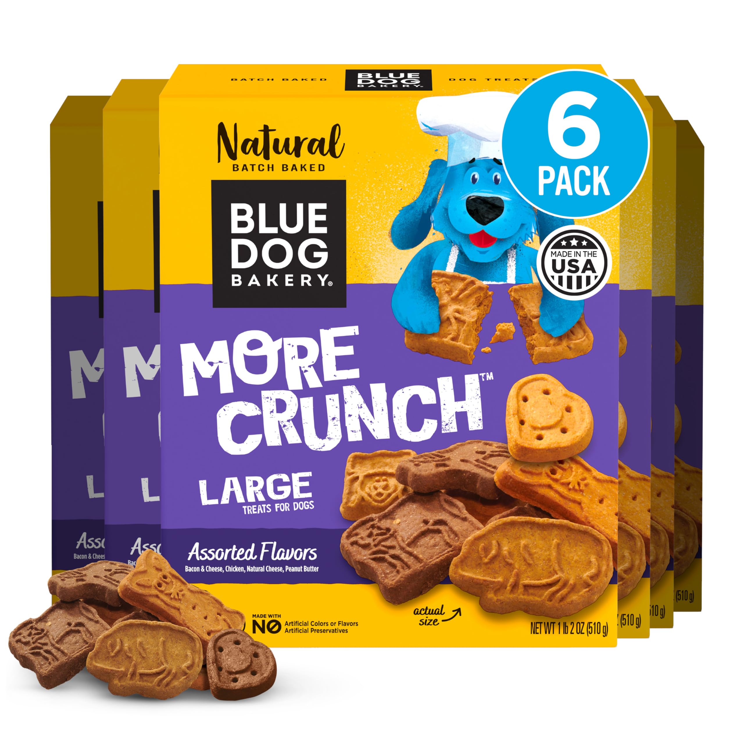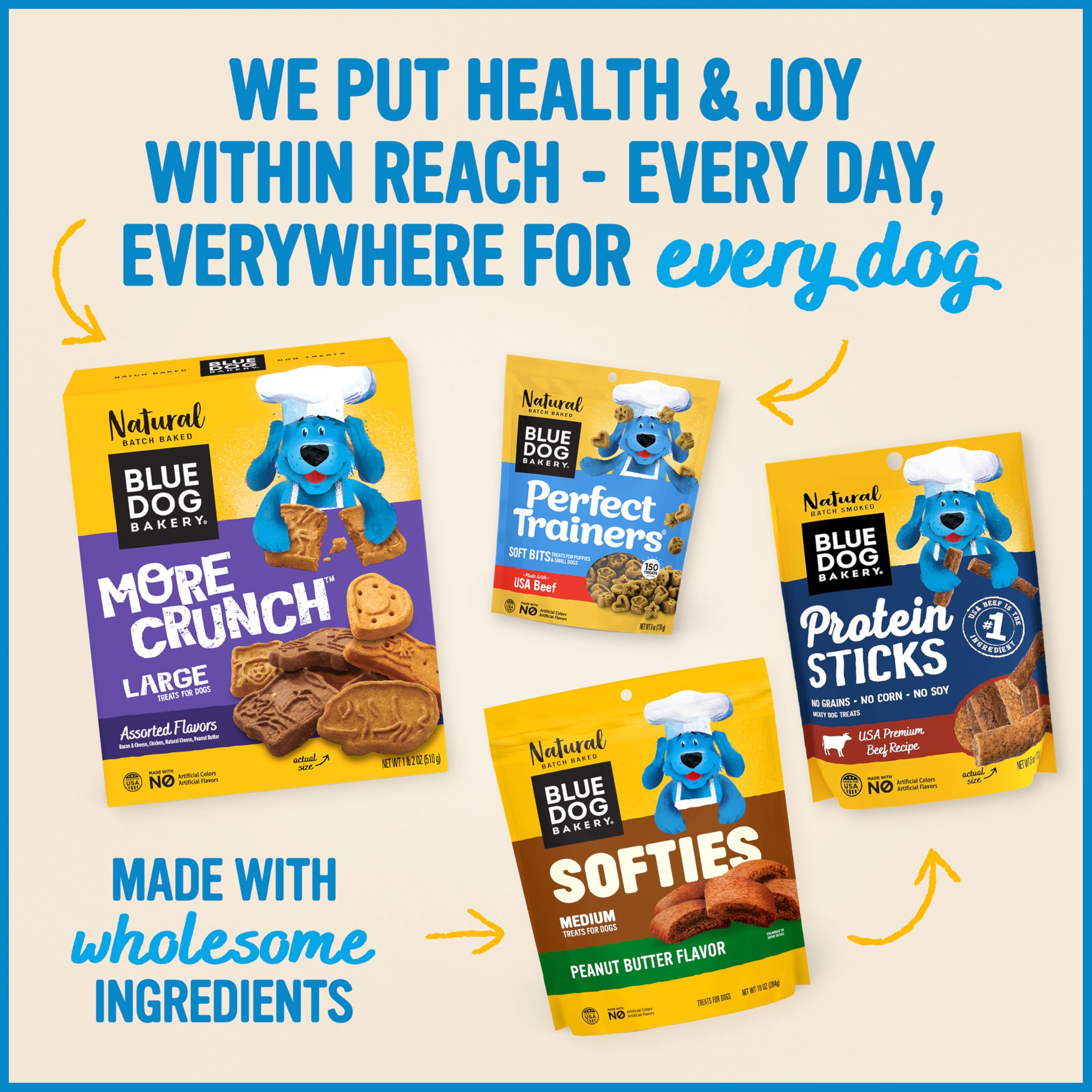 More Crunch treats are packed with healthy ingredients you can feel good about giving your best friend every day. These oven-baked biscuits deliver big crunch in a variety of fun shapes and flavors. Give them the joy they give you. Blue Dog Bakery bakery-fresh More Flavors include their original Peanut Butter & Molasses, Natural Cheese, Grilled Chicken, and Bacon & Cheese flavors. These treats are made with natural whole wheat, real eggs, and nonfat milk, which make them low-fat and easy to digest. While we trust our office dogs’ tail wags as positive indicators of good taste, we also personally taste-test all of our products before they go to market. Made with no additives or preservatives, you can rest easy knowing your dog is getting the best treat that all-natural ingredients can bake.