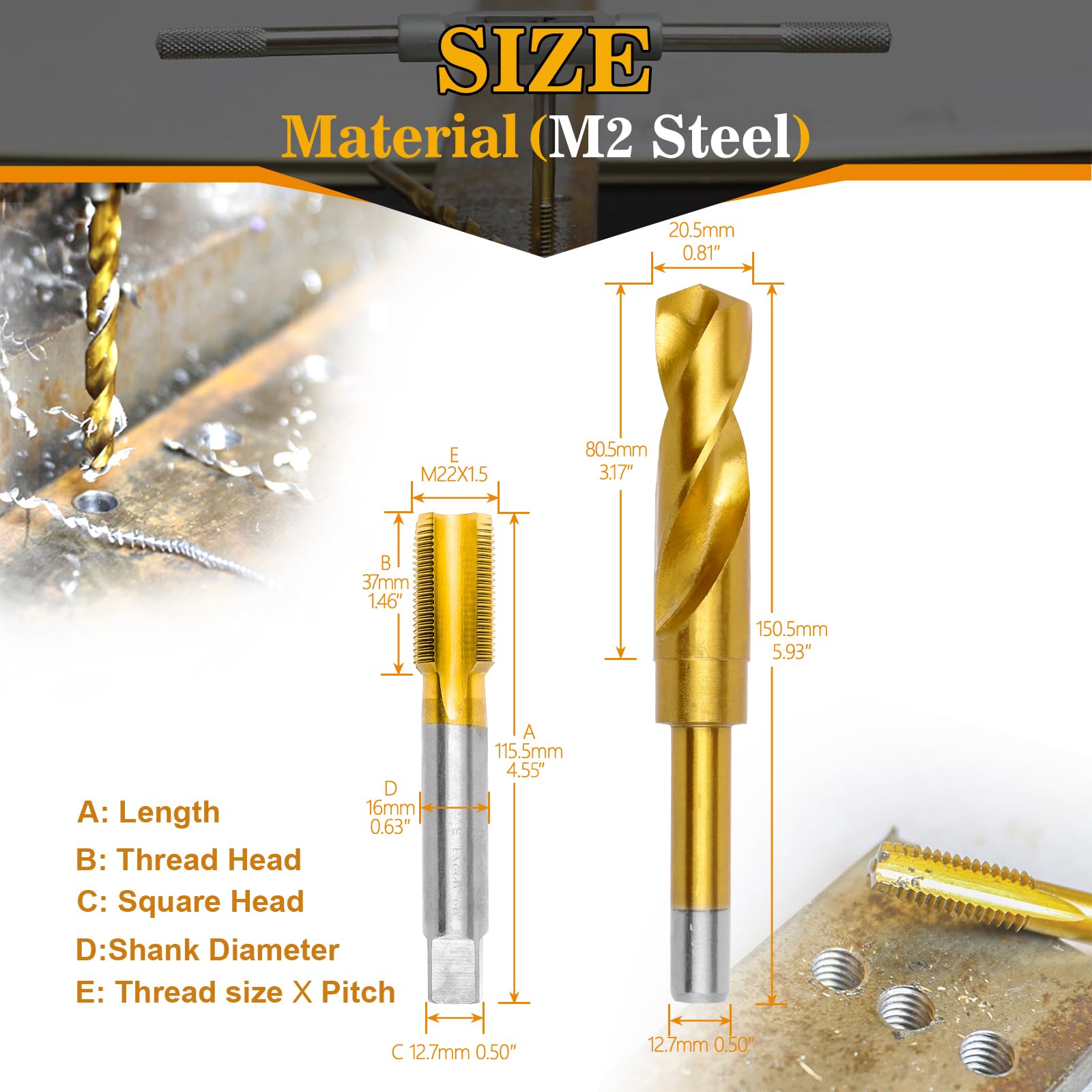 【Size】Include M22x1.5 M2 steel tap and 20.5mm M2 HSS drill bit with round shank,all stored in a storage box for easy carrying.