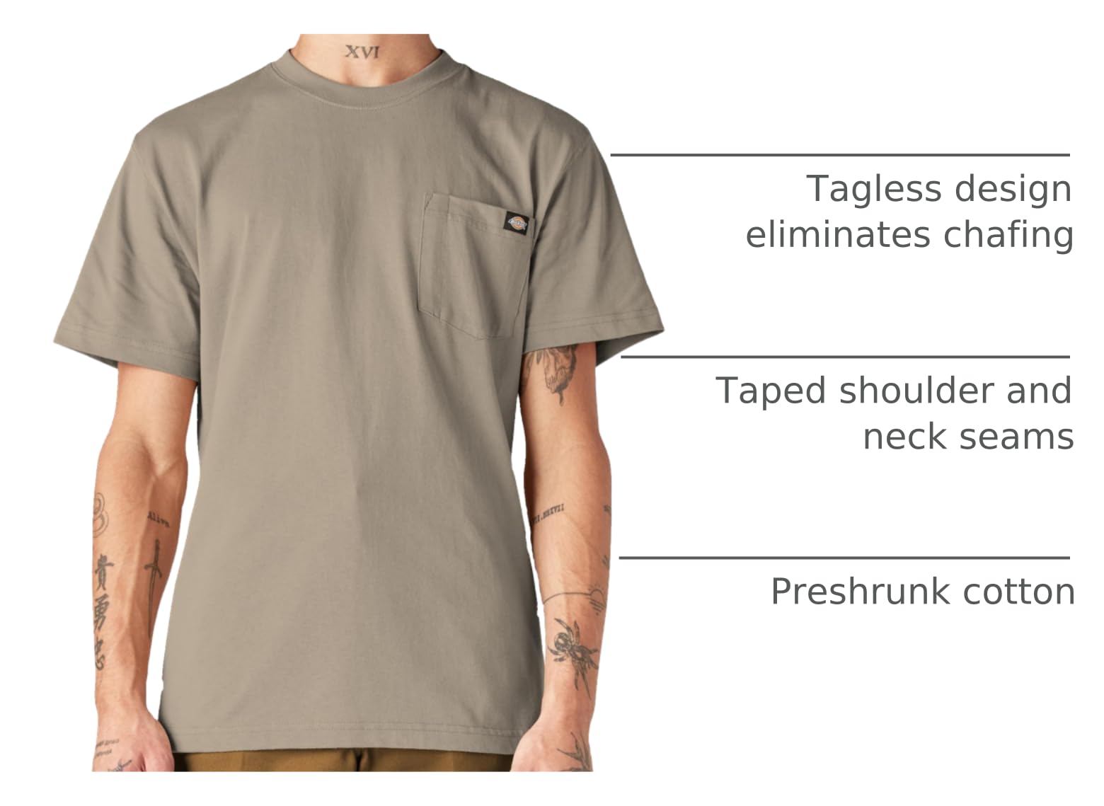 Description Hard-working men everywhere will be comfortable in the Dickies' Short sleeve heavyweight crew neck t-shirt. Made of a jersey knit material, this heavyweight cotton blend is durable, and designed with cotton comfort. On top of the fabric durability, The taped neck and shoulder seams up the ante on strength for longer wear.