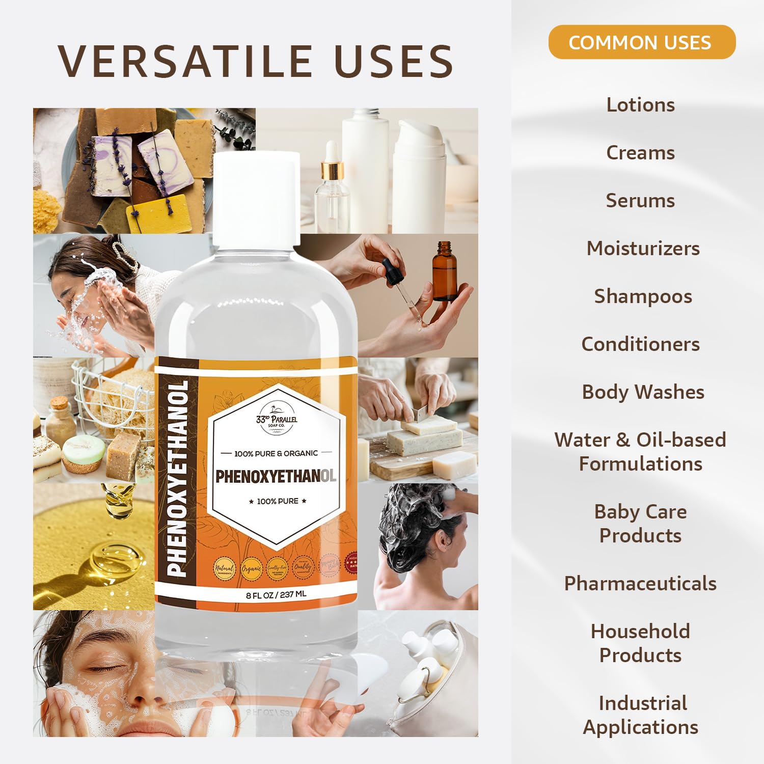 MULTIPLE USES: Phenoxyethanol preservative liquid is ideal for use in a variety of cosmetic products; lotions, creams, serums, moisturizers, shampoos, conditioners, body washes and other water & oil-based formulations. Also used in baby care products, pharmaceuticals, household products & industrial applications.